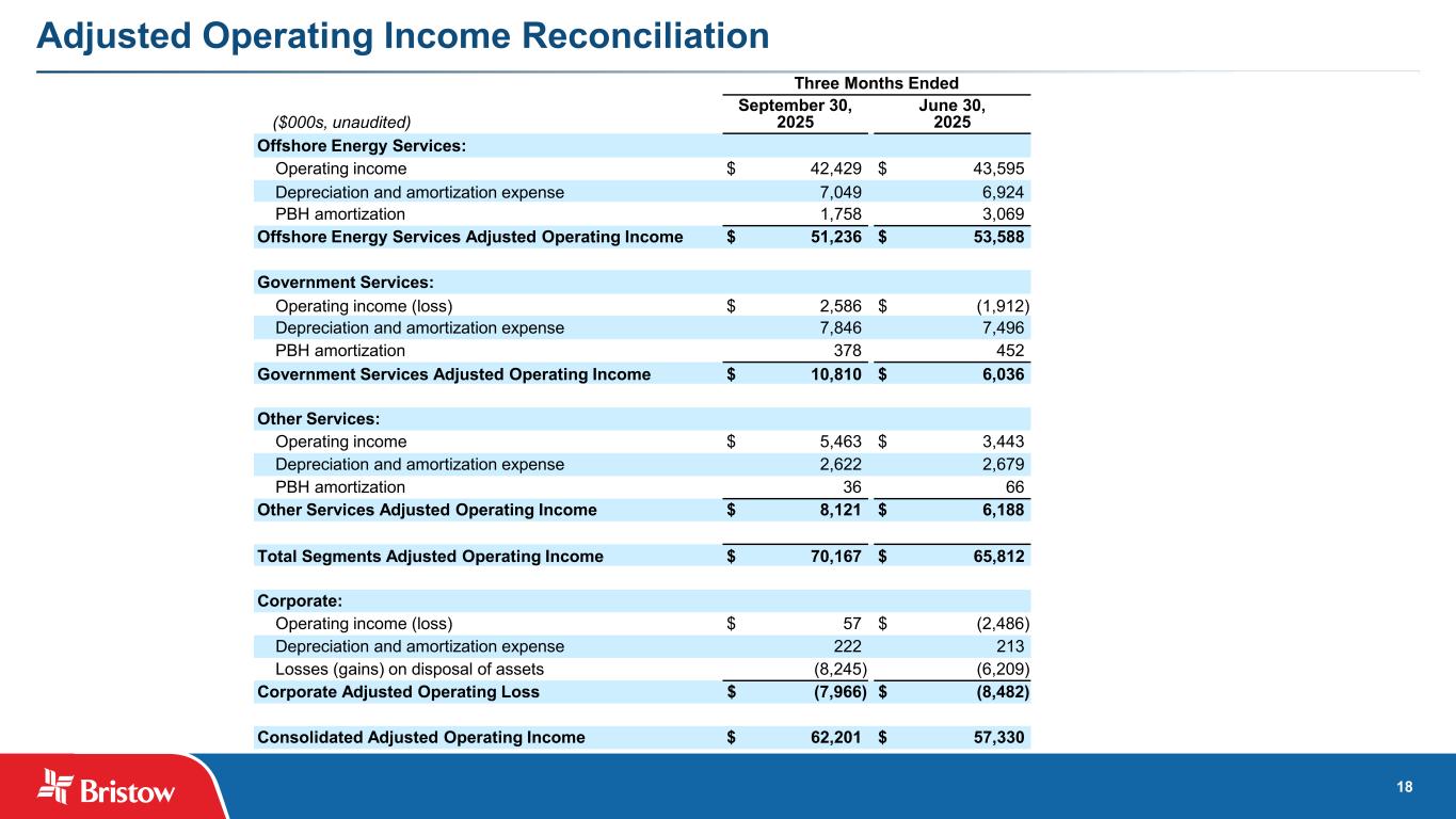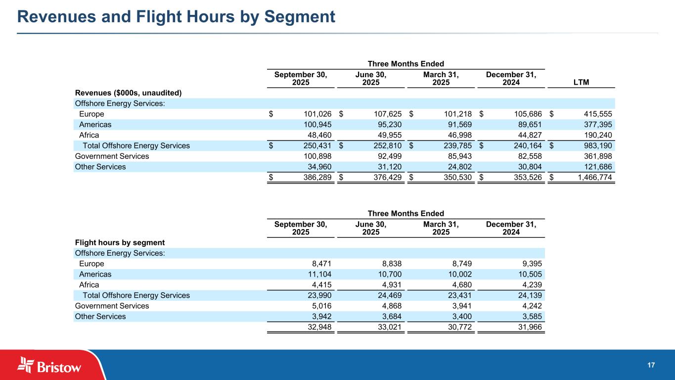 17 Revenues and Flight Hours by Segment Three Months Ended September 30, 2025 June 30, 2025 March 31, 2025 December 31, 2024 LTM Revenues ($000s, unaudited) Offshore Energy Services: Europe $ 101,026 $ 107,625 $ 101,218 $ 105,686 $ 415,555 Americas 100,945 95,230 91,569 89,651 377,395 Africa 48,460 49,955 46,998 44,827 190,240 Total Offshore Energy Services $ 250,431 $ 252,810 $ 239,785 $ 240,164 $ 983,190 Government Services 100,898 92,499 85,943 82,558 361,898 Other Services 34,960 31,120 24,802 30,804 121,686 $ 386,289 $ 376,429 $ 350,530 $ 353,526 $ 1,466,774 Three Months Ended September 30, 2025 June 30, 2025 March 31, 2025 December 31, 2024 Flight hours by segment Offshore Energy Services: Europe 8,471 8,838 8,749 9,395 Americas 11,104 10,700 10,002 10,505 Africa 4,415 4,931 4,680 4,239 Total Offshore Energy Services 23,990 24,469 23,431 24,139 Government Services 5,016 4,868 3,941 4,242 Other Services 3,942 3,684 3,400 3,585 32,948 33,021 30,772 31,966