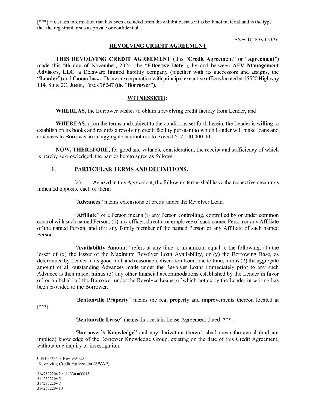 [***] = Certain information that has been excluded from the exhibit because it is both not material and is the type that the registrant treats as private or confidential. EXECUTION COPY OFB 3/29/18 Rev 9/2022 Revolving Credit Agreement (SWAP) 314257220v.2 / 111330.000015 314257220v.5 314257220v.7 314257220v.10 REVOLVING CREDIT AGREEMENT THIS REVOLVING CREDIT AGREEMENT (this “Credit Agreement” or “Agreement”) made this 5th day of November, 2024 (the “Effective Date”), by and between AFV Management Advisors, LLC, a Delaware limited liability company (together with its successors and assigns, the “Lender”) and Canoo Inc., a Delaware corporation with principal executive offices located at 15520 Highway 114, Suite 2C, Justin, Texas 76247 (the “Borrower”). WITNESSETH: WHEREAS, the Borrower wishes to obtain a revolving credit facility from Lender, and WHEREAS, upon the terms and subject to the conditions set forth herein, the Lender is willing to establish on its books and records a revolving credit facility pursuant to which Lender will make loans and advances to Borrower in an aggregate amount not to exceed $12,000,000.00. NOW, THEREFORE, for good and valuable consideration, the receipt and sufficiency of which is hereby acknowledged, the parties hereto agree as follows: 1. PARTICULAR TERMS AND DEFINITIONS. (a) As used in this Agreement, the following terms shall have the respective meanings indicated opposite each of them: “Advances” means extensions of credit under the Revolver Loan. “Affiliate” of a Person means (i) any Person controlling, controlled by or under common control with such named Person; (ii) any officer, director or employee of such named Person or any Affiliate of the named Person; and (iii) any family member of the named Person or any Affiliate of such named Person. “Availability Amount” refers at any time to an amount equal to the following: (1) the lesser of (x) the lesser of the Maximum Revolver Loan Availability, or (y) the Borrowing Base, as determined by Lender in its good faith and reasonable discretion from time to time; minus (2) the aggregate amount of all outstanding Advances made under the Revolver Loans immediately prior to any such Advance is then made, minus (3) any other financial accommodations established by the Lender in favor of, or on behalf of, the Borrower under the Revolver Loans, of which notice by the Lender in writing has been provided to the Borrower. “Bentonville Property” means the real property and improvements thereon located at [***]. “Bentonville Lease” means that certain Lease Agreement dated [***]. “Borrower’s Knowledge” and any derivation thereof, shall mean the actual (and not implied) knowledge of the Borrower Knowledge Group, existing on the date of this Credit Agreement, without due inquiry or investigation.