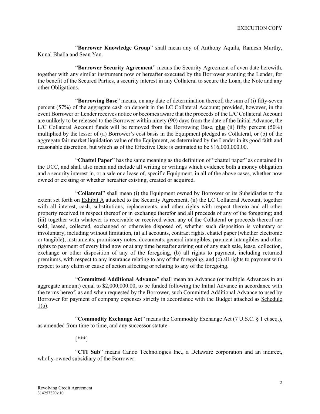 EXECUTION COPY 2 Revolving Credit Agreement 314257220v.10 “Borrower Knowledge Group” shall mean any of Anthony Aquila, Ramesh Murthy, Kunal Bhalla and Sean Yan. “Borrower Security Agreement” means the Security Agreement of even date herewith, together with any similar instrument now or hereafter executed by the Borrower granting the Lender, for the benefit of the Secured Parties, a security interest in any Collateral to secure the Loan, the Note and any other Obligations. “Borrowing Base” means, on any date of determination thereof, the sum of (i) fifty-seven percent (57%) of the aggregate cash on deposit in the LC Collateral Account; provided, however, in the event Borrower or Lender receives notice or becomes aware that the proceeds of the L/C Collateral Account are unlikely to be released to the Borrower within ninety (90) days from the date of the Initial Advance, the L/C Collateral Account funds will be removed from the Borrowing Base, plus (ii) fifty percent (50%) multiplied by the lesser of (a) Borrower’s cost basis in the Equipment pledged as Collateral, or (b) of the aggregate fair market liquidation value of the Equipment, as determined by the Lender in its good faith and reasonable discretion, but which as of the Effective Date is estimated to be $16,000,000.00. “Chattel Paper” has the same meaning as the definition of “chattel paper” as contained in the UCC, and shall also mean and include all writing or writings which evidence both a money obligation and a security interest in, or a sale or a lease of, specific Equipment, in all of the above cases, whether now owned or existing or whether hereafter existing, created or acquired. “Collateral” shall mean (i) the Equipment owned by Borrower or its Subsidiaries to the extent set forth on Exhibit A attached to the Security Agreement, (ii) the LC Collateral Account, together with all interest, cash, substitutions, replacements, and other rights with respect thereto and all other property received in respect thereof or in exchange therefor and all proceeds of any of the foregoing; and (iii) together with whatever is receivable or received when any of the Collateral or proceeds thereof are sold, leased, collected, exchanged or otherwise disposed of, whether such disposition is voluntary or involuntary, including without limitation, (a) all accounts, contract rights, chattel paper (whether electronic or tangible), instruments, promissory notes, documents, general intangibles, payment intangibles and other rights to payment of every kind now or at any time hereafter arising out of any such sale, lease, collection, exchange or other disposition of any of the foregoing, (b) all rights to payment, including returned premiums, with respect to any insurance relating to any of the foregoing, and (c) all rights to payment with respect to any claim or cause of action affecting or relating to any of the foregoing. “Committed Additional Advance” shall mean an Advance (or multiple Advances in an aggregate amount) equal to $2,000,000.00, to be funded following the Initial Advance in accordance with the terms hereof, as and when requested by the Borrower, such Committed Additional Advance to used by Borrower for payment of company expenses strictly in accordance with the Budget attached as Schedule 1(a). “Commodity Exchange Act” means the Commodity Exchange Act (7 U.S.C. § 1 et seq.), as amended from time to time, and any successor statute. [***] “CTI Sub” means Canoo Technologies Inc., a Delaware corporation and an indirect, wholly-owned subsidiary of the Borrower.