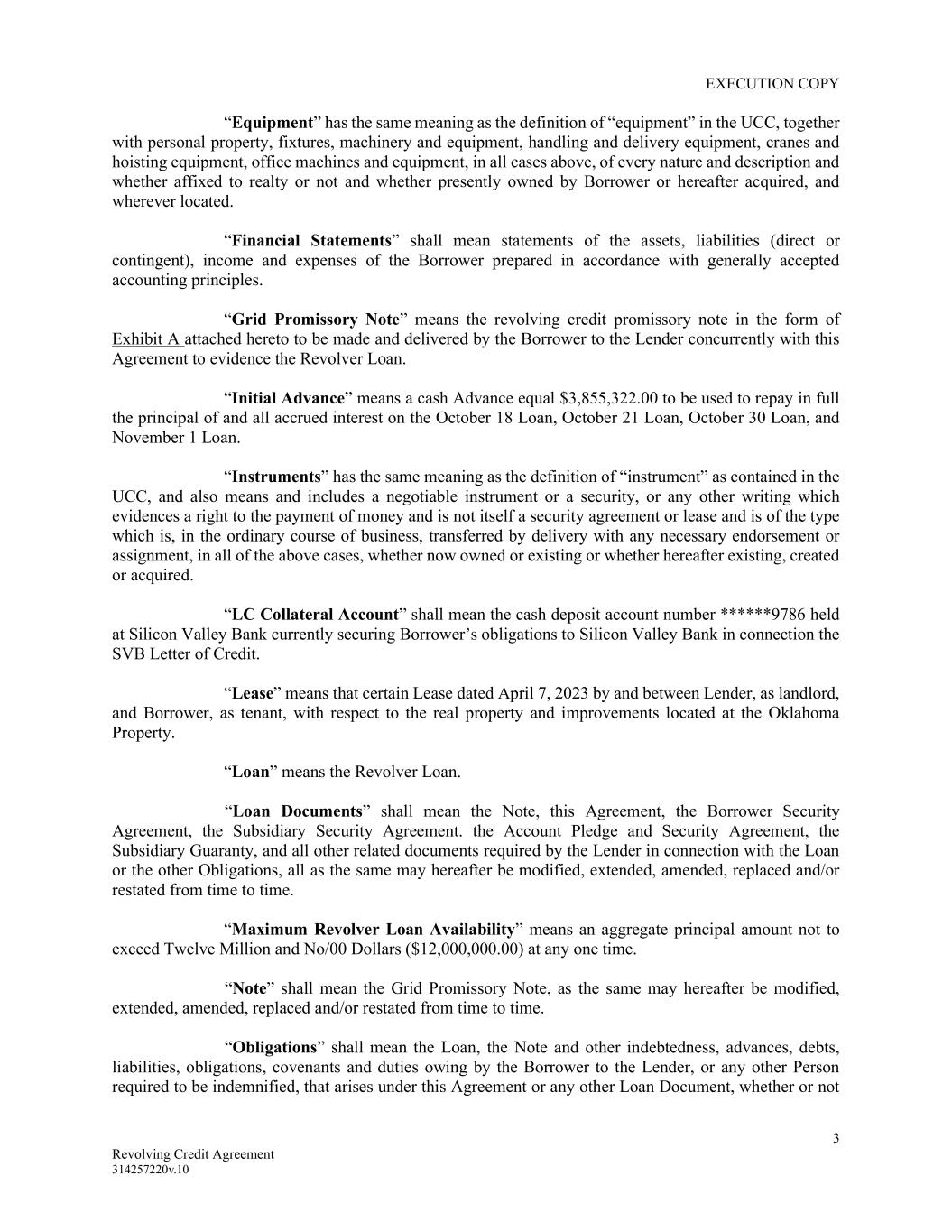 EXECUTION COPY 3 Revolving Credit Agreement 314257220v.10 “Equipment” has the same meaning as the definition of “equipment” in the UCC, together with personal property, fixtures, machinery and equipment, handling and delivery equipment, cranes and hoisting equipment, office machines and equipment, in all cases above, of every nature and description and whether affixed to realty or not and whether presently owned by Borrower or hereafter acquired, and wherever located. “Financial Statements” shall mean statements of the assets, liabilities (direct or contingent), income and expenses of the Borrower prepared in accordance with generally accepted accounting principles. “Grid Promissory Note” means the revolving credit promissory note in the form of Exhibit A attached hereto to be made and delivered by the Borrower to the Lender concurrently with this Agreement to evidence the Revolver Loan. “Initial Advance” means a cash Advance equal $3,855,322.00 to be used to repay in full the principal of and all accrued interest on the October 18 Loan, October 21 Loan, October 30 Loan, and November 1 Loan. “Instruments” has the same meaning as the definition of “instrument” as contained in the UCC, and also means and includes a negotiable instrument or a security, or any other writing which evidences a right to the payment of money and is not itself a security agreement or lease and is of the type which is, in the ordinary course of business, transferred by delivery with any necessary endorsement or assignment, in all of the above cases, whether now owned or existing or whether hereafter existing, created or acquired. “LC Collateral Account” shall mean the cash deposit account number ******9786 held at Silicon Valley Bank currently securing Borrower’s obligations to Silicon Valley Bank in connection the SVB Letter of Credit. “Lease” means that certain Lease dated April 7, 2023 by and between Lender, as landlord, and Borrower, as tenant, with respect to the real property and improvements located at the Oklahoma Property. “Loan” means the Revolver Loan. “Loan Documents” shall mean the Note, this Agreement, the Borrower Security Agreement, the Subsidiary Security Agreement. the Account Pledge and Security Agreement, the Subsidiary Guaranty, and all other related documents required by the Lender in connection with the Loan or the other Obligations, all as the same may hereafter be modified, extended, amended, replaced and/or restated from time to time. “Maximum Revolver Loan Availability” means an aggregate principal amount not to exceed Twelve Million and No/00 Dollars ($12,000,000.00) at any one time. “Note” shall mean the Grid Promissory Note, as the same may hereafter be modified, extended, amended, replaced and/or restated from time to time. “Obligations” shall mean the Loan, the Note and other indebtedness, advances, debts, liabilities, obligations, covenants and duties owing by the Borrower to the Lender, or any other Person required to be indemnified, that arises under this Agreement or any other Loan Document, whether or not