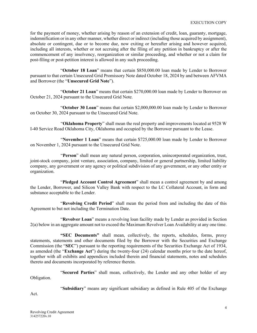 EXECUTION COPY 4 Revolving Credit Agreement 314257220v.10 for the payment of money, whether arising by reason of an extension of credit, loan, guaranty, mortgage, indemnification or in any other manner, whether direct or indirect (including those acquired by assignment), absolute or contingent, due or to become due, now exiting or hereafter arising and however acquired, including all interests, whether or not accruing after the filing of any petition in bankruptcy or after the commencement of any insolvency, reorganization or similar proceeding, and whether or not a claim for post-filing or post-petition interest is allowed in any such proceeding. “October 18 Loan” means that certain $850,000.00 loan made by Lender to Borrower pursuant to that certain Unsecured Grid Promissory Note dated October 18, 2024 by and between AFVMA and Borrower (the “Unsecured Grid Note”). “October 21 Loan” means that certain $270,000.00 loan made by Lender to Borrower on October 21, 2024 pursuant to the Unsecured Grid Note. “October 30 Loan” means that certain $2,000,000.00 loan made by Lender to Borrower on October 30, 2024 pursuant to the Unsecured Grid Note. “Oklahoma Property” shall mean the real property and improvements located at 9528 W I-40 Service Road Oklahoma City, Oklahoma and occupied by the Borrower pursuant to the Lease. “November 1 Loan” means that certain $725,000.00 loan made by Lender to Borrower on November 1, 2024 pursuant to the Unsecured Grid Note. “Person” shall mean any natural person, corporation, unincorporated organization, trust, joint-stock company, joint venture, association, company, limited or general partnership, limited liability company, any government or any agency or political subdivision of any government, or any other entity or organization. “Pledged Account Control Agreement” shall mean a control agreement by and among the Lender, Borrower, and Silicon Valley Bank with respect to the LC Collateral Account, in form and substance acceptable to the Lender. “Revolving Credit Period” shall mean the period from and including the date of this Agreement to but not including the Termination Date. “Revolver Loan” means a revolving loan facility made by Lender as provided in Section 2(a) below in an aggregate amount not to exceed the Maximum Revolver Loan Availability at any one time. “SEC Documents” shall mean, collectively, the reports, schedules, forms, proxy statements, statements and other documents filed by the Borrower with the Securities and Exchange Commission (the “SEC”) pursuant to the reporting requirements of the Securities Exchange Act of 1934, as amended (the “Exchange Act”) during the twenty-four (24) calendar months prior to the date hereof, together with all exhibits and appendices included therein and financial statements, notes and schedules thereto and documents incorporated by reference therein. “Secured Parties” shall mean, collectively, the Lender and any other holder of any Obligation. “Subsidiary” means any significant subsidiary as defined in Rule 405 of the Exchange Act.