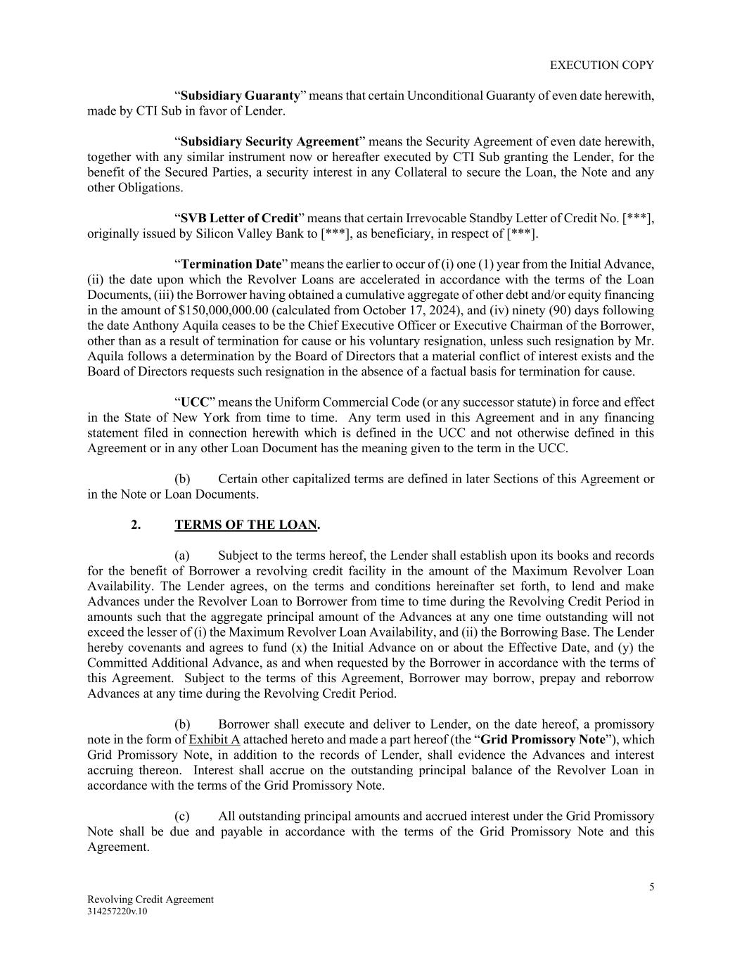 EXECUTION COPY 5 Revolving Credit Agreement 314257220v.10 “Subsidiary Guaranty” means that certain Unconditional Guaranty of even date herewith, made by CTI Sub in favor of Lender. “Subsidiary Security Agreement” means the Security Agreement of even date herewith, together with any similar instrument now or hereafter executed by CTI Sub granting the Lender, for the benefit of the Secured Parties, a security interest in any Collateral to secure the Loan, the Note and any other Obligations. “SVB Letter of Credit” means that certain Irrevocable Standby Letter of Credit No. [***], originally issued by Silicon Valley Bank to [***], as beneficiary, in respect of [***]. “Termination Date” means the earlier to occur of (i) one (1) year from the Initial Advance, (ii) the date upon which the Revolver Loans are accelerated in accordance with the terms of the Loan Documents, (iii) the Borrower having obtained a cumulative aggregate of other debt and/or equity financing in the amount of $150,000,000.00 (calculated from October 17, 2024), and (iv) ninety (90) days following the date Anthony Aquila ceases to be the Chief Executive Officer or Executive Chairman of the Borrower, other than as a result of termination for cause or his voluntary resignation, unless such resignation by Mr. Aquila follows a determination by the Board of Directors that a material conflict of interest exists and the Board of Directors requests such resignation in the absence of a factual basis for termination for cause. “UCC” means the Uniform Commercial Code (or any successor statute) in force and effect in the State of New York from time to time. Any term used in this Agreement and in any financing statement filed in connection herewith which is defined in the UCC and not otherwise defined in this Agreement or in any other Loan Document has the meaning given to the term in the UCC. (b) Certain other capitalized terms are defined in later Sections of this Agreement or in the Note or Loan Documents. 2. TERMS OF THE LOAN. (a) Subject to the terms hereof, the Lender shall establish upon its books and records for the benefit of Borrower a revolving credit facility in the amount of the Maximum Revolver Loan Availability. The Lender agrees, on the terms and conditions hereinafter set forth, to lend and make Advances under the Revolver Loan to Borrower from time to time during the Revolving Credit Period in amounts such that the aggregate principal amount of the Advances at any one time outstanding will not exceed the lesser of (i) the Maximum Revolver Loan Availability, and (ii) the Borrowing Base. The Lender hereby covenants and agrees to fund (x) the Initial Advance on or about the Effective Date, and (y) the Committed Additional Advance, as and when requested by the Borrower in accordance with the terms of this Agreement. Subject to the terms of this Agreement, Borrower may borrow, prepay and reborrow Advances at any time during the Revolving Credit Period. (b) Borrower shall execute and deliver to Lender, on the date hereof, a promissory note in the form of Exhibit A attached hereto and made a part hereof (the “Grid Promissory Note”), which Grid Promissory Note, in addition to the records of Lender, shall evidence the Advances and interest accruing thereon. Interest shall accrue on the outstanding principal balance of the Revolver Loan in accordance with the terms of the Grid Promissory Note. (c) All outstanding principal amounts and accrued interest under the Grid Promissory Note shall be due and payable in accordance with the terms of the Grid Promissory Note and this Agreement.