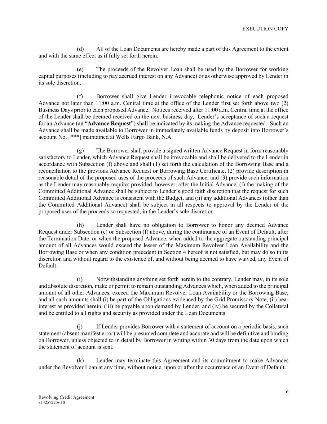 EXECUTION COPY 6 Revolving Credit Agreement 314257220v.10 (d) All of the Loan Documents are hereby made a part of this Agreement to the extent and with the same effect as if fully set forth herein. (e) The proceeds of the Revolver Loan shall be used by the Borrower for working capital purposes (including to pay accrued interest on any Advance) or as otherwise approved by Lender in its sole discretion. (f) Borrower shall give Lender irrevocable telephonic notice of each proposed Advance not later than 11:00 a.m. Central time at the office of the Lender first set forth above two (2) Business Days prior to each proposed Advance. Notices received after 11:00 a.m. Central time at the office of the Lender shall be deemed received on the next business day. Lender’s acceptance of such a request for an Advance (an “Advance Request”) shall be indicated by its making the Advance requested. Such an Advance shall be made available to Borrower in immediately available funds by deposit into Borrower’s account No. [***] maintained at Wells Fargo Bank, N.A. (g) The Borrower shall provide a signed written Advance Request in form reasonably satisfactory to Lender, which Advance Request shall be irrevocable and shall be delivered to the Lender in accordance with Subsection (f) above and shall (1) set forth the calculation of the Borrowing Base and a reconciliation to the previous Advance Request or Borrowing Base Certificate, (2) provide description in reasonable detail of the proposed uses of the proceeds of such Advance, and (3) provide such information as the Lender may reasonably require; provided, however, after the Initial Advance, (i) the making of the Committed Additional Advance shall be subject to Lender’s good faith discretion that the request for such Committed Additional Advance is consistent with the Budget, and (ii) any additional Advances (other than the Committed Additional Advance) shall be subject in all respects to approval by the Lender of the proposed uses of the proceeds so requested, in the Lender’s sole discretion. (h) Lender shall have no obligation to Borrower to honor any deemed Advance Request under Subsection (e) or Subsection (f) above, during the continuance of an Event of Default, after the Termination Date, or when the proposed Advance, when added to the aggregate outstanding principal amount of all Advances would exceed the lesser of the Maximum Revolver Loan Availability and the Borrowing Base or when any condition precedent in Section 4 hereof is not satisfied, but may do so in its discretion and without regard to the existence of, and without being deemed to have waived, any Event of Default. (i) Notwithstanding anything set forth herein to the contrary, Lender may, in its sole and absolute discretion, make or permit to remain outstanding Advances which, when added to the principal amount of all other Advances, exceed the Maximum Revolver Loan Availability or the Borrowing Base, and all such amounts shall (i) be part of the Obligations evidenced by the Grid Promissory Note, (ii) bear interest as provided herein, (iii) be payable upon demand by Lender, and (iv) be secured by the Collateral and be entitled to all rights and security as provided under the Loan Documents. (j) If Lender provides Borrower with a statement of account on a periodic basis, such statement (absent manifest error) will be presumed complete and accurate and will be definitive and binding on Borrower, unless objected to in detail by Borrower in writing within 30 days from the date upon which the statement of account is sent. (k) Lender may terminate this Agreement and its commitment to make Advances under the Revolver Loan at any time, without notice, upon or after the occurrence of an Event of Default.