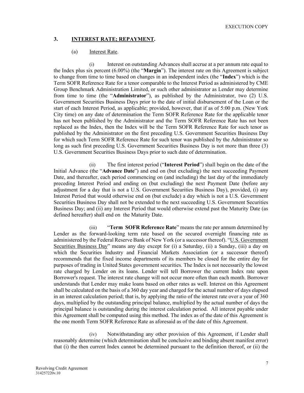 EXECUTION COPY 7 Revolving Credit Agreement 314257220v.10 3. INTEREST RATE; REPAYMENT. (a) Interest Rate. (i) Interest on outstanding Advances shall accrue at a per annum rate equal to the Index plus six percent (6.00%) (the “Margin”). The interest rate on this Agreement is subject to change from time to time based on changes in an independent index (the “Index”) which is the Term SOFR Reference Rate for a tenor comparable to the Interest Period as administered by CME Group Benchmark Administration Limited, or such other administrator as Lender may determine from time to time (the “Administrator”), as published by the Administrator, two (2) U.S. Government Securities Business Days prior to the date of initial disbursement of the Loan or the start of each Interest Period, as applicable; provided, however, that if as of 5:00 p.m. (New York City time) on any date of determination the Term SOFR Reference Rate for the applicable tenor has not been published by the Administrator and the Term SOFR Reference Rate has not been replaced as the Index, then the Index will be the Term SOFR Reference Rate for such tenor as published by the Administrator on the first preceding U.S. Government Securities Business Day for which such Term SOFR Reference Rate for such tenor was published by the Administrator so long as such first preceding U.S. Government Securities Business Day is not more than three (3) U.S. Government Securities Business Days prior to such date of determination. (ii) The first interest period (“Interest Period”) shall begin on the date of the Initial Advance (the “Advance Date”) and end on (but excluding) the next succeeding Payment Date, and thereafter, each period commencing on (and including) the last day of the immediately preceding Interest Period and ending on (but excluding) the next Payment Date (before any adjustment for a day that is not a U.S. Government Securities Business Day), provided, (i) any Interest Period that would otherwise end on (but exclude) a day which is not a U.S. Government Securities Business Day shall not be extended to the next succeeding U.S. Government Securities Business Day; and (ii) any Interest Period that would otherwise extend past the Maturity Date (as defined hereafter) shall end on the Maturity Date. (iii) “Term SOFR Reference Rate” means the rate per annum determined by Lender as the forward-looking term rate based on the secured overnight financing rate as administered by the Federal Reserve Bank of New York (or a successor thereof). “U.S. Government Securities Business Day” means any day except for (i) a Saturday, (ii) a Sunday, (iii) a day on which the Securities Industry and Financial Markets Association (or a successor thereof) recommends that the fixed income departments of its members be closed for the entire day for purposes of trading in United States government securities. The Index is not necessarily the lowest rate charged by Lender on its loans. Lender will tell Borrower the current Index rate upon Borrower's request. The interest rate change will not occur more often than each month. Borrower understands that Lender may make loans based on other rates as well. Interest on this Agreement shall be calculated on the basis of a 360 day year and charged for the actual number of days elapsed in an interest calculation period; that is, by applying the ratio of the interest rate over a year of 360 days, multiplied by the outstanding principal balance, multiplied by the actual number of days the principal balance is outstanding during the interest calculation period. All interest payable under this Agreement shall be computed using this method. The index as of the date of this Agreement is the one month Term SOFR Reference Rate as aforesaid as of the date of this Agreement. (iv) Notwithstanding any other provision of this Agreement, if Lender shall reasonably determine (which determination shall be conclusive and binding absent manifest error) that (i) the then current Index cannot be determined pursuant to the definition thereof, or (ii) the