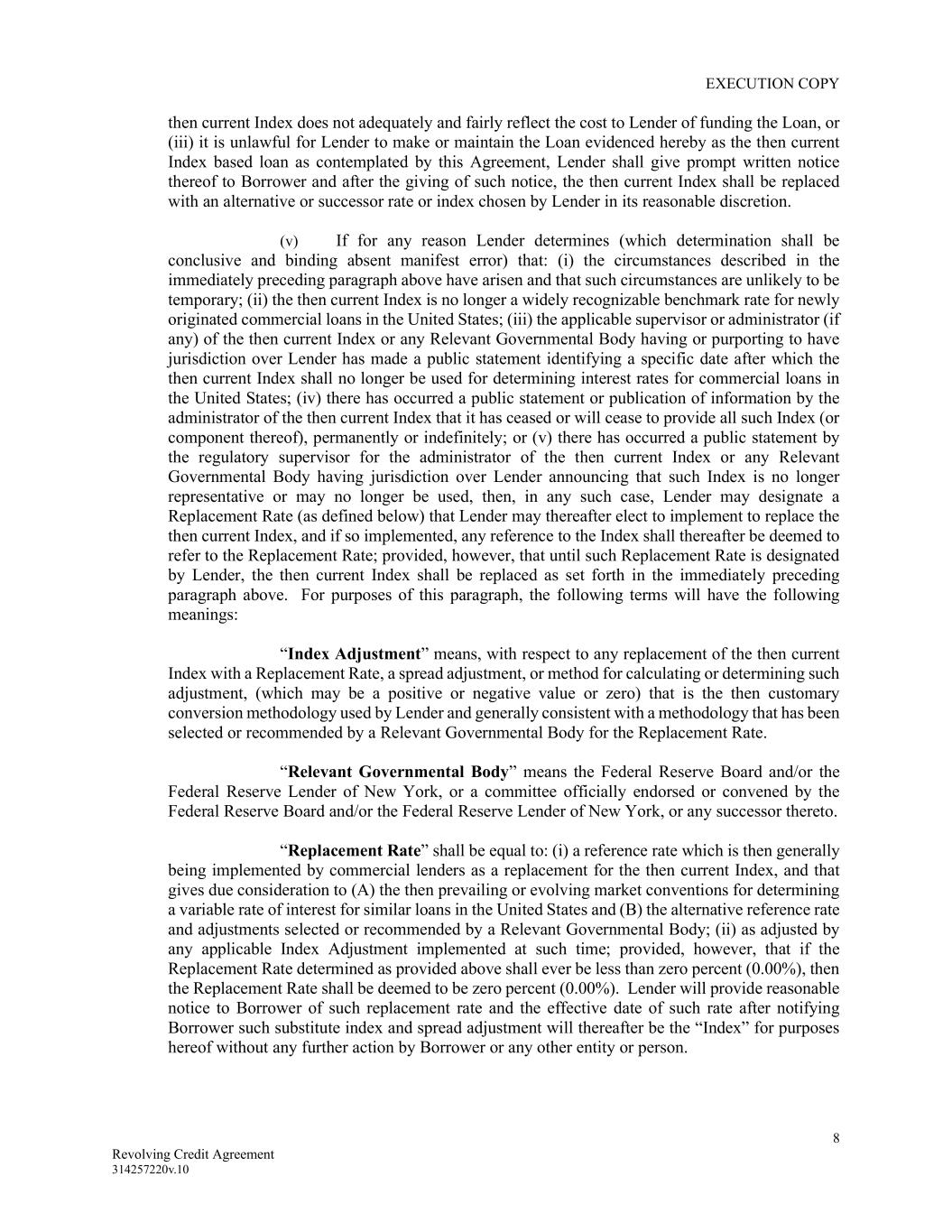 EXECUTION COPY 8 Revolving Credit Agreement 314257220v.10 then current Index does not adequately and fairly reflect the cost to Lender of funding the Loan, or (iii) it is unlawful for Lender to make or maintain the Loan evidenced hereby as the then current Index based loan as contemplated by this Agreement, Lender shall give prompt written notice thereof to Borrower and after the giving of such notice, the then current Index shall be replaced with an alternative or successor rate or index chosen by Lender in its reasonable discretion. (v) If for any reason Lender determines (which determination shall be conclusive and binding absent manifest error) that: (i) the circumstances described in the immediately preceding paragraph above have arisen and that such circumstances are unlikely to be temporary; (ii) the then current Index is no longer a widely recognizable benchmark rate for newly originated commercial loans in the United States; (iii) the applicable supervisor or administrator (if any) of the then current Index or any Relevant Governmental Body having or purporting to have jurisdiction over Lender has made a public statement identifying a specific date after which the then current Index shall no longer be used for determining interest rates for commercial loans in the United States; (iv) there has occurred a public statement or publication of information by the administrator of the then current Index that it has ceased or will cease to provide all such Index (or component thereof), permanently or indefinitely; or (v) there has occurred a public statement by the regulatory supervisor for the administrator of the then current Index or any Relevant Governmental Body having jurisdiction over Lender announcing that such Index is no longer representative or may no longer be used, then, in any such case, Lender may designate a Replacement Rate (as defined below) that Lender may thereafter elect to implement to replace the then current Index, and if so implemented, any reference to the Index shall thereafter be deemed to refer to the Replacement Rate; provided, however, that until such Replacement Rate is designated by Lender, the then current Index shall be replaced as set forth in the immediately preceding paragraph above. For purposes of this paragraph, the following terms will have the following meanings: “Index Adjustment” means, with respect to any replacement of the then current Index with a Replacement Rate, a spread adjustment, or method for calculating or determining such adjustment, (which may be a positive or negative value or zero) that is the then customary conversion methodology used by Lender and generally consistent with a methodology that has been selected or recommended by a Relevant Governmental Body for the Replacement Rate. “Relevant Governmental Body” means the Federal Reserve Board and/or the Federal Reserve Lender of New York, or a committee officially endorsed or convened by the Federal Reserve Board and/or the Federal Reserve Lender of New York, or any successor thereto. “Replacement Rate” shall be equal to: (i) a reference rate which is then generally being implemented by commercial lenders as a replacement for the then current Index, and that gives due consideration to (A) the then prevailing or evolving market conventions for determining a variable rate of interest for similar loans in the United States and (B) the alternative reference rate and adjustments selected or recommended by a Relevant Governmental Body; (ii) as adjusted by any applicable Index Adjustment implemented at such time; provided, however, that if the Replacement Rate determined as provided above shall ever be less than zero percent (0.00%), then the Replacement Rate shall be deemed to be zero percent (0.00%). Lender will provide reasonable notice to Borrower of such replacement rate and the effective date of such rate after notifying Borrower such substitute index and spread adjustment will thereafter be the “Index” for purposes hereof without any further action by Borrower or any other entity or person.