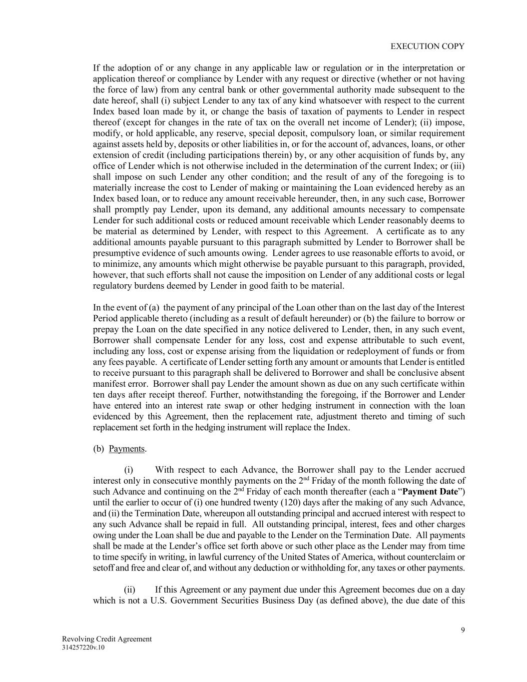 EXECUTION COPY 9 Revolving Credit Agreement 314257220v.10 If the adoption of or any change in any applicable law or regulation or in the interpretation or application thereof or compliance by Lender with any request or directive (whether or not having the force of law) from any central bank or other governmental authority made subsequent to the date hereof, shall (i) subject Lender to any tax of any kind whatsoever with respect to the current Index based loan made by it, or change the basis of taxation of payments to Lender in respect thereof (except for changes in the rate of tax on the overall net income of Lender); (ii) impose, modify, or hold applicable, any reserve, special deposit, compulsory loan, or similar requirement against assets held by, deposits or other liabilities in, or for the account of, advances, loans, or other extension of credit (including participations therein) by, or any other acquisition of funds by, any office of Lender which is not otherwise included in the determination of the current Index; or (iii) shall impose on such Lender any other condition; and the result of any of the foregoing is to materially increase the cost to Lender of making or maintaining the Loan evidenced hereby as an Index based loan, or to reduce any amount receivable hereunder, then, in any such case, Borrower shall promptly pay Lender, upon its demand, any additional amounts necessary to compensate Lender for such additional costs or reduced amount receivable which Lender reasonably deems to be material as determined by Lender, with respect to this Agreement. A certificate as to any additional amounts payable pursuant to this paragraph submitted by Lender to Borrower shall be presumptive evidence of such amounts owing. Lender agrees to use reasonable efforts to avoid, or to minimize, any amounts which might otherwise be payable pursuant to this paragraph, provided, however, that such efforts shall not cause the imposition on Lender of any additional costs or legal regulatory burdens deemed by Lender in good faith to be material. In the event of (a) the payment of any principal of the Loan other than on the last day of the Interest Period applicable thereto (including as a result of default hereunder) or (b) the failure to borrow or prepay the Loan on the date specified in any notice delivered to Lender, then, in any such event, Borrower shall compensate Lender for any loss, cost and expense attributable to such event, including any loss, cost or expense arising from the liquidation or redeployment of funds or from any fees payable. A certificate of Lender setting forth any amount or amounts that Lender is entitled to receive pursuant to this paragraph shall be delivered to Borrower and shall be conclusive absent manifest error. Borrower shall pay Lender the amount shown as due on any such certificate within ten days after receipt thereof. Further, notwithstanding the foregoing, if the Borrower and Lender have entered into an interest rate swap or other hedging instrument in connection with the loan evidenced by this Agreement, then the replacement rate, adjustment thereto and timing of such replacement set forth in the hedging instrument will replace the Index. (b) Payments. (i) With respect to each Advance, the Borrower shall pay to the Lender accrued interest only in consecutive monthly payments on the 2nd Friday of the month following the date of such Advance and continuing on the 2nd Friday of each month thereafter (each a “Payment Date”) until the earlier to occur of (i) one hundred twenty (120) days after the making of any such Advance, and (ii) the Termination Date, whereupon all outstanding principal and accrued interest with respect to any such Advance shall be repaid in full. All outstanding principal, interest, fees and other charges owing under the Loan shall be due and payable to the Lender on the Termination Date. All payments shall be made at the Lender’s office set forth above or such other place as the Lender may from time to time specify in writing, in lawful currency of the United States of America, without counterclaim or setoff and free and clear of, and without any deduction or withholding for, any taxes or other payments. (ii) If this Agreement or any payment due under this Agreement becomes due on a day which is not a U.S. Government Securities Business Day (as defined above), the due date of this