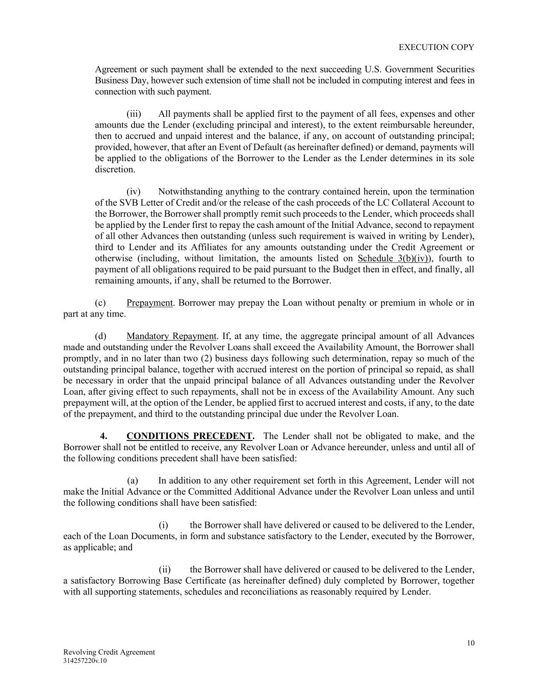 EXECUTION COPY 10 Revolving Credit Agreement 314257220v.10 Agreement or such payment shall be extended to the next succeeding U.S. Government Securities Business Day, however such extension of time shall not be included in computing interest and fees in connection with such payment. (iii) All payments shall be applied first to the payment of all fees, expenses and other amounts due the Lender (excluding principal and interest), to the extent reimbursable hereunder, then to accrued and unpaid interest and the balance, if any, on account of outstanding principal; provided, however, that after an Event of Default (as hereinafter defined) or demand, payments will be applied to the obligations of the Borrower to the Lender as the Lender determines in its sole discretion. (iv) Notwithstanding anything to the contrary contained herein, upon the termination of the SVB Letter of Credit and/or the release of the cash proceeds of the LC Collateral Account to the Borrower, the Borrower shall promptly remit such proceeds to the Lender, which proceeds shall be applied by the Lender first to repay the cash amount of the Initial Advance, second to repayment of all other Advances then outstanding (unless such requirement is waived in writing by Lender), third to Lender and its Affiliates for any amounts outstanding under the Credit Agreement or otherwise (including, without limitation, the amounts listed on Schedule 3(b)(iv)), fourth to payment of all obligations required to be paid pursuant to the Budget then in effect, and finally, all remaining amounts, if any, shall be returned to the Borrower. (c) Prepayment. Borrower may prepay the Loan without penalty or premium in whole or in part at any time. (d) Mandatory Repayment. If, at any time, the aggregate principal amount of all Advances made and outstanding under the Revolver Loans shall exceed the Availability Amount, the Borrower shall promptly, and in no later than two (2) business days following such determination, repay so much of the outstanding principal balance, together with accrued interest on the portion of principal so repaid, as shall be necessary in order that the unpaid principal balance of all Advances outstanding under the Revolver Loan, after giving effect to such repayments, shall not be in excess of the Availability Amount. Any such prepayment will, at the option of the Lender, be applied first to accrued interest and costs, if any, to the date of the prepayment, and third to the outstanding principal due under the Revolver Loan. 4. CONDITIONS PRECEDENT. The Lender shall not be obligated to make, and the Borrower shall not be entitled to receive, any Revolver Loan or Advance hereunder, unless and until all of the following conditions precedent shall have been satisfied: (a) In addition to any other requirement set forth in this Agreement, Lender will not make the Initial Advance or the Committed Additional Advance under the Revolver Loan unless and until the following conditions shall have been satisfied: (i) the Borrower shall have delivered or caused to be delivered to the Lender, each of the Loan Documents, in form and substance satisfactory to the Lender, executed by the Borrower, as applicable; and (ii) the Borrower shall have delivered or caused to be delivered to the Lender, a satisfactory Borrowing Base Certificate (as hereinafter defined) duly completed by Borrower, together with all supporting statements, schedules and reconciliations as reasonably required by Lender.