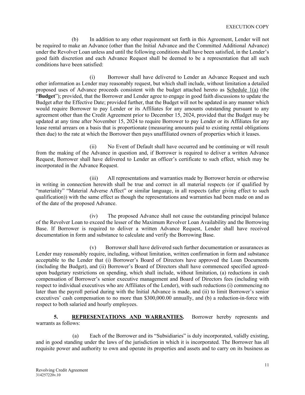 EXECUTION COPY 11 Revolving Credit Agreement 314257220v.10 (b) In addition to any other requirement set forth in this Agreement, Lender will not be required to make an Advance (other than the Initial Advance and the Committed Additional Advance) under the Revolver Loan unless and until the following conditions shall have been satisfied, in the Lender’s good faith discretion and each Advance Request shall be deemed to be a representation that all such conditions have been satisfied: (i) Borrower shall have delivered to Lender an Advance Request and such other information as Lender may reasonably request, but which shall include, without limitation a detailed proposed uses of Advance proceeds consistent with the budget attached hereto as Schedule 1(a) (the “Budget”); provided, that the Borrower and Lender agree to engage in good faith discussions to update the Budget after the Effective Date; provided further, that the Budget will not be updated in any manner which would require Borrower to pay Lender or its Affiliates for any amounts outstanding pursuant to any agreement other than the Credit Agreement prior to December 15, 2024, provided that the Budget may be updated at any time after November 15, 2024 to require Borrower to pay Lender or its Affiliates for any lease rental arrears on a basis that is proportionate (measuring amounts paid to existing rental obligations then due) to the rate at which the Borrower then pays unaffiliated owners of properties which it leases. (ii) No Event of Default shall have occurred and be continuing or will result from the making of the Advance in question and, if Borrower is required to deliver a written Advance Request, Borrower shall have delivered to Lender an officer’s certificate to such effect, which may be incorporated in the Advance Request. (iii) All representations and warranties made by Borrower herein or otherwise in writing in connection herewith shall be true and correct in all material respects (or if qualified by “materiality” “Material Adverse Affect” or similar language, in all respects (after giving effect to such qualification)) with the same effect as though the representations and warranties had been made on and as of the date of the proposed Advance. (iv) The proposed Advance shall not cause the outstanding principal balance of the Revolver Loan to exceed the lesser of the Maximum Revolver Loan Availability and the Borrowing Base. If Borrower is required to deliver a written Advance Request, Lender shall have received documentation in form and substance to calculate and verify the Borrowing Base. (v) Borrower shall have delivered such further documentation or assurances as Lender may reasonably require, including, without limitation, written confirmation in form and substance acceptable to the Lender that (i) Borrower’s Board of Directors have approved the Loan Documents (including the Budget), and (ii) Borrower’s Board of Directors shall have commenced specified agreed- upon budgetary restrictions on spending, which shall include, without limitation, (a) reductions in cash compensation of Borrower’s senior executive management and Board of Directors fees (including with respect to individual executives who are Affiliates of the Lender), with such reductions (i) commencing no later than the payroll period during with the Initial Advance is made, and (ii) to limit Borrower’s senior executives’ cash compensation to no more than $300,000.00 annually, and (b) a reduction-in-force with respect to both salaried and hourly employees. 5. REPRESENTATIONS AND WARRANTIES. Borrower hereby represents and warrants as follows: (a) Each of the Borrower and its “Subsidiaries” is duly incorporated, validly existing, and in good standing under the laws of the jurisdiction in which it is incorporated. The Borrower has all requisite power and authority to own and operate its properties and assets and to carry on its business as