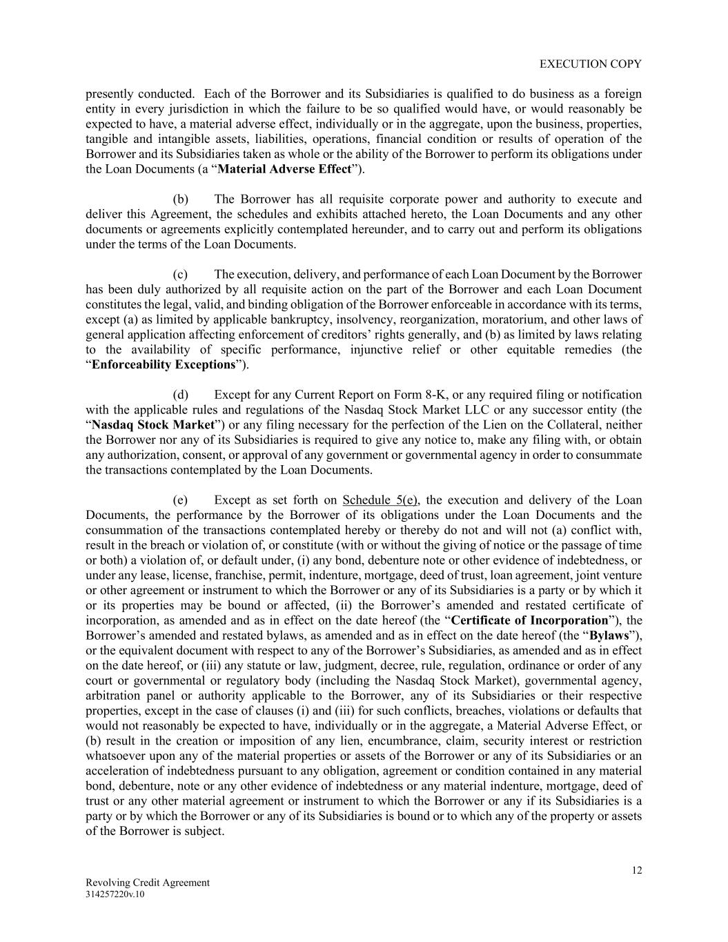 EXECUTION COPY 12 Revolving Credit Agreement 314257220v.10 presently conducted. Each of the Borrower and its Subsidiaries is qualified to do business as a foreign entity in every jurisdiction in which the failure to be so qualified would have, or would reasonably be expected to have, a material adverse effect, individually or in the aggregate, upon the business, properties, tangible and intangible assets, liabilities, operations, financial condition or results of operation of the Borrower and its Subsidiaries taken as whole or the ability of the Borrower to perform its obligations under the Loan Documents (a “Material Adverse Effect”). (b) The Borrower has all requisite corporate power and authority to execute and deliver this Agreement, the schedules and exhibits attached hereto, the Loan Documents and any other documents or agreements explicitly contemplated hereunder, and to carry out and perform its obligations under the terms of the Loan Documents. (c) The execution, delivery, and performance of each Loan Document by the Borrower has been duly authorized by all requisite action on the part of the Borrower and each Loan Document constitutes the legal, valid, and binding obligation of the Borrower enforceable in accordance with its terms, except (a) as limited by applicable bankruptcy, insolvency, reorganization, moratorium, and other laws of general application affecting enforcement of creditors’ rights generally, and (b) as limited by laws relating to the availability of specific performance, injunctive relief or other equitable remedies (the “Enforceability Exceptions”). (d) Except for any Current Report on Form 8-K, or any required filing or notification with the applicable rules and regulations of the Nasdaq Stock Market LLC or any successor entity (the “Nasdaq Stock Market”) or any filing necessary for the perfection of the Lien on the Collateral, neither the Borrower nor any of its Subsidiaries is required to give any notice to, make any filing with, or obtain any authorization, consent, or approval of any government or governmental agency in order to consummate the transactions contemplated by the Loan Documents. (e) Except as set forth on Schedule 5(e), the execution and delivery of the Loan Documents, the performance by the Borrower of its obligations under the Loan Documents and the consummation of the transactions contemplated hereby or thereby do not and will not (a) conflict with, result in the breach or violation of, or constitute (with or without the giving of notice or the passage of time or both) a violation of, or default under, (i) any bond, debenture note or other evidence of indebtedness, or under any lease, license, franchise, permit, indenture, mortgage, deed of trust, loan agreement, joint venture or other agreement or instrument to which the Borrower or any of its Subsidiaries is a party or by which it or its properties may be bound or affected, (ii) the Borrower’s amended and restated certificate of incorporation, as amended and as in effect on the date hereof (the “Certificate of Incorporation”), the Borrower’s amended and restated bylaws, as amended and as in effect on the date hereof (the “Bylaws”), or the equivalent document with respect to any of the Borrower’s Subsidiaries, as amended and as in effect on the date hereof, or (iii) any statute or law, judgment, decree, rule, regulation, ordinance or order of any court or governmental or regulatory body (including the Nasdaq Stock Market), governmental agency, arbitration panel or authority applicable to the Borrower, any of its Subsidiaries or their respective properties, except in the case of clauses (i) and (iii) for such conflicts, breaches, violations or defaults that would not reasonably be expected to have, individually or in the aggregate, a Material Adverse Effect, or (b) result in the creation or imposition of any lien, encumbrance, claim, security interest or restriction whatsoever upon any of the material properties or assets of the Borrower or any of its Subsidiaries or an acceleration of indebtedness pursuant to any obligation, agreement or condition contained in any material bond, debenture, note or any other evidence of indebtedness or any material indenture, mortgage, deed of trust or any other material agreement or instrument to which the Borrower or any if its Subsidiaries is a party or by which the Borrower or any of its Subsidiaries is bound or to which any of the property or assets of the Borrower is subject.