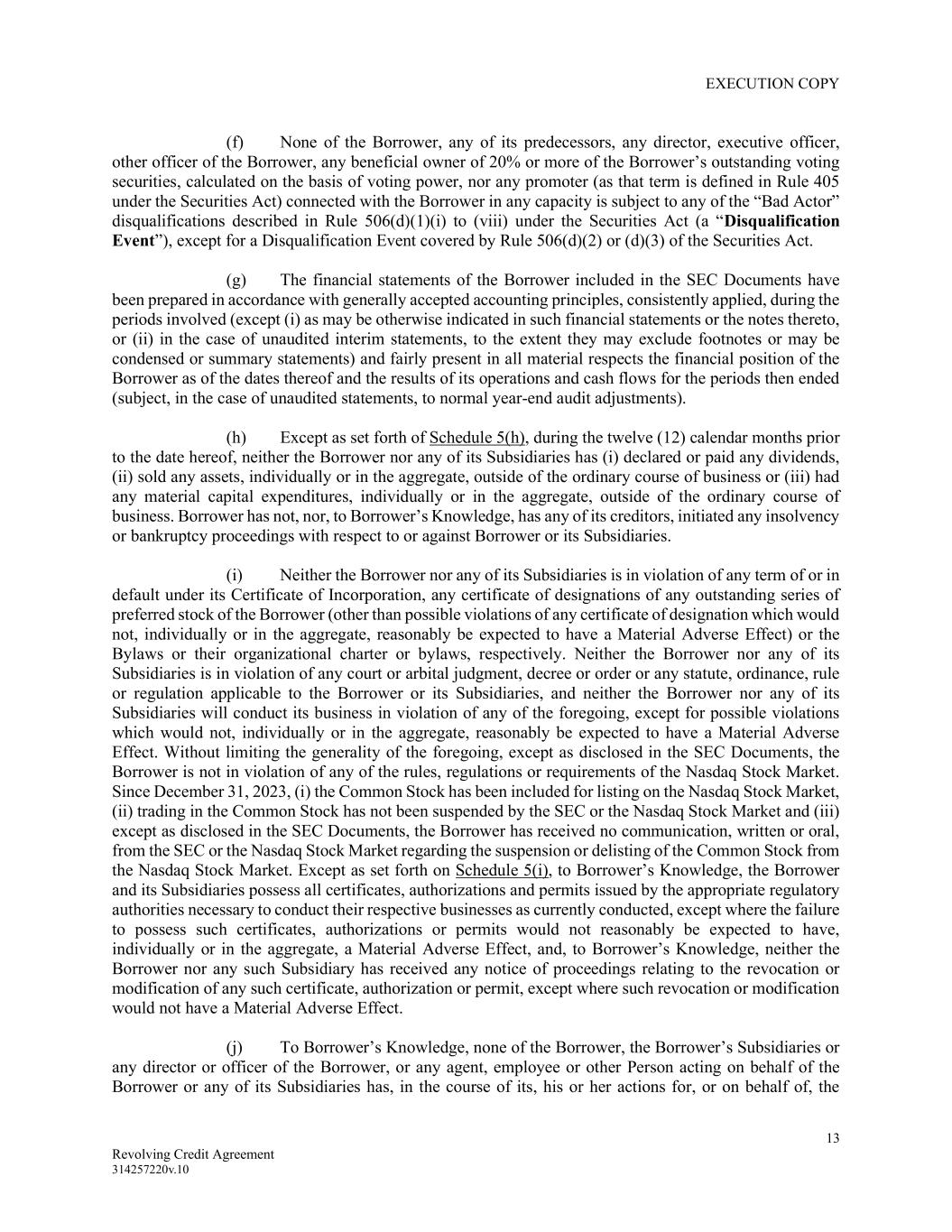 EXECUTION COPY 13 Revolving Credit Agreement 314257220v.10 (f) None of the Borrower, any of its predecessors, any director, executive officer, other officer of the Borrower, any beneficial owner of 20% or more of the Borrower’s outstanding voting securities, calculated on the basis of voting power, nor any promoter (as that term is defined in Rule 405 under the Securities Act) connected with the Borrower in any capacity is subject to any of the “Bad Actor” disqualifications described in Rule 506(d)(1)(i) to (viii) under the Securities Act (a “Disqualification Event”), except for a Disqualification Event covered by Rule 506(d)(2) or (d)(3) of the Securities Act. (g) The financial statements of the Borrower included in the SEC Documents have been prepared in accordance with generally accepted accounting principles, consistently applied, during the periods involved (except (i) as may be otherwise indicated in such financial statements or the notes thereto, or (ii) in the case of unaudited interim statements, to the extent they may exclude footnotes or may be condensed or summary statements) and fairly present in all material respects the financial position of the Borrower as of the dates thereof and the results of its operations and cash flows for the periods then ended (subject, in the case of unaudited statements, to normal year-end audit adjustments). (h) Except as set forth of Schedule 5(h), during the twelve (12) calendar months prior to the date hereof, neither the Borrower nor any of its Subsidiaries has (i) declared or paid any dividends, (ii) sold any assets, individually or in the aggregate, outside of the ordinary course of business or (iii) had any material capital expenditures, individually or in the aggregate, outside of the ordinary course of business. Borrower has not, nor, to Borrower’s Knowledge, has any of its creditors, initiated any insolvency or bankruptcy proceedings with respect to or against Borrower or its Subsidiaries. (i) Neither the Borrower nor any of its Subsidiaries is in violation of any term of or in default under its Certificate of Incorporation, any certificate of designations of any outstanding series of preferred stock of the Borrower (other than possible violations of any certificate of designation which would not, individually or in the aggregate, reasonably be expected to have a Material Adverse Effect) or the Bylaws or their organizational charter or bylaws, respectively. Neither the Borrower nor any of its Subsidiaries is in violation of any court or arbital judgment, decree or order or any statute, ordinance, rule or regulation applicable to the Borrower or its Subsidiaries, and neither the Borrower nor any of its Subsidiaries will conduct its business in violation of any of the foregoing, except for possible violations which would not, individually or in the aggregate, reasonably be expected to have a Material Adverse Effect. Without limiting the generality of the foregoing, except as disclosed in the SEC Documents, the Borrower is not in violation of any of the rules, regulations or requirements of the Nasdaq Stock Market. Since December 31, 2023, (i) the Common Stock has been included for listing on the Nasdaq Stock Market, (ii) trading in the Common Stock has not been suspended by the SEC or the Nasdaq Stock Market and (iii) except as disclosed in the SEC Documents, the Borrower has received no communication, written or oral, from the SEC or the Nasdaq Stock Market regarding the suspension or delisting of the Common Stock from the Nasdaq Stock Market. Except as set forth on Schedule 5(i), to Borrower’s Knowledge, the Borrower and its Subsidiaries possess all certificates, authorizations and permits issued by the appropriate regulatory authorities necessary to conduct their respective businesses as currently conducted, except where the failure to possess such certificates, authorizations or permits would not reasonably be expected to have, individually or in the aggregate, a Material Adverse Effect, and, to Borrower’s Knowledge, neither the Borrower nor any such Subsidiary has received any notice of proceedings relating to the revocation or modification of any such certificate, authorization or permit, except where such revocation or modification would not have a Material Adverse Effect. (j) To Borrower’s Knowledge, none of the Borrower, the Borrower’s Subsidiaries or any director or officer of the Borrower, or any agent, employee or other Person acting on behalf of the Borrower or any of its Subsidiaries has, in the course of its, his or her actions for, or on behalf of, the