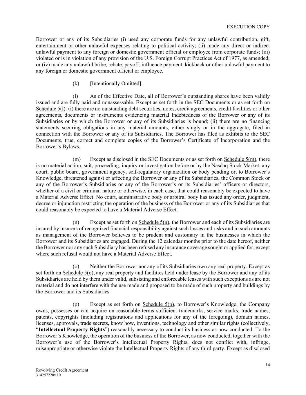 EXECUTION COPY 14 Revolving Credit Agreement 314257220v.10 Borrower or any of its Subsidiaries (i) used any corporate funds for any unlawful contribution, gift, entertainment or other unlawful expenses relating to political activity; (ii) made any direct or indirect unlawful payment to any foreign or domestic government official or employee from corporate funds; (iii) violated or is in violation of any provision of the U.S. Foreign Corrupt Practices Act of 1977, as amended; or (iv) made any unlawful bribe, rebate, payoff, influence payment, kickback or other unlawful payment to any foreign or domestic government official or employee. (k) [Intentionally Omitted]. (l) As of the Effective Date, all of Borrower’s outstanding shares have been validly issued and are fully paid and nonassessable. Except as set forth in the SEC Documents or as set forth on Schedule 5(l): (i) there are no outstanding debt securities, notes, credit agreements, credit facilities or other agreements, documents or instruments evidencing material Indebtedness of the Borrower or any of its Subsidiaries or by which the Borrower or any of its Subsidiaries is bound; (ii) there are no financing statements securing obligations in any material amounts, either singly or in the aggregate, filed in connection with the Borrower or any of its Subsidiaries. The Borrower has filed as exhibits to the SEC Documents, true, correct and complete copies of the Borrower’s Certificate of Incorporation and the Borrower’s Bylaws. (m) Except as disclosed in the SEC Documents or as set forth on Schedule 5(m), there is no material action, suit, proceeding, inquiry or investigation before or by the Nasdaq Stock Market, any court, public board, government agency, self-regulatory organization or body pending or, to Borrower’s Knowledge, threatened against or affecting the Borrower or any of its Subsidiaries, the Common Stock or any of the Borrower’s Subsidiaries or any of the Borrower’s or its Subsidiaries’ officers or directors, whether of a civil or criminal nature or otherwise, in each case, that could reasonably be expected to have a Material Adverse Effect. No court, administrative body or arbitral body has issued any order, judgment, decree or injunction restricting the operation of the business of the Borrower or any of its Subsidiaries that could reasonably be expected to have a Material Adverse Effect. (n) Except as set forth on Schedule 5(n), the Borrower and each of its Subsidiaries are insured by insurers of recognized financial responsibility against such losses and risks and in such amounts as management of the Borrower believes to be prudent and customary in the businesses in which the Borrower and its Subsidiaries are engaged. During the 12 calendar months prior to the date hereof, neither the Borrower nor any such Subsidiary has been refused any insurance coverage sought or applied for, except where such refusal would not have a Material Adverse Effect. (o) Neither the Borrower nor any of its Subsidiaries own any real property. Except as set forth on Schedule 5(o), any real property and facilities held under lease by the Borrower and any of its Subsidiaries are held by them under valid, subsisting and enforceable leases with such exceptions as are not material and do not interfere with the use made and proposed to be made of such property and buildings by the Borrower and its Subsidiaries. (p) Except as set forth on Schedule 5(p), to Borrower’s Knowledge, the Company owns, possesses or can acquire on reasonable terms sufficient trademarks, service marks, trade names, patents, copyrights (including registrations and applications for any of the foregoing), domain names, licenses, approvals, trade secrets, know how, inventions, technology and other similar rights (collectively, “Intellectual Property Rights”) reasonably necessary to conduct its business as now conducted. To the Borrower’s Knowledge, the operation of the business of the Borrower, as now conducted, together with the Borrower’s use of the Borrower’s Intellectual Property Rights, does not conflict with, infringe, misappropriate or otherwise violate the Intellectual Property Rights of any third party. Except as disclosed