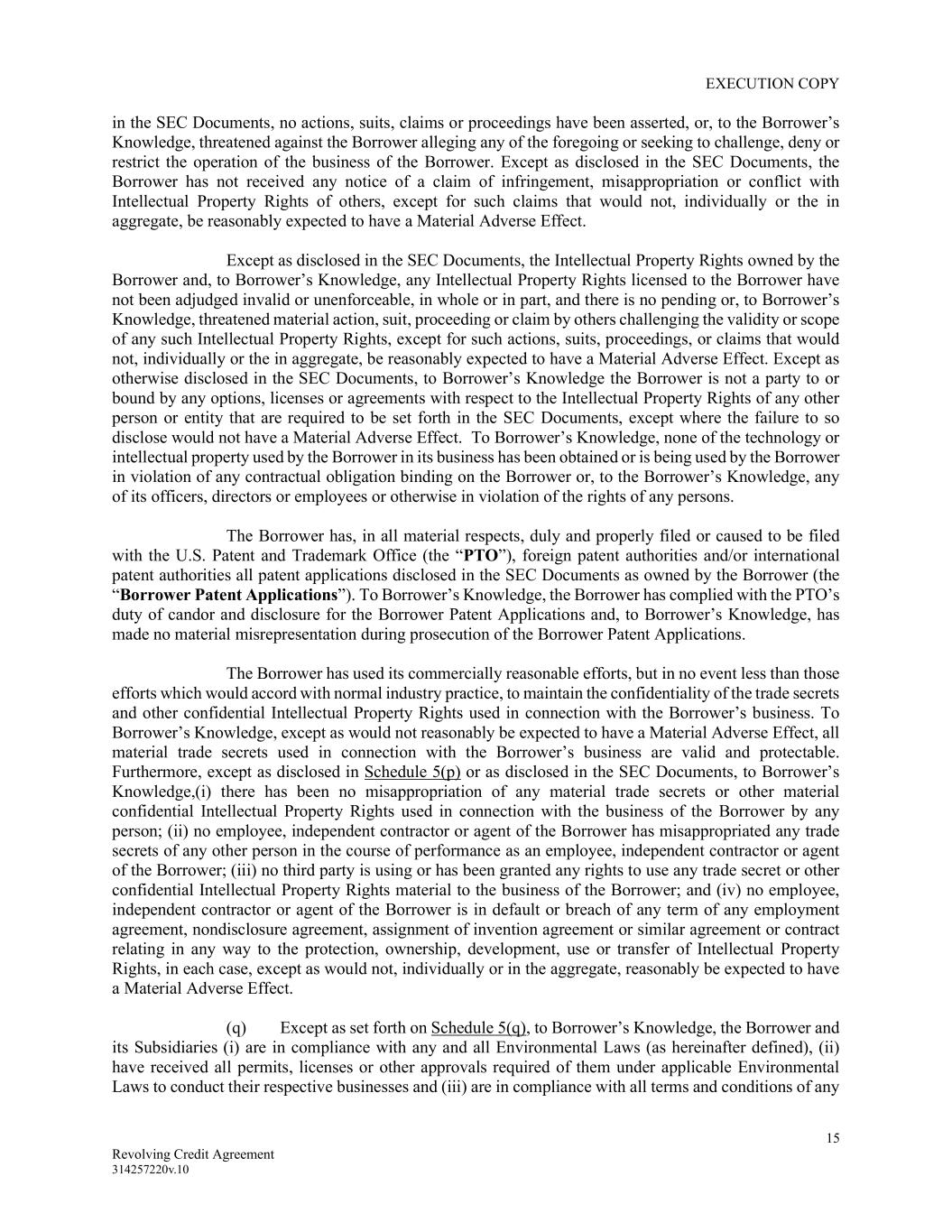 EXECUTION COPY 15 Revolving Credit Agreement 314257220v.10 in the SEC Documents, no actions, suits, claims or proceedings have been asserted, or, to the Borrower’s Knowledge, threatened against the Borrower alleging any of the foregoing or seeking to challenge, deny or restrict the operation of the business of the Borrower. Except as disclosed in the SEC Documents, the Borrower has not received any notice of a claim of infringement, misappropriation or conflict with Intellectual Property Rights of others, except for such claims that would not, individually or the in aggregate, be reasonably expected to have a Material Adverse Effect. Except as disclosed in the SEC Documents, the Intellectual Property Rights owned by the Borrower and, to Borrower’s Knowledge, any Intellectual Property Rights licensed to the Borrower have not been adjudged invalid or unenforceable, in whole or in part, and there is no pending or, to Borrower’s Knowledge, threatened material action, suit, proceeding or claim by others challenging the validity or scope of any such Intellectual Property Rights, except for such actions, suits, proceedings, or claims that would not, individually or the in aggregate, be reasonably expected to have a Material Adverse Effect. Except as otherwise disclosed in the SEC Documents, to Borrower’s Knowledge the Borrower is not a party to or bound by any options, licenses or agreements with respect to the Intellectual Property Rights of any other person or entity that are required to be set forth in the SEC Documents, except where the failure to so disclose would not have a Material Adverse Effect. To Borrower’s Knowledge, none of the technology or intellectual property used by the Borrower in its business has been obtained or is being used by the Borrower in violation of any contractual obligation binding on the Borrower or, to the Borrower’s Knowledge, any of its officers, directors or employees or otherwise in violation of the rights of any persons. The Borrower has, in all material respects, duly and properly filed or caused to be filed with the U.S. Patent and Trademark Office (the “PTO”), foreign patent authorities and/or international patent authorities all patent applications disclosed in the SEC Documents as owned by the Borrower (the “Borrower Patent Applications”). To Borrower’s Knowledge, the Borrower has complied with the PTO’s duty of candor and disclosure for the Borrower Patent Applications and, to Borrower’s Knowledge, has made no material misrepresentation during prosecution of the Borrower Patent Applications. The Borrower has used its commercially reasonable efforts, but in no event less than those efforts which would accord with normal industry practice, to maintain the confidentiality of the trade secrets and other confidential Intellectual Property Rights used in connection with the Borrower’s business. To Borrower’s Knowledge, except as would not reasonably be expected to have a Material Adverse Effect, all material trade secrets used in connection with the Borrower’s business are valid and protectable. Furthermore, except as disclosed in Schedule 5(p) or as disclosed in the SEC Documents, to Borrower’s Knowledge,(i) there has been no misappropriation of any material trade secrets or other material confidential Intellectual Property Rights used in connection with the business of the Borrower by any person; (ii) no employee, independent contractor or agent of the Borrower has misappropriated any trade secrets of any other person in the course of performance as an employee, independent contractor or agent of the Borrower; (iii) no third party is using or has been granted any rights to use any trade secret or other confidential Intellectual Property Rights material to the business of the Borrower; and (iv) no employee, independent contractor or agent of the Borrower is in default or breach of any term of any employment agreement, nondisclosure agreement, assignment of invention agreement or similar agreement or contract relating in any way to the protection, ownership, development, use or transfer of Intellectual Property Rights, in each case, except as would not, individually or in the aggregate, reasonably be expected to have a Material Adverse Effect. (q) Except as set forth on Schedule 5(q), to Borrower’s Knowledge, the Borrower and its Subsidiaries (i) are in compliance with any and all Environmental Laws (as hereinafter defined), (ii) have received all permits, licenses or other approvals required of them under applicable Environmental Laws to conduct their respective businesses and (iii) are in compliance with all terms and conditions of any