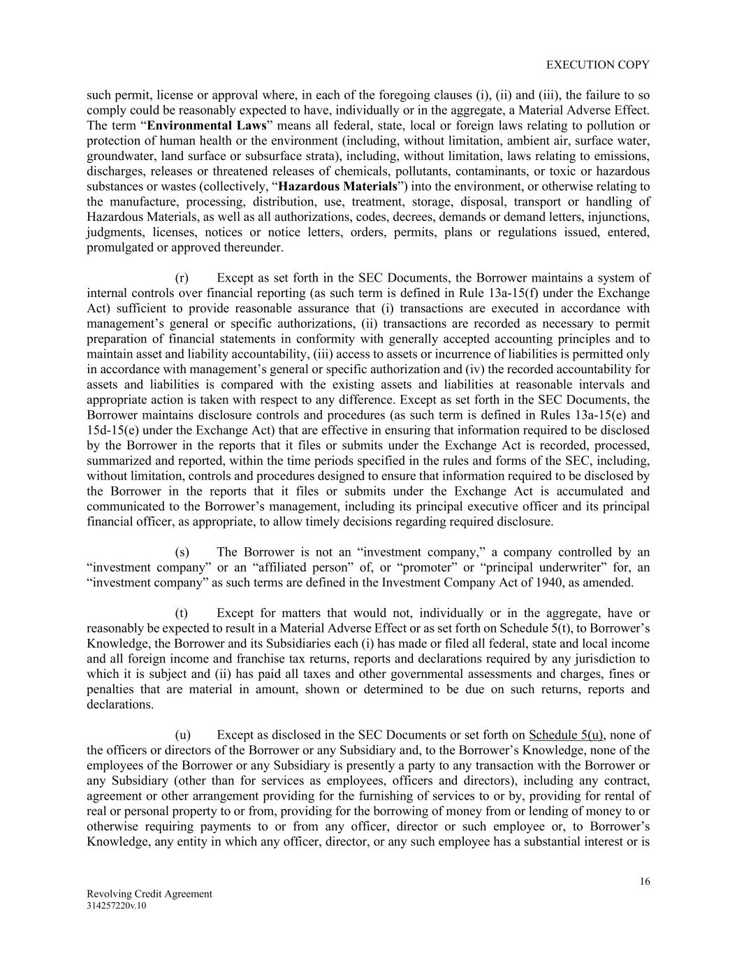 EXECUTION COPY 16 Revolving Credit Agreement 314257220v.10 such permit, license or approval where, in each of the foregoing clauses (i), (ii) and (iii), the failure to so comply could be reasonably expected to have, individually or in the aggregate, a Material Adverse Effect. The term “Environmental Laws” means all federal, state, local or foreign laws relating to pollution or protection of human health or the environment (including, without limitation, ambient air, surface water, groundwater, land surface or subsurface strata), including, without limitation, laws relating to emissions, discharges, releases or threatened releases of chemicals, pollutants, contaminants, or toxic or hazardous substances or wastes (collectively, “Hazardous Materials”) into the environment, or otherwise relating to the manufacture, processing, distribution, use, treatment, storage, disposal, transport or handling of Hazardous Materials, as well as all authorizations, codes, decrees, demands or demand letters, injunctions, judgments, licenses, notices or notice letters, orders, permits, plans or regulations issued, entered, promulgated or approved thereunder. (r) Except as set forth in the SEC Documents, the Borrower maintains a system of internal controls over financial reporting (as such term is defined in Rule 13a-15(f) under the Exchange Act) sufficient to provide reasonable assurance that (i) transactions are executed in accordance with management’s general or specific authorizations, (ii) transactions are recorded as necessary to permit preparation of financial statements in conformity with generally accepted accounting principles and to maintain asset and liability accountability, (iii) access to assets or incurrence of liabilities is permitted only in accordance with management’s general or specific authorization and (iv) the recorded accountability for assets and liabilities is compared with the existing assets and liabilities at reasonable intervals and appropriate action is taken with respect to any difference. Except as set forth in the SEC Documents, the Borrower maintains disclosure controls and procedures (as such term is defined in Rules 13a-15(e) and 15d-15(e) under the Exchange Act) that are effective in ensuring that information required to be disclosed by the Borrower in the reports that it files or submits under the Exchange Act is recorded, processed, summarized and reported, within the time periods specified in the rules and forms of the SEC, including, without limitation, controls and procedures designed to ensure that information required to be disclosed by the Borrower in the reports that it files or submits under the Exchange Act is accumulated and communicated to the Borrower’s management, including its principal executive officer and its principal financial officer, as appropriate, to allow timely decisions regarding required disclosure. (s) The Borrower is not an “investment company,” a company controlled by an “investment company” or an “affiliated person” of, or “promoter” or “principal underwriter” for, an “investment company” as such terms are defined in the Investment Company Act of 1940, as amended. (t) Except for matters that would not, individually or in the aggregate, have or reasonably be expected to result in a Material Adverse Effect or as set forth on Schedule 5(t), to Borrower’s Knowledge, the Borrower and its Subsidiaries each (i) has made or filed all federal, state and local income and all foreign income and franchise tax returns, reports and declarations required by any jurisdiction to which it is subject and (ii) has paid all taxes and other governmental assessments and charges, fines or penalties that are material in amount, shown or determined to be due on such returns, reports and declarations. (u) Except as disclosed in the SEC Documents or set forth on Schedule 5(u), none of the officers or directors of the Borrower or any Subsidiary and, to the Borrower’s Knowledge, none of the employees of the Borrower or any Subsidiary is presently a party to any transaction with the Borrower or any Subsidiary (other than for services as employees, officers and directors), including any contract, agreement or other arrangement providing for the furnishing of services to or by, providing for rental of real or personal property to or from, providing for the borrowing of money from or lending of money to or otherwise requiring payments to or from any officer, director or such employee or, to Borrower’s Knowledge, any entity in which any officer, director, or any such employee has a substantial interest or is