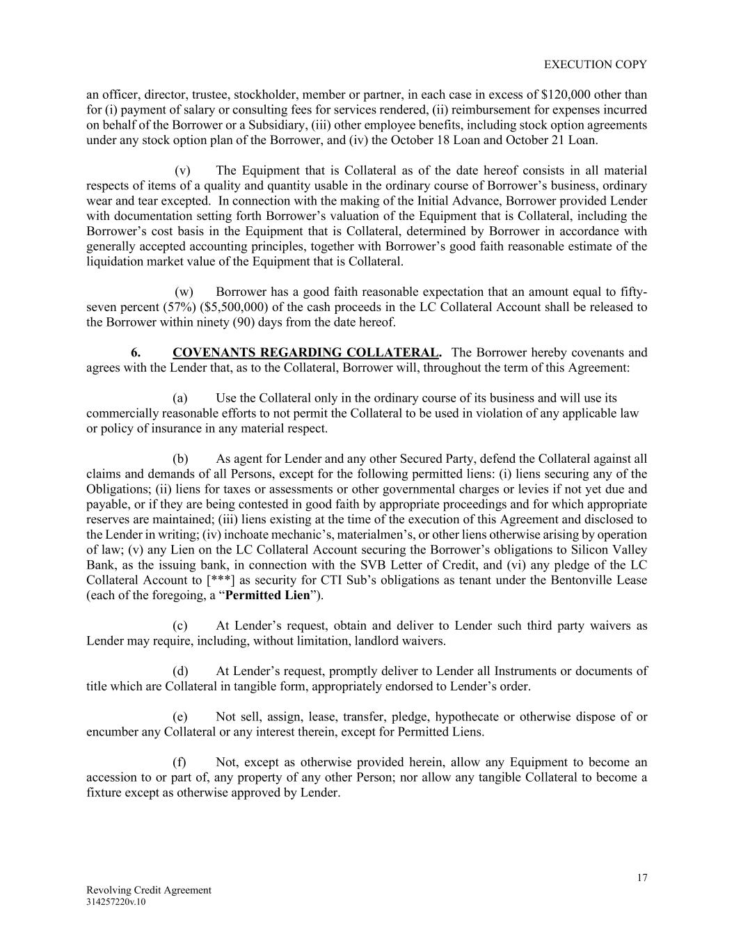 EXECUTION COPY 17 Revolving Credit Agreement 314257220v.10 an officer, director, trustee, stockholder, member or partner, in each case in excess of $120,000 other than for (i) payment of salary or consulting fees for services rendered, (ii) reimbursement for expenses incurred on behalf of the Borrower or a Subsidiary, (iii) other employee benefits, including stock option agreements under any stock option plan of the Borrower, and (iv) the October 18 Loan and October 21 Loan. (v) The Equipment that is Collateral as of the date hereof consists in all material respects of items of a quality and quantity usable in the ordinary course of Borrower’s business, ordinary wear and tear excepted. In connection with the making of the Initial Advance, Borrower provided Lender with documentation setting forth Borrower’s valuation of the Equipment that is Collateral, including the Borrower’s cost basis in the Equipment that is Collateral, determined by Borrower in accordance with generally accepted accounting principles, together with Borrower’s good faith reasonable estimate of the liquidation market value of the Equipment that is Collateral. (w) Borrower has a good faith reasonable expectation that an amount equal to fifty- seven percent (57%) ($5,500,000) of the cash proceeds in the LC Collateral Account shall be released to the Borrower within ninety (90) days from the date hereof. 6. COVENANTS REGARDING COLLATERAL. The Borrower hereby covenants and agrees with the Lender that, as to the Collateral, Borrower will, throughout the term of this Agreement: (a) Use the Collateral only in the ordinary course of its business and will use its commercially reasonable efforts to not permit the Collateral to be used in violation of any applicable law or policy of insurance in any material respect. (b) As agent for Lender and any other Secured Party, defend the Collateral against all claims and demands of all Persons, except for the following permitted liens: (i) liens securing any of the Obligations; (ii) liens for taxes or assessments or other governmental charges or levies if not yet due and payable, or if they are being contested in good faith by appropriate proceedings and for which appropriate reserves are maintained; (iii) liens existing at the time of the execution of this Agreement and disclosed to the Lender in writing; (iv) inchoate mechanic’s, materialmen’s, or other liens otherwise arising by operation of law; (v) any Lien on the LC Collateral Account securing the Borrower’s obligations to Silicon Valley Bank, as the issuing bank, in connection with the SVB Letter of Credit, and (vi) any pledge of the LC Collateral Account to [***] as security for CTI Sub’s obligations as tenant under the Bentonville Lease (each of the foregoing, a “Permitted Lien”). (c) At Lender’s request, obtain and deliver to Lender such third party waivers as Lender may require, including, without limitation, landlord waivers. (d) At Lender’s request, promptly deliver to Lender all Instruments or documents of title which are Collateral in tangible form, appropriately endorsed to Lender’s order. (e) Not sell, assign, lease, transfer, pledge, hypothecate or otherwise dispose of or encumber any Collateral or any interest therein, except for Permitted Liens. (f) Not, except as otherwise provided herein, allow any Equipment to become an accession to or part of, any property of any other Person; nor allow any tangible Collateral to become a fixture except as otherwise approved by Lender.