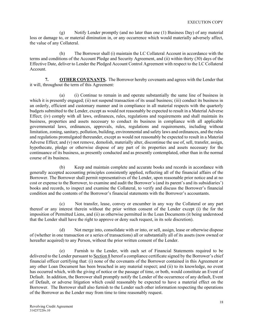 EXECUTION COPY 18 Revolving Credit Agreement 314257220v.10 (g) Notify Lender promptly (and no later than one (1) Business Day) of any material loss or damage to, or material diminution in, or any occurrence which would materially adversely affect, the value of any Collateral. (h) The Borrower shall (i) maintain the LC Collateral Account in accordance with the terms and conditions of the Account Pledge and Security Agreement, and (ii) within thirty (30) days of the Effective Date, deliver to Lender the Pledged Account Control Agreement with respect to the LC Collateral Account. 7. OTHER COVENANTS. The Borrower hereby covenants and agrees with the Lender that it will, throughout the term of this Agreement: (a) (i) Continue to remain in and operate substantially the same line of business in which it is presently engaged; (ii) not suspend transaction of its usual business; (iii) conduct its business in an orderly, efficient and customary manner and in compliance in all material respects with the quarterly budgets submitted to the Lender, except as would not reasonably be expected to result in a Material Adverse Effect; (iv) comply with all laws, ordinances, rules, regulations and requirements and shall maintain its business, properties and assets necessary to conduct its business in compliance with all applicable governmental laws, ordinances, approvals, rules, regulations and requirements, including without limitation, zoning, sanitary, pollution, building, environmental and safety laws and ordinances, and the rules and regulations promulgated thereunder, except as would not reasonably be expected to result in a Material Adverse Effect; and (v) not remove, demolish, materially alter, discontinue the use of, sell, transfer, assign, hypothecate, pledge or otherwise dispose of any part of its properties and assets necessary for the continuance of its business, as presently conducted and as presently contemplated, other than in the normal course of its business. (b) Keep and maintain complete and accurate books and records in accordance with generally accepted accounting principles consistently applied, reflecting all of the financial affairs of the Borrower. The Borrower shall permit representatives of the Lender, upon reasonable prior notice and at no cost or expense to the Borrower, to examine and audit the Borrower’s (and its parent’s and its subsidiaries’) books and records, to inspect and examine the Collateral, to verify and discuss the Borrower’s financial condition and the contents of the Borrower’s financial statements with the Borrower’s accountants. (c) Not transfer, lease, convey or encumber in any way the Collateral or any part thereof or any interest therein without the prior written consent of the Lender except (i) the for the imposition of Permitted Liens, and (ii) as otherwise permitted in the Loan Documents (it being understood that the Lender shall have the right to approve or deny such request, in its sole discretion). (d) Not merge into, consolidate with or into, or sell, assign, lease or otherwise dispose of (whether in one transaction or a series of transactions) all or substantially all of its assets (now owned or hereafter acquired) to any Person, without the prior written consent of the Lender. (e) Furnish to the Lender, with each set of Financial Statements required to be delivered to the Lender pursuant to Section 8 hereof a compliance certificate signed by the Borrower’s chief financial officer certifying that: (i) none of the covenants of the Borrower contained in this Agreement or any other Loan Document has been breached in any material respect; and (ii) to its knowledge, no event has occurred which, with the giving of notice or the passage of time, or both, would constitute an Event of Default. In addition, the Borrower shall promptly notify the Lender of the occurrence of any default, Event of Default, or adverse litigation which could reasonably be expected to have a material effect on the Borrower. The Borrower shall also furnish to the Lender such other information respecting the operations of the Borrower as the Lender may from time to time reasonably request.