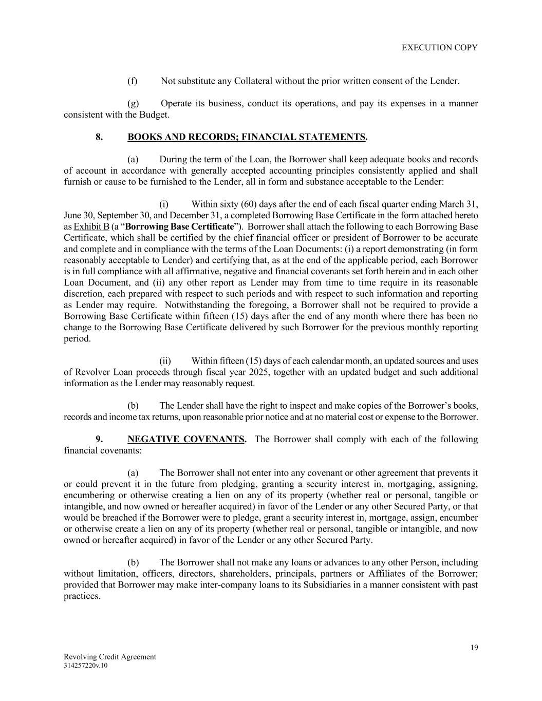 EXECUTION COPY 19 Revolving Credit Agreement 314257220v.10 (f) Not substitute any Collateral without the prior written consent of the Lender. (g) Operate its business, conduct its operations, and pay its expenses in a manner consistent with the Budget. 8. BOOKS AND RECORDS; FINANCIAL STATEMENTS. (a) During the term of the Loan, the Borrower shall keep adequate books and records of account in accordance with generally accepted accounting principles consistently applied and shall furnish or cause to be furnished to the Lender, all in form and substance acceptable to the Lender: (i) Within sixty (60) days after the end of each fiscal quarter ending March 31, June 30, September 30, and December 31, a completed Borrowing Base Certificate in the form attached hereto as Exhibit B (a “Borrowing Base Certificate”). Borrower shall attach the following to each Borrowing Base Certificate, which shall be certified by the chief financial officer or president of Borrower to be accurate and complete and in compliance with the terms of the Loan Documents: (i) a report demonstrating (in form reasonably acceptable to Lender) and certifying that, as at the end of the applicable period, each Borrower is in full compliance with all affirmative, negative and financial covenants set forth herein and in each other Loan Document, and (ii) any other report as Lender may from time to time require in its reasonable discretion, each prepared with respect to such periods and with respect to such information and reporting as Lender may require. Notwithstanding the foregoing, a Borrower shall not be required to provide a Borrowing Base Certificate within fifteen (15) days after the end of any month where there has been no change to the Borrowing Base Certificate delivered by such Borrower for the previous monthly reporting period. (ii) Within fifteen (15) days of each calendar month, an updated sources and uses of Revolver Loan proceeds through fiscal year 2025, together with an updated budget and such additional information as the Lender may reasonably request. (b) The Lender shall have the right to inspect and make copies of the Borrower’s books, records and income tax returns, upon reasonable prior notice and at no material cost or expense to the Borrower. 9. NEGATIVE COVENANTS. The Borrower shall comply with each of the following financial covenants: (a) The Borrower shall not enter into any covenant or other agreement that prevents it or could prevent it in the future from pledging, granting a security interest in, mortgaging, assigning, encumbering or otherwise creating a lien on any of its property (whether real or personal, tangible or intangible, and now owned or hereafter acquired) in favor of the Lender or any other Secured Party, or that would be breached if the Borrower were to pledge, grant a security interest in, mortgage, assign, encumber or otherwise create a lien on any of its property (whether real or personal, tangible or intangible, and now owned or hereafter acquired) in favor of the Lender or any other Secured Party. (b) The Borrower shall not make any loans or advances to any other Person, including without limitation, officers, directors, shareholders, principals, partners or Affiliates of the Borrower; provided that Borrower may make inter-company loans to its Subsidiaries in a manner consistent with past practices.