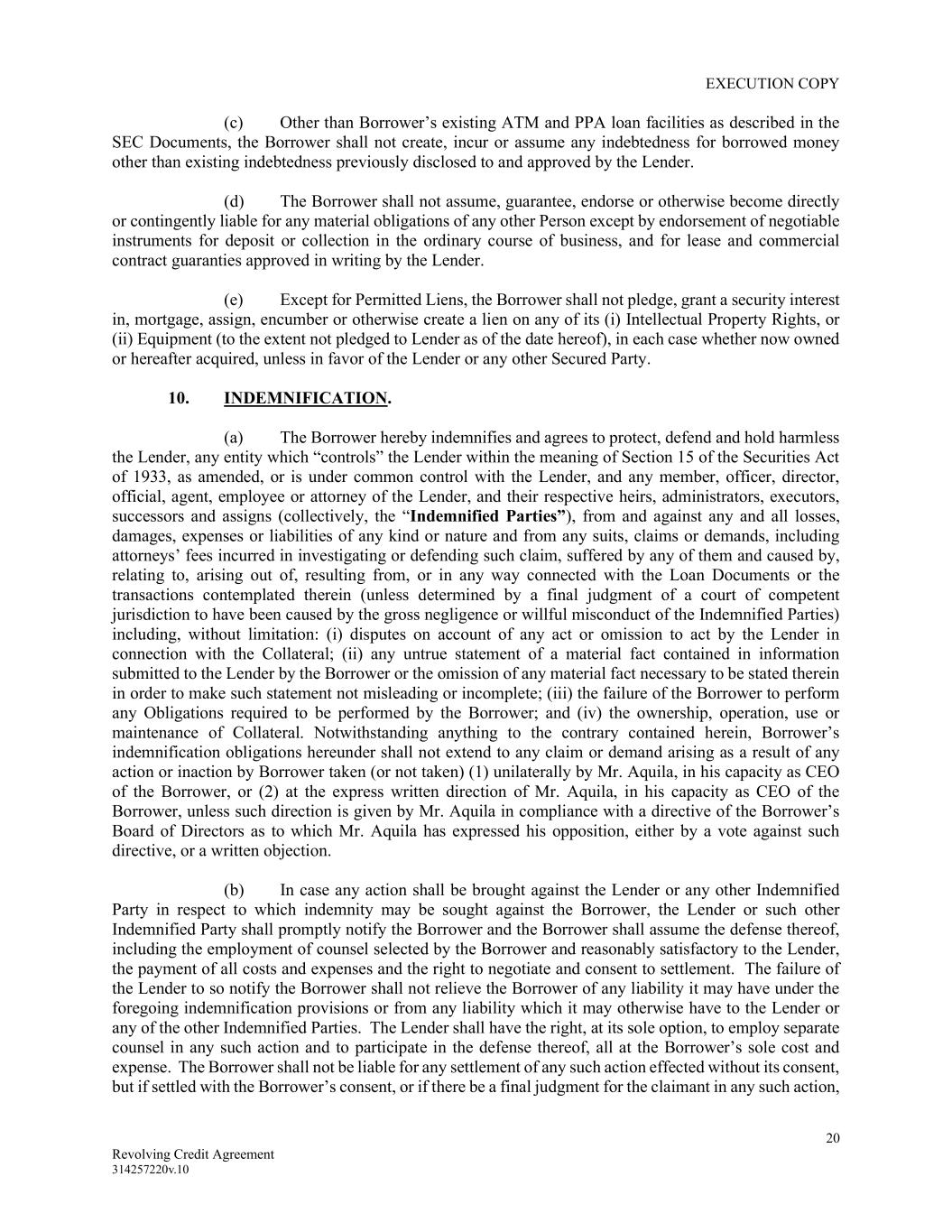 EXECUTION COPY 20 Revolving Credit Agreement 314257220v.10 (c) Other than Borrower’s existing ATM and PPA loan facilities as described in the SEC Documents, the Borrower shall not create, incur or assume any indebtedness for borrowed money other than existing indebtedness previously disclosed to and approved by the Lender. (d) The Borrower shall not assume, guarantee, endorse or otherwise become directly or contingently liable for any material obligations of any other Person except by endorsement of negotiable instruments for deposit or collection in the ordinary course of business, and for lease and commercial contract guaranties approved in writing by the Lender. (e) Except for Permitted Liens, the Borrower shall not pledge, grant a security interest in, mortgage, assign, encumber or otherwise create a lien on any of its (i) Intellectual Property Rights, or (ii) Equipment (to the extent not pledged to Lender as of the date hereof), in each case whether now owned or hereafter acquired, unless in favor of the Lender or any other Secured Party. 10. INDEMNIFICATION. (a) The Borrower hereby indemnifies and agrees to protect, defend and hold harmless the Lender, any entity which “controls” the Lender within the meaning of Section 15 of the Securities Act of 1933, as amended, or is under common control with the Lender, and any member, officer, director, official, agent, employee or attorney of the Lender, and their respective heirs, administrators, executors, successors and assigns (collectively, the “Indemnified Parties”), from and against any and all losses, damages, expenses or liabilities of any kind or nature and from any suits, claims or demands, including attorneys’ fees incurred in investigating or defending such claim, suffered by any of them and caused by, relating to, arising out of, resulting from, or in any way connected with the Loan Documents or the transactions contemplated therein (unless determined by a final judgment of a court of competent jurisdiction to have been caused by the gross negligence or willful misconduct of the Indemnified Parties) including, without limitation: (i) disputes on account of any act or omission to act by the Lender in connection with the Collateral; (ii) any untrue statement of a material fact contained in information submitted to the Lender by the Borrower or the omission of any material fact necessary to be stated therein in order to make such statement not misleading or incomplete; (iii) the failure of the Borrower to perform any Obligations required to be performed by the Borrower; and (iv) the ownership, operation, use or maintenance of Collateral. Notwithstanding anything to the contrary contained herein, Borrower’s indemnification obligations hereunder shall not extend to any claim or demand arising as a result of any action or inaction by Borrower taken (or not taken) (1) unilaterally by Mr. Aquila, in his capacity as CEO of the Borrower, or (2) at the express written direction of Mr. Aquila, in his capacity as CEO of the Borrower, unless such direction is given by Mr. Aquila in compliance with a directive of the Borrower’s Board of Directors as to which Mr. Aquila has expressed his opposition, either by a vote against such directive, or a written objection. (b) In case any action shall be brought against the Lender or any other Indemnified Party in respect to which indemnity may be sought against the Borrower, the Lender or such other Indemnified Party shall promptly notify the Borrower and the Borrower shall assume the defense thereof, including the employment of counsel selected by the Borrower and reasonably satisfactory to the Lender, the payment of all costs and expenses and the right to negotiate and consent to settlement. The failure of the Lender to so notify the Borrower shall not relieve the Borrower of any liability it may have under the foregoing indemnification provisions or from any liability which it may otherwise have to the Lender or any of the other Indemnified Parties. The Lender shall have the right, at its sole option, to employ separate counsel in any such action and to participate in the defense thereof, all at the Borrower’s sole cost and expense. The Borrower shall not be liable for any settlement of any such action effected without its consent, but if settled with the Borrower’s consent, or if there be a final judgment for the claimant in any such action,