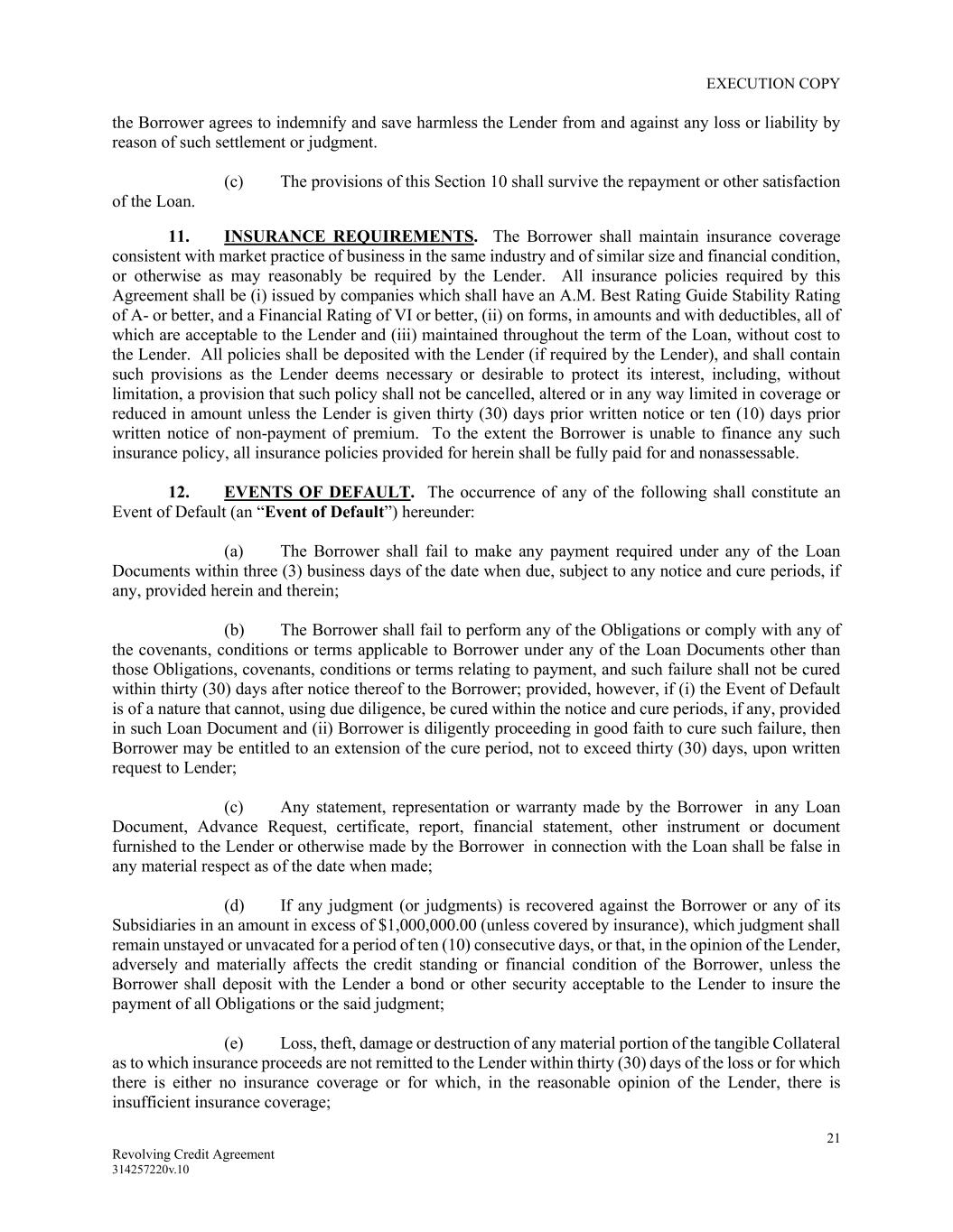 EXECUTION COPY 21 Revolving Credit Agreement 314257220v.10 the Borrower agrees to indemnify and save harmless the Lender from and against any loss or liability by reason of such settlement or judgment. (c) The provisions of this Section 10 shall survive the repayment or other satisfaction of the Loan. 11. INSURANCE REQUIREMENTS. The Borrower shall maintain insurance coverage consistent with market practice of business in the same industry and of similar size and financial condition, or otherwise as may reasonably be required by the Lender. All insurance policies required by this Agreement shall be (i) issued by companies which shall have an A.M. Best Rating Guide Stability Rating of A- or better, and a Financial Rating of VI or better, (ii) on forms, in amounts and with deductibles, all of which are acceptable to the Lender and (iii) maintained throughout the term of the Loan, without cost to the Lender. All policies shall be deposited with the Lender (if required by the Lender), and shall contain such provisions as the Lender deems necessary or desirable to protect its interest, including, without limitation, a provision that such policy shall not be cancelled, altered or in any way limited in coverage or reduced in amount unless the Lender is given thirty (30) days prior written notice or ten (10) days prior written notice of non-payment of premium. To the extent the Borrower is unable to finance any such insurance policy, all insurance policies provided for herein shall be fully paid for and nonassessable. 12. EVENTS OF DEFAULT. The occurrence of any of the following shall constitute an Event of Default (an “Event of Default”) hereunder: (a) The Borrower shall fail to make any payment required under any of the Loan Documents within three (3) business days of the date when due, subject to any notice and cure periods, if any, provided herein and therein; (b) The Borrower shall fail to perform any of the Obligations or comply with any of the covenants, conditions or terms applicable to Borrower under any of the Loan Documents other than those Obligations, covenants, conditions or terms relating to payment, and such failure shall not be cured within thirty (30) days after notice thereof to the Borrower; provided, however, if (i) the Event of Default is of a nature that cannot, using due diligence, be cured within the notice and cure periods, if any, provided in such Loan Document and (ii) Borrower is diligently proceeding in good faith to cure such failure, then Borrower may be entitled to an extension of the cure period, not to exceed thirty (30) days, upon written request to Lender; (c) Any statement, representation or warranty made by the Borrower in any Loan Document, Advance Request, certificate, report, financial statement, other instrument or document furnished to the Lender or otherwise made by the Borrower in connection with the Loan shall be false in any material respect as of the date when made; (d) If any judgment (or judgments) is recovered against the Borrower or any of its Subsidiaries in an amount in excess of $1,000,000.00 (unless covered by insurance), which judgment shall remain unstayed or unvacated for a period of ten (10) consecutive days, or that, in the opinion of the Lender, adversely and materially affects the credit standing or financial condition of the Borrower, unless the Borrower shall deposit with the Lender a bond or other security acceptable to the Lender to insure the payment of all Obligations or the said judgment; (e) Loss, theft, damage or destruction of any material portion of the tangible Collateral as to which insurance proceeds are not remitted to the Lender within thirty (30) days of the loss or for which there is either no insurance coverage or for which, in the reasonable opinion of the Lender, there is insufficient insurance coverage;