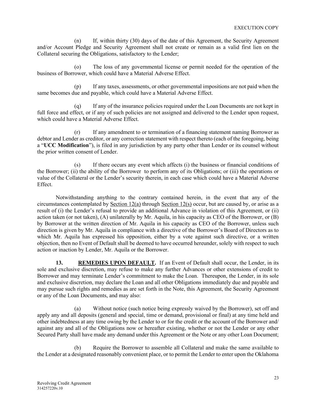 EXECUTION COPY 23 Revolving Credit Agreement 314257220v.10 (n) If, within thirty (30) days of the date of this Agreement, the Security Agreement and/or Account Pledge and Security Agreement shall not create or remain as a valid first lien on the Collateral securing the Obligations, satisfactory to the Lender; (o) The loss of any governmental license or permit needed for the operation of the business of Borrower, which could have a Material Adverse Effect. (p) If any taxes, assessments, or other governmental impositions are not paid when the same becomes due and payable, which could have a Material Adverse Effect. (q) If any of the insurance policies required under the Loan Documents are not kept in full force and effect, or if any of such policies are not assigned and delivered to the Lender upon request, which could have a Material Adverse Effect. (r) If any amendment to or termination of a financing statement naming Borrower as debtor and Lender as creditor, or any correction statement with respect thereto (each of the foregoing, being a “UCC Modification”), is filed in any jurisdiction by any party other than Lender or its counsel without the prior written consent of Lender. (s) If there occurs any event which affects (i) the business or financial conditions of the Borrower; (ii) the ability of the Borrower to perform any of its Obligations; or (iii) the operations or value of the Collateral or the Lender’s security therein, in each case which could have a Material Adverse Effect. Notwithstanding anything to the contrary contained herein, in the event that any of the circumstances contemplated by Section 12(a) through Section 12(s) occur, but are caused by, or arise as a result of (i) the Lender’s refusal to provide an additional Advance in violation of this Agreement, or (ii) action taken (or not taken), (A) unilaterally by Mr. Aquila, in his capacity as CEO of the Borrower, or (B) by Borrower at the written direction of Mr. Aquila in his capacity as CEO of the Borrower, unless such direction is given by Mr. Aquila in compliance with a directive of the Borrower’s Board of Directors as to which Mr. Aquila has expressed his opposition, either by a vote against such directive, or a written objection, then no Event of Default shall be deemed to have occurred hereunder, solely with respect to such action or inaction by Lender, Mr. Aquila or the Borrower. 13. REMEDIES UPON DEFAULT. If an Event of Default shall occur, the Lender, in its sole and exclusive discretion, may refuse to make any further Advances or other extensions of credit to Borrower and may terminate Lender’s commitment to make the Loan. Thereupon, the Lender, in its sole and exclusive discretion, may declare the Loan and all other Obligations immediately due and payable and may pursue such rights and remedies as are set forth in the Note, this Agreement, the Security Agreement or any of the Loan Documents, and may also: (a) Without notice (such notice being expressly waived by the Borrower), set off and apply any and all deposits (general and special, time or demand, provisional or final) at any time held and other indebtedness at any time owing by the Lender to or for the credit or the account of the Borrower and/ against any and all of the Obligations now or hereafter existing, whether or not the Lender or any other Secured Party shall have made any demand under this Agreement or the Note or any other Loan Document; (b) Require the Borrower to assemble all Collateral and make the same available to the Lender at a designated reasonably convenient place, or to permit the Lender to enter upon the Oklahoma