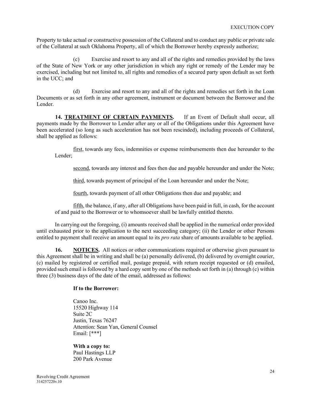 EXECUTION COPY 24 Revolving Credit Agreement 314257220v.10 Property to take actual or constructive possession of the Collateral and to conduct any public or private sale of the Collateral at such Oklahoma Property, all of which the Borrower hereby expressly authorize; (c) Exercise and resort to any and all of the rights and remedies provided by the laws of the State of New York or any other jurisdiction in which any right or remedy of the Lender may be exercised, including but not limited to, all rights and remedies of a secured party upon default as set forth in the UCC; and (d) Exercise and resort to any and all of the rights and remedies set forth in the Loan Documents or as set forth in any other agreement, instrument or document between the Borrower and the Lender. 14. TREATMENT OF CERTAIN PAYMENTS. If an Event of Default shall occur, all payments made by the Borrower to Lender after any or all of the Obligations under this Agreement have been accelerated (so long as such acceleration has not been rescinded), including proceeds of Collateral, shall be applied as follows: first, towards any fees, indemnities or expense reimbursements then due hereunder to the Lender; second, towards any interest and fees then due and payable hereunder and under the Note; third, towards payment of principal of the Loan hereunder and under the Note; fourth, towards payment of all other Obligations then due and payable; and fifth, the balance, if any, after all Obligations have been paid in full, in cash, for the account of and paid to the Borrower or to whomsoever shall be lawfully entitled thereto. In carrying out the foregoing, (i) amounts received shall be applied in the numerical order provided until exhausted prior to the application to the next succeeding category; (ii) the Lender or other Persons entitled to payment shall receive an amount equal to its pro rata share of amounts available to be applied. 16. NOTICES. All notices or other communications required or otherwise given pursuant to this Agreement shall be in writing and shall be (a) personally delivered, (b) delivered by overnight courier, (c) mailed by registered or certified mail, postage prepaid, with return receipt requested or (d) emailed, provided such email is followed by a hard copy sent by one of the methods set forth in (a) through (c) within three (3) business days of the date of the email, addressed as follows: If to the Borrower: Canoo Inc. 15520 Highway 114 Suite 2C Justin, Texas 76247 Attention: Sean Yan, General Counsel Email: [***] With a copy to: Paul Hastings LLP 200 Park Avenue