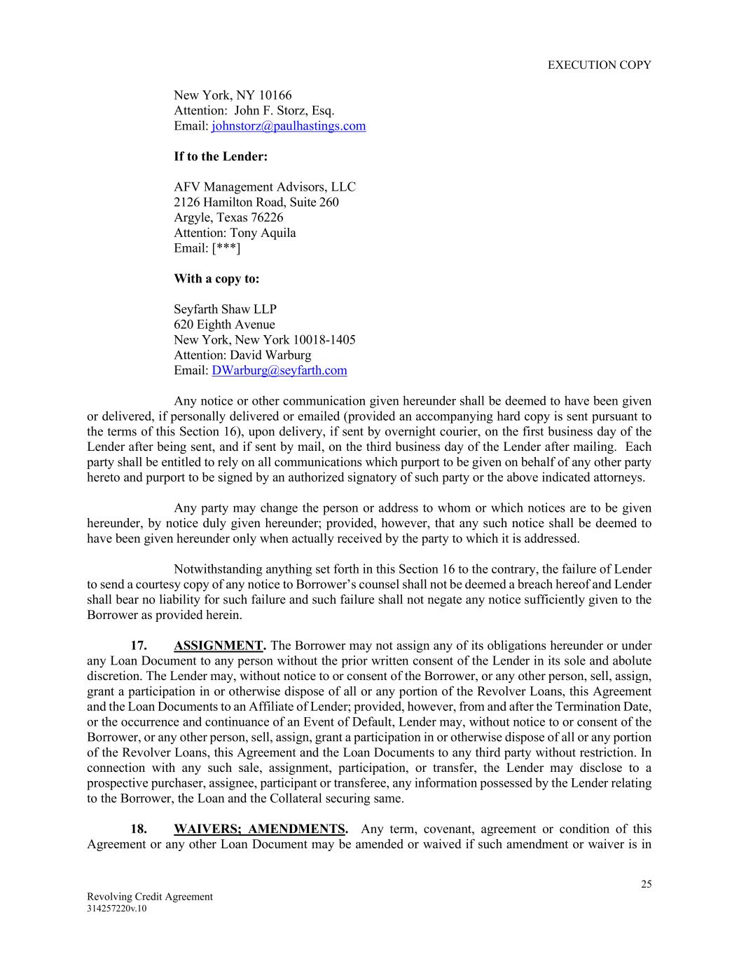 EXECUTION COPY 25 Revolving Credit Agreement 314257220v.10 New York, NY 10166 Attention: John F. Storz, Esq. Email: johnstorz@paulhastings.com If to the Lender: AFV Management Advisors, LLC 2126 Hamilton Road, Suite 260 Argyle, Texas 76226 Attention: Tony Aquila Email: [***] With a copy to: Seyfarth Shaw LLP 620 Eighth Avenue New York, New York 10018-1405 Attention: David Warburg Email: DWarburg@seyfarth.com Any notice or other communication given hereunder shall be deemed to have been given or delivered, if personally delivered or emailed (provided an accompanying hard copy is sent pursuant to the terms of this Section 16), upon delivery, if sent by overnight courier, on the first business day of the Lender after being sent, and if sent by mail, on the third business day of the Lender after mailing. Each party shall be entitled to rely on all communications which purport to be given on behalf of any other party hereto and purport to be signed by an authorized signatory of such party or the above indicated attorneys. Any party may change the person or address to whom or which notices are to be given hereunder, by notice duly given hereunder; provided, however, that any such notice shall be deemed to have been given hereunder only when actually received by the party to which it is addressed. Notwithstanding anything set forth in this Section 16 to the contrary, the failure of Lender to send a courtesy copy of any notice to Borrower’s counsel shall not be deemed a breach hereof and Lender shall bear no liability for such failure and such failure shall not negate any notice sufficiently given to the Borrower as provided herein. 17. ASSIGNMENT. The Borrower may not assign any of its obligations hereunder or under any Loan Document to any person without the prior written consent of the Lender in its sole and abolute discretion. The Lender may, without notice to or consent of the Borrower, or any other person, sell, assign, grant a participation in or otherwise dispose of all or any portion of the Revolver Loans, this Agreement and the Loan Documents to an Affiliate of Lender; provided, however, from and after the Termination Date, or the occurrence and continuance of an Event of Default, Lender may, without notice to or consent of the Borrower, or any other person, sell, assign, grant a participation in or otherwise dispose of all or any portion of the Revolver Loans, this Agreement and the Loan Documents to any third party without restriction. In connection with any such sale, assignment, participation, or transfer, the Lender may disclose to a prospective purchaser, assignee, participant or transferee, any information possessed by the Lender relating to the Borrower, the Loan and the Collateral securing same. 18. WAIVERS; AMENDMENTS. Any term, covenant, agreement or condition of this Agreement or any other Loan Document may be amended or waived if such amendment or waiver is in