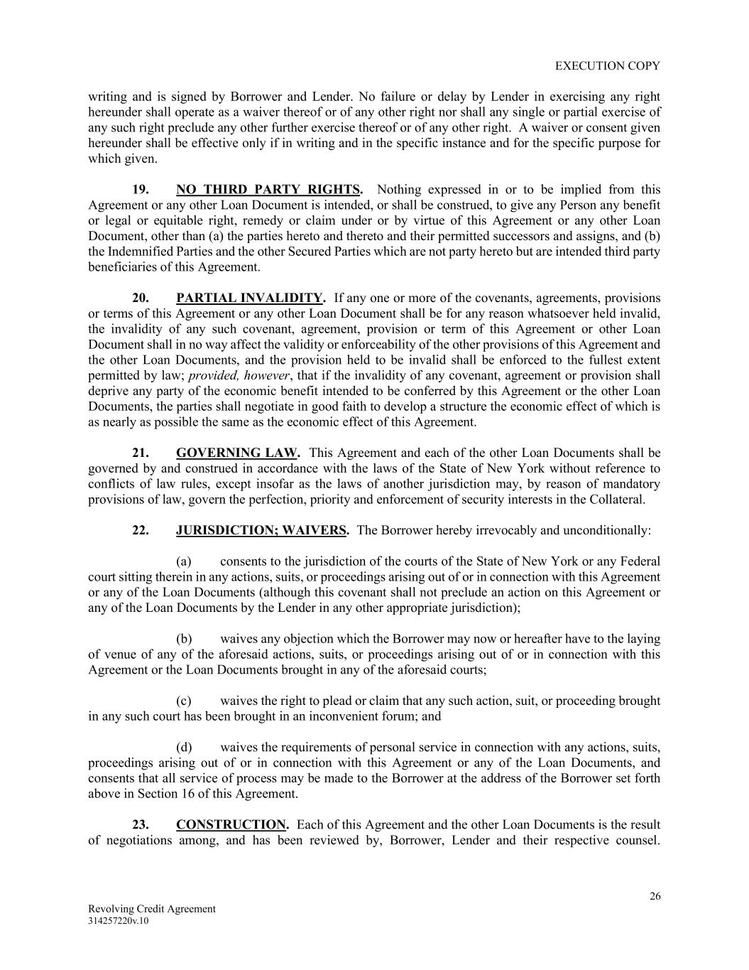 EXECUTION COPY 26 Revolving Credit Agreement 314257220v.10 writing and is signed by Borrower and Lender. No failure or delay by Lender in exercising any right hereunder shall operate as a waiver thereof or of any other right nor shall any single or partial exercise of any such right preclude any other further exercise thereof or of any other right. A waiver or consent given hereunder shall be effective only if in writing and in the specific instance and for the specific purpose for which given. 19. NO THIRD PARTY RIGHTS. Nothing expressed in or to be implied from this Agreement or any other Loan Document is intended, or shall be construed, to give any Person any benefit or legal or equitable right, remedy or claim under or by virtue of this Agreement or any other Loan Document, other than (a) the parties hereto and thereto and their permitted successors and assigns, and (b) the Indemnified Parties and the other Secured Parties which are not party hereto but are intended third party beneficiaries of this Agreement. 20. PARTIAL INVALIDITY. If any one or more of the covenants, agreements, provisions or terms of this Agreement or any other Loan Document shall be for any reason whatsoever held invalid, the invalidity of any such covenant, agreement, provision or term of this Agreement or other Loan Document shall in no way affect the validity or enforceability of the other provisions of this Agreement and the other Loan Documents, and the provision held to be invalid shall be enforced to the fullest extent permitted by law; provided, however, that if the invalidity of any covenant, agreement or provision shall deprive any party of the economic benefit intended to be conferred by this Agreement or the other Loan Documents, the parties shall negotiate in good faith to develop a structure the economic effect of which is as nearly as possible the same as the economic effect of this Agreement. 21. GOVERNING LAW. This Agreement and each of the other Loan Documents shall be governed by and construed in accordance with the laws of the State of New York without reference to conflicts of law rules, except insofar as the laws of another jurisdiction may, by reason of mandatory provisions of law, govern the perfection, priority and enforcement of security interests in the Collateral. 22. JURISDICTION; WAIVERS. The Borrower hereby irrevocably and unconditionally: (a) consents to the jurisdiction of the courts of the State of New York or any Federal court sitting therein in any actions, suits, or proceedings arising out of or in connection with this Agreement or any of the Loan Documents (although this covenant shall not preclude an action on this Agreement or any of the Loan Documents by the Lender in any other appropriate jurisdiction); (b) waives any objection which the Borrower may now or hereafter have to the laying of venue of any of the aforesaid actions, suits, or proceedings arising out of or in connection with this Agreement or the Loan Documents brought in any of the aforesaid courts; (c) waives the right to plead or claim that any such action, suit, or proceeding brought in any such court has been brought in an inconvenient forum; and (d) waives the requirements of personal service in connection with any actions, suits, proceedings arising out of or in connection with this Agreement or any of the Loan Documents, and consents that all service of process may be made to the Borrower at the address of the Borrower set forth above in Section 16 of this Agreement. 23. CONSTRUCTION. Each of this Agreement and the other Loan Documents is the result of negotiations among, and has been reviewed by, Borrower, Lender and their respective counsel.