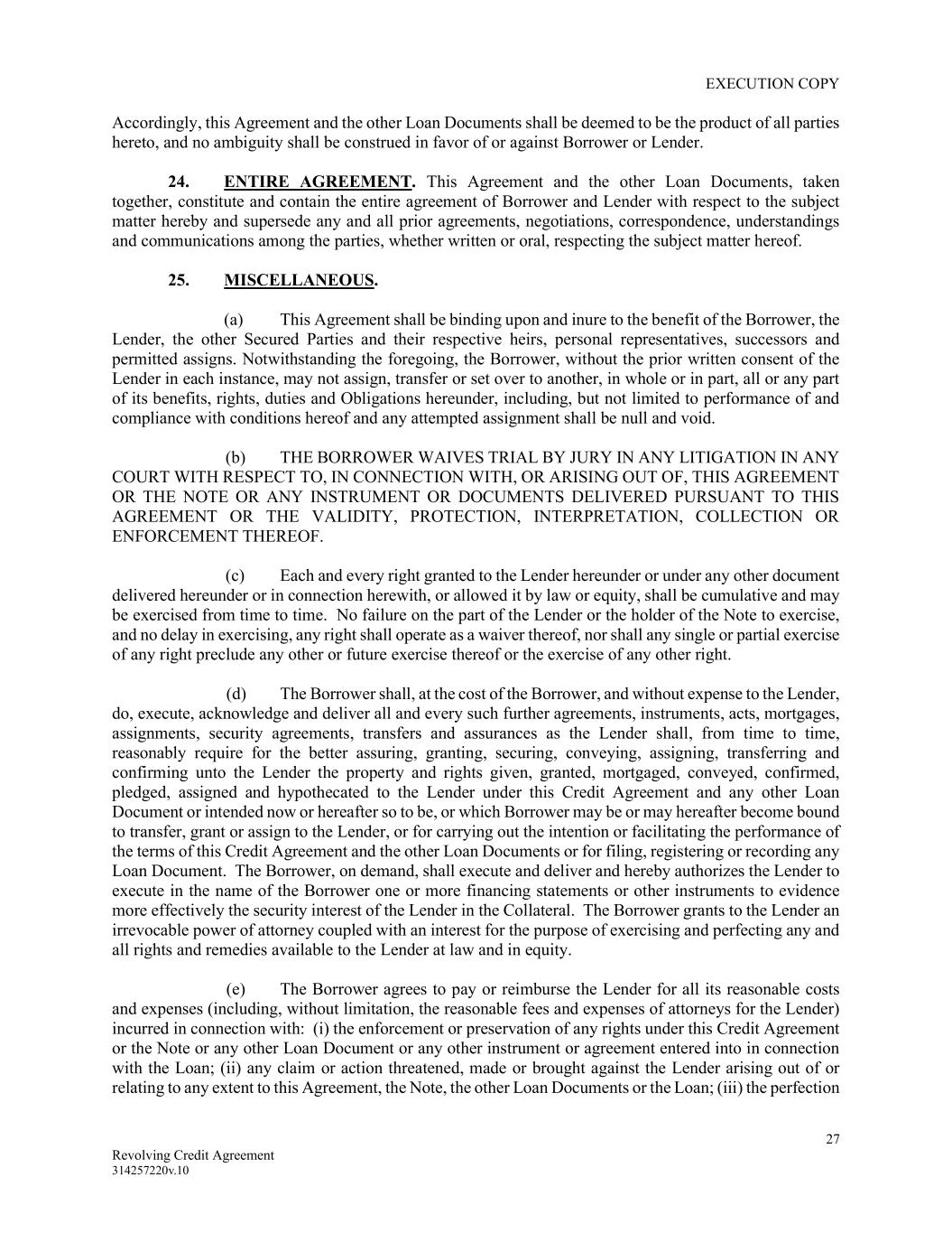 EXECUTION COPY 27 Revolving Credit Agreement 314257220v.10 Accordingly, this Agreement and the other Loan Documents shall be deemed to be the product of all parties hereto, and no ambiguity shall be construed in favor of or against Borrower or Lender. 24. ENTIRE AGREEMENT. This Agreement and the other Loan Documents, taken together, constitute and contain the entire agreement of Borrower and Lender with respect to the subject matter hereby and supersede any and all prior agreements, negotiations, correspondence, understandings and communications among the parties, whether written or oral, respecting the subject matter hereof. 25. MISCELLANEOUS. (a) This Agreement shall be binding upon and inure to the benefit of the Borrower, the Lender, the other Secured Parties and their respective heirs, personal representatives, successors and permitted assigns. Notwithstanding the foregoing, the Borrower, without the prior written consent of the Lender in each instance, may not assign, transfer or set over to another, in whole or in part, all or any part of its benefits, rights, duties and Obligations hereunder, including, but not limited to performance of and compliance with conditions hereof and any attempted assignment shall be null and void. (b) THE BORROWER WAIVES TRIAL BY JURY IN ANY LITIGATION IN ANY COURT WITH RESPECT TO, IN CONNECTION WITH, OR ARISING OUT OF, THIS AGREEMENT OR THE NOTE OR ANY INSTRUMENT OR DOCUMENTS DELIVERED PURSUANT TO THIS AGREEMENT OR THE VALIDITY, PROTECTION, INTERPRETATION, COLLECTION OR ENFORCEMENT THEREOF. (c) Each and every right granted to the Lender hereunder or under any other document delivered hereunder or in connection herewith, or allowed it by law or equity, shall be cumulative and may be exercised from time to time. No failure on the part of the Lender or the holder of the Note to exercise, and no delay in exercising, any right shall operate as a waiver thereof, nor shall any single or partial exercise of any right preclude any other or future exercise thereof or the exercise of any other right. (d) The Borrower shall, at the cost of the Borrower, and without expense to the Lender, do, execute, acknowledge and deliver all and every such further agreements, instruments, acts, mortgages, assignments, security agreements, transfers and assurances as the Lender shall, from time to time, reasonably require for the better assuring, granting, securing, conveying, assigning, transferring and confirming unto the Lender the property and rights given, granted, mortgaged, conveyed, confirmed, pledged, assigned and hypothecated to the Lender under this Credit Agreement and any other Loan Document or intended now or hereafter so to be, or which Borrower may be or may hereafter become bound to transfer, grant or assign to the Lender, or for carrying out the intention or facilitating the performance of the terms of this Credit Agreement and the other Loan Documents or for filing, registering or recording any Loan Document. The Borrower, on demand, shall execute and deliver and hereby authorizes the Lender to execute in the name of the Borrower one or more financing statements or other instruments to evidence more effectively the security interest of the Lender in the Collateral. The Borrower grants to the Lender an irrevocable power of attorney coupled with an interest for the purpose of exercising and perfecting any and all rights and remedies available to the Lender at law and in equity. (e) The Borrower agrees to pay or reimburse the Lender for all its reasonable costs and expenses (including, without limitation, the reasonable fees and expenses of attorneys for the Lender) incurred in connection with: (i) the enforcement or preservation of any rights under this Credit Agreement or the Note or any other Loan Document or any other instrument or agreement entered into in connection with the Loan; (ii) any claim or action threatened, made or brought against the Lender arising out of or relating to any extent to this Agreement, the Note, the other Loan Documents or the Loan; (iii) the perfection