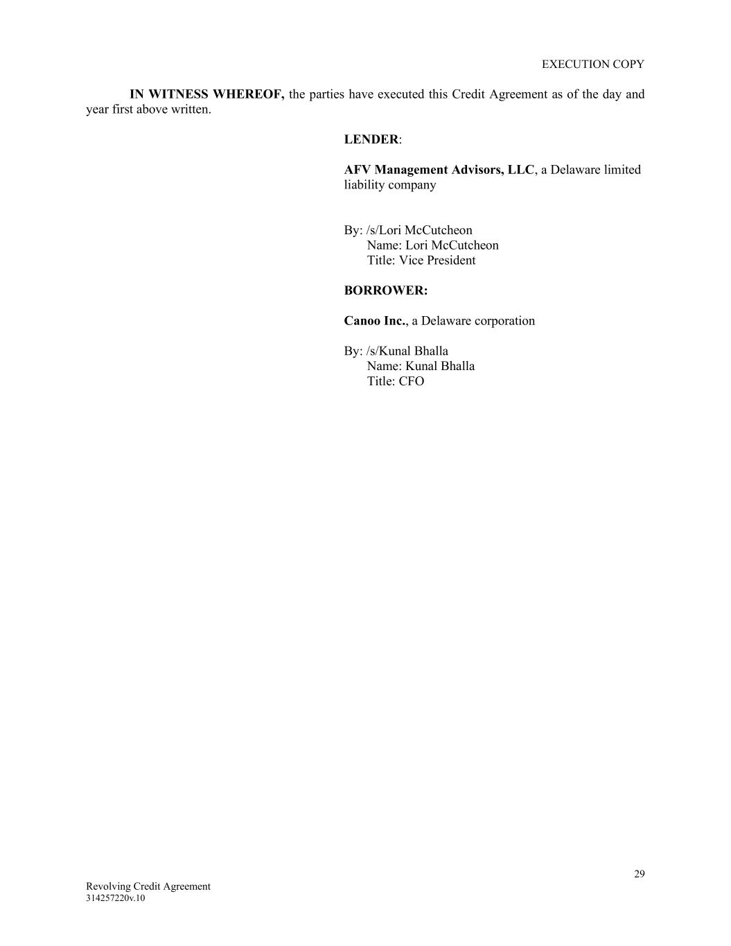 EXECUTION COPY 29 Revolving Credit Agreement 314257220v.10 IN WITNESS WHEREOF, the parties have executed this Credit Agreement as of the day and year first above written. LENDER: AFV Management Advisors, LLC, a Delaware limited liability company By: /s/Lori McCutcheon Name: Lori McCutcheon Title: Vice President BORROWER: Canoo Inc., a Delaware corporation By: /s/Kunal Bhalla Name: Kunal Bhalla Title: CFO