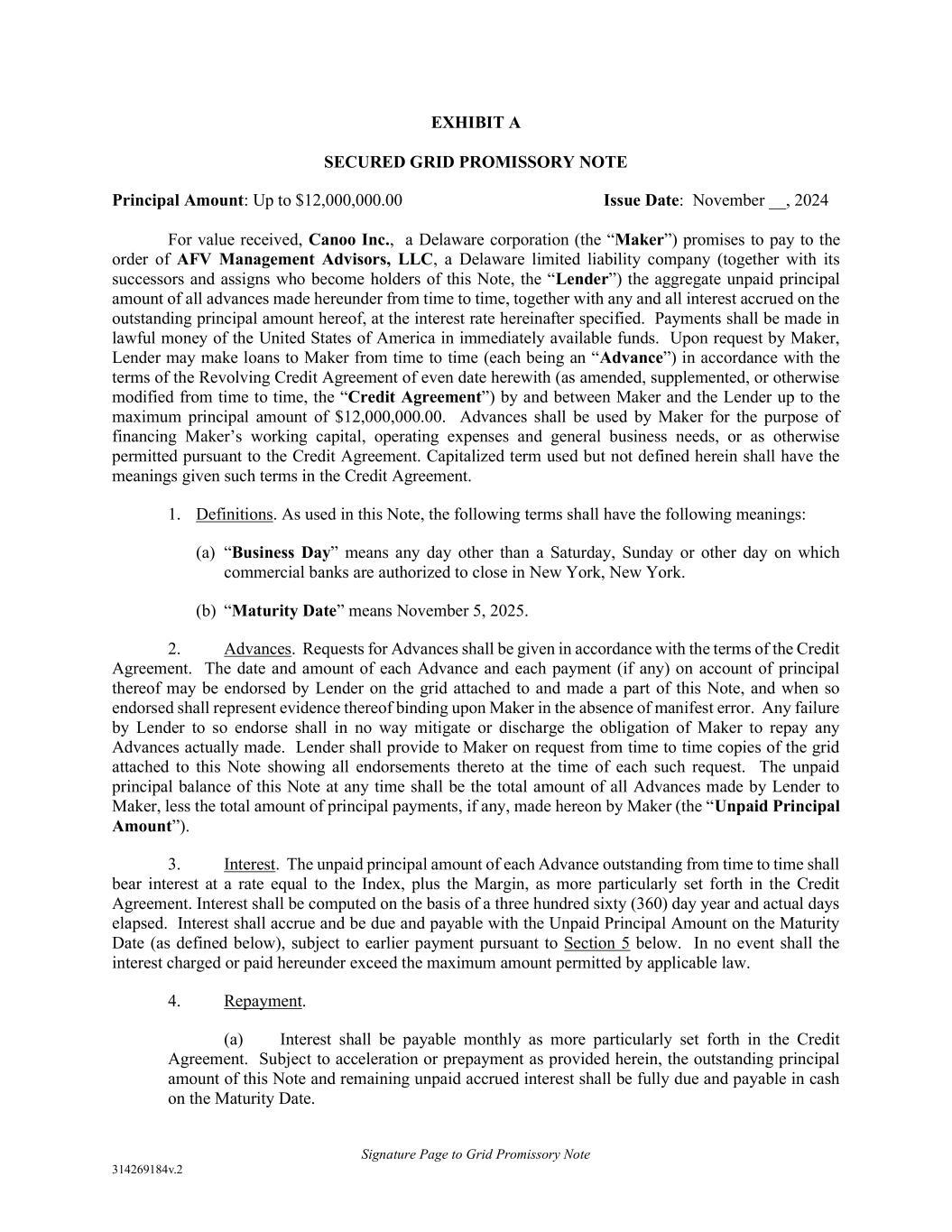 Signature Page to Grid Promissory Note 314269184v.2 EXHIBIT A SECURED GRID PROMISSORY NOTE Principal Amount: Up to $12,000,000.00 Issue Date: November __, 2024 For value received, Canoo Inc., a Delaware corporation (the “Maker”) promises to pay to the order of AFV Management Advisors, LLC, a Delaware limited liability company (together with its successors and assigns who become holders of this Note, the “Lender”) the aggregate unpaid principal amount of all advances made hereunder from time to time, together with any and all interest accrued on the outstanding principal amount hereof, at the interest rate hereinafter specified. Payments shall be made in lawful money of the United States of America in immediately available funds. Upon request by Maker, Lender may make loans to Maker from time to time (each being an “Advance”) in accordance with the terms of the Revolving Credit Agreement of even date herewith (as amended, supplemented, or otherwise modified from time to time, the “Credit Agreement”) by and between Maker and the Lender up to the maximum principal amount of $12,000,000.00. Advances shall be used by Maker for the purpose of financing Maker’s working capital, operating expenses and general business needs, or as otherwise permitted pursuant to the Credit Agreement. Capitalized term used but not defined herein shall have the meanings given such terms in the Credit Agreement. 1. Definitions. As used in this Note, the following terms shall have the following meanings: (a) “Business Day” means any day other than a Saturday, Sunday or other day on which commercial banks are authorized to close in New York, New York. (b) “Maturity Date” means November 5, 2025. 2. Advances. Requests for Advances shall be given in accordance with the terms of the Credit Agreement. The date and amount of each Advance and each payment (if any) on account of principal thereof may be endorsed by Lender on the grid attached to and made a part of this Note, and when so endorsed shall represent evidence thereof binding upon Maker in the absence of manifest error. Any failure by Lender to so endorse shall in no way mitigate or discharge the obligation of Maker to repay any Advances actually made. Lender shall provide to Maker on request from time to time copies of the grid attached to this Note showing all endorsements thereto at the time of each such request. The unpaid principal balance of this Note at any time shall be the total amount of all Advances made by Lender to Maker, less the total amount of principal payments, if any, made hereon by Maker (the “Unpaid Principal Amount”). 3. Interest. The unpaid principal amount of each Advance outstanding from time to time shall bear interest at a rate equal to the Index, plus the Margin, as more particularly set forth in the Credit Agreement. Interest shall be computed on the basis of a three hundred sixty (360) day year and actual days elapsed. Interest shall accrue and be due and payable with the Unpaid Principal Amount on the Maturity Date (as defined below), subject to earlier payment pursuant to Section 5 below. In no event shall the interest charged or paid hereunder exceed the maximum amount permitted by applicable law. 4. Repayment. (a) Interest shall be payable monthly as more particularly set forth in the Credit Agreement. Subject to acceleration or prepayment as provided herein, the outstanding principal amount of this Note and remaining unpaid accrued interest shall be fully due and payable in cash on the Maturity Date.