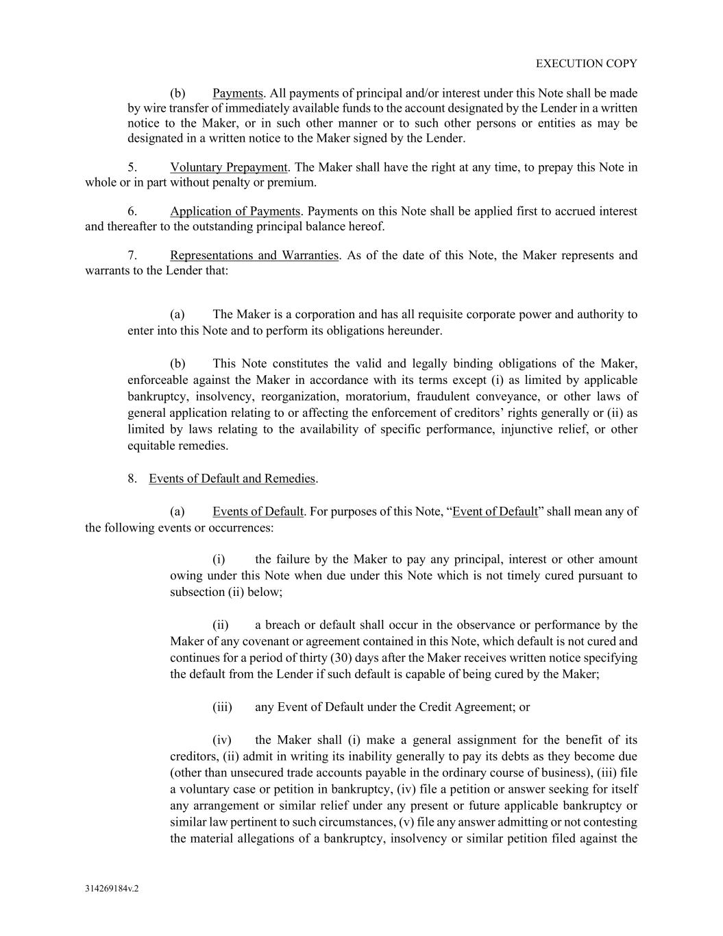 EXECUTION COPY 314269184v.2 (b) Payments. All payments of principal and/or interest under this Note shall be made by wire transfer of immediately available funds to the account designated by the Lender in a written notice to the Maker, or in such other manner or to such other persons or entities as may be designated in a written notice to the Maker signed by the Lender. 5. Voluntary Prepayment. The Maker shall have the right at any time, to prepay this Note in whole or in part without penalty or premium. 6. Application of Payments. Payments on this Note shall be applied first to accrued interest and thereafter to the outstanding principal balance hereof. 7. Representations and Warranties. As of the date of this Note, the Maker represents and warrants to the Lender that: (a) The Maker is a corporation and has all requisite corporate power and authority to enter into this Note and to perform its obligations hereunder. (b) This Note constitutes the valid and legally binding obligations of the Maker, enforceable against the Maker in accordance with its terms except (i) as limited by applicable bankruptcy, insolvency, reorganization, moratorium, fraudulent conveyance, or other laws of general application relating to or affecting the enforcement of creditors’ rights generally or (ii) as limited by laws relating to the availability of specific performance, injunctive relief, or other equitable remedies. 8. Events of Default and Remedies. (a) Events of Default. For purposes of this Note, “Event of Default” shall mean any of the following events or occurrences: (i) the failure by the Maker to pay any principal, interest or other amount owing under this Note when due under this Note which is not timely cured pursuant to subsection (ii) below; (ii) a breach or default shall occur in the observance or performance by the Maker of any covenant or agreement contained in this Note, which default is not cured and continues for a period of thirty (30) days after the Maker receives written notice specifying the default from the Lender if such default is capable of being cured by the Maker; (iii) any Event of Default under the Credit Agreement; or (iv) the Maker shall (i) make a general assignment for the benefit of its creditors, (ii) admit in writing its inability generally to pay its debts as they become due (other than unsecured trade accounts payable in the ordinary course of business), (iii) file a voluntary case or petition in bankruptcy, (iv) file a petition or answer seeking for itself any arrangement or similar relief under any present or future applicable bankruptcy or similar law pertinent to such circumstances, (v) file any answer admitting or not contesting the material allegations of a bankruptcy, insolvency or similar petition filed against the