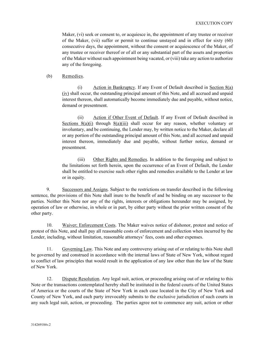EXECUTION COPY 314269184v.2 Maker, (vi) seek or consent to, or acquiesce in, the appointment of any trustee or receiver of the Maker, (vii) suffer or permit to continue unstayed and in effect for sixty (60) consecutive days, the appointment, without the consent or acquiescence of the Maker, of any trustee or receiver thereof or of all or any substantial part of the assets and properties of the Maker without such appointment being vacated, or (viii) take any action to authorize any of the foregoing. (b) Remedies. (i) Action in Bankruptcy. If any Event of Default described in Section 8(a) (iv) shall occur, the outstanding principal amount of this Note, and all accrued and unpaid interest thereon, shall automatically become immediately due and payable, without notice, demand or presentment. (ii) Action if Other Event of Default. If any Event of Default described in Sections 8(a)(i) through 8(a)(iii) shall occur for any reason, whether voluntary or involuntary, and be continuing, the Lender may, by written notice to the Maker, declare all or any portion of the outstanding principal amount of this Note, and all accrued and unpaid interest thereon, immediately due and payable, without further notice, demand or presentment. (iii) Other Rights and Remedies. In addition to the foregoing and subject to the limitations set forth herein, upon the occurrence of an Event of Default, the Lender shall be entitled to exercise such other rights and remedies available to the Lender at law or in equity. 9. Successors and Assigns. Subject to the restrictions on transfer described in the following sentence, the provisions of this Note shall inure to the benefit of and be binding on any successor to the parties. Neither this Note nor any of the rights, interests or obligations hereunder may be assigned, by operation of law or otherwise, in whole or in part, by either party without the prior written consent of the other party. 10. Waiver; Enforcement Costs. The Maker waives notice of dishonor, protest and notice of protest of this Note, and shall pay all reasonable costs of enforcement and collection when incurred by the Lender, including, without limitation, reasonable attorneys’ fees, costs and other expenses. 11. Governing Law. This Note and any controversy arising out of or relating to this Note shall be governed by and construed in accordance with the internal laws of State of New York, without regard to conflict of law principles that would result in the application of any law other than the law of the State of New York. 12. Dispute Resolution. Any legal suit, action, or proceeding arising out of or relating to this Note or the transactions contemplated hereby shall be instituted in the federal courts of the United States of America or the courts of the State of New York in each case located in the City of New York and County of New York, and each party irrevocably submits to the exclusive jurisdiction of such courts in any such legal suit, action, or proceeding. The parties agree not to commence any suit, action or other
