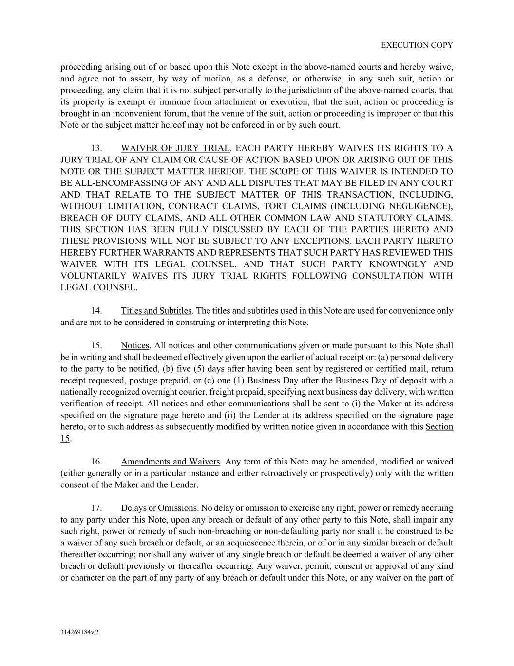 EXECUTION COPY 314269184v.2 proceeding arising out of or based upon this Note except in the above-named courts and hereby waive, and agree not to assert, by way of motion, as a defense, or otherwise, in any such suit, action or proceeding, any claim that it is not subject personally to the jurisdiction of the above-named courts, that its property is exempt or immune from attachment or execution, that the suit, action or proceeding is brought in an inconvenient forum, that the venue of the suit, action or proceeding is improper or that this Note or the subject matter hereof may not be enforced in or by such court. 13. WAIVER OF JURY TRIAL. EACH PARTY HEREBY WAIVES ITS RIGHTS TO A JURY TRIAL OF ANY CLAIM OR CAUSE OF ACTION BASED UPON OR ARISING OUT OF THIS NOTE OR THE SUBJECT MATTER HEREOF. THE SCOPE OF THIS WAIVER IS INTENDED TO BE ALL-ENCOMPASSING OF ANY AND ALL DISPUTES THAT MAY BE FILED IN ANY COURT AND THAT RELATE TO THE SUBJECT MATTER OF THIS TRANSACTION, INCLUDING, WITHOUT LIMITATION, CONTRACT CLAIMS, TORT CLAIMS (INCLUDING NEGLIGENCE), BREACH OF DUTY CLAIMS, AND ALL OTHER COMMON LAW AND STATUTORY CLAIMS. THIS SECTION HAS BEEN FULLY DISCUSSED BY EACH OF THE PARTIES HERETO AND THESE PROVISIONS WILL NOT BE SUBJECT TO ANY EXCEPTIONS. EACH PARTY HERETO HEREBY FURTHER WARRANTS AND REPRESENTS THAT SUCH PARTY HAS REVIEWED THIS WAIVER WITH ITS LEGAL COUNSEL, AND THAT SUCH PARTY KNOWINGLY AND VOLUNTARILY WAIVES ITS JURY TRIAL RIGHTS FOLLOWING CONSULTATION WITH LEGAL COUNSEL. 14. Titles and Subtitles. The titles and subtitles used in this Note are used for convenience only and are not to be considered in construing or interpreting this Note. 15. Notices. All notices and other communications given or made pursuant to this Note shall be in writing and shall be deemed effectively given upon the earlier of actual receipt or: (a) personal delivery to the party to be notified, (b) five (5) days after having been sent by registered or certified mail, return receipt requested, postage prepaid, or (c) one (1) Business Day after the Business Day of deposit with a nationally recognized overnight courier, freight prepaid, specifying next business day delivery, with written verification of receipt. All notices and other communications shall be sent to (i) the Maker at its address specified on the signature page hereto and (ii) the Lender at its address specified on the signature page hereto, or to such address as subsequently modified by written notice given in accordance with this Section 15. 16. Amendments and Waivers. Any term of this Note may be amended, modified or waived (either generally or in a particular instance and either retroactively or prospectively) only with the written consent of the Maker and the Lender. 17. Delays or Omissions. No delay or omission to exercise any right, power or remedy accruing to any party under this Note, upon any breach or default of any other party to this Note, shall impair any such right, power or remedy of such non-breaching or non-defaulting party nor shall it be construed to be a waiver of any such breach or default, or an acquiescence therein, or of or in any similar breach or default thereafter occurring; nor shall any waiver of any single breach or default be deemed a waiver of any other breach or default previously or thereafter occurring. Any waiver, permit, consent or approval of any kind or character on the part of any party of any breach or default under this Note, or any waiver on the part of