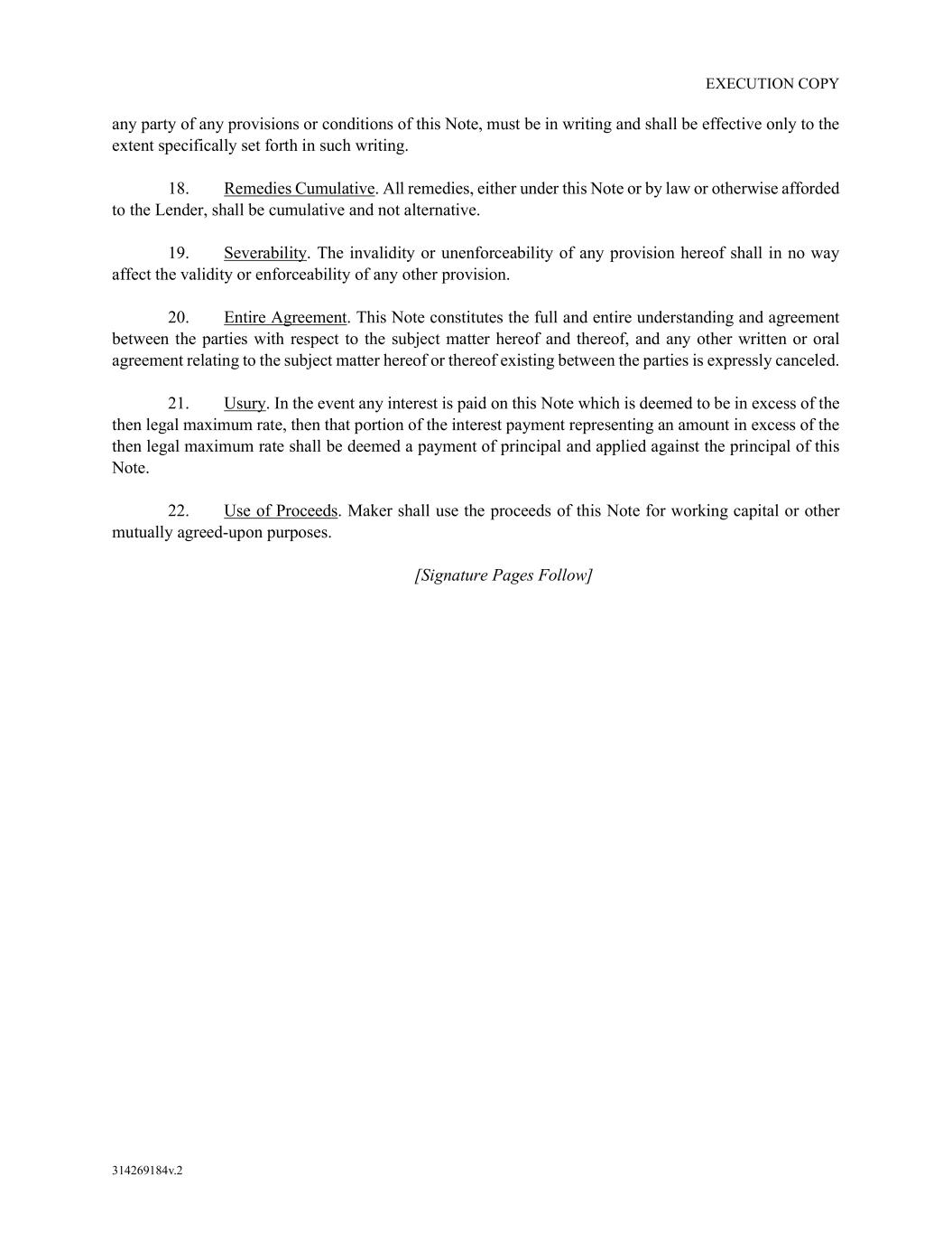 EXECUTION COPY 314269184v.2 any party of any provisions or conditions of this Note, must be in writing and shall be effective only to the extent specifically set forth in such writing. 18. Remedies Cumulative. All remedies, either under this Note or by law or otherwise afforded to the Lender, shall be cumulative and not alternative. 19. Severability. The invalidity or unenforceability of any provision hereof shall in no way affect the validity or enforceability of any other provision. 20. Entire Agreement. This Note constitutes the full and entire understanding and agreement between the parties with respect to the subject matter hereof and thereof, and any other written or oral agreement relating to the subject matter hereof or thereof existing between the parties is expressly canceled. 21. Usury. In the event any interest is paid on this Note which is deemed to be in excess of the then legal maximum rate, then that portion of the interest payment representing an amount in excess of the then legal maximum rate shall be deemed a payment of principal and applied against the principal of this Note. 22. Use of Proceeds. Maker shall use the proceeds of this Note for working capital or other mutually agreed-upon purposes. [Signature Pages Follow]