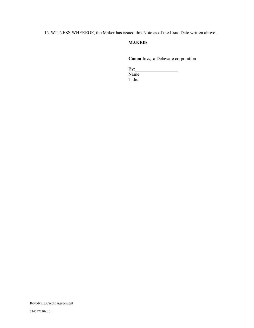 Revolving Credit Agreement 314257220v.10 IN WITNESS WHEREOF, the Maker has issued this Note as of the Issue Date written above. MAKER: Canoo Inc., a Delaware corporation By:___________________ Name: Title: