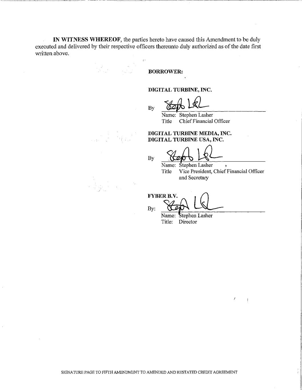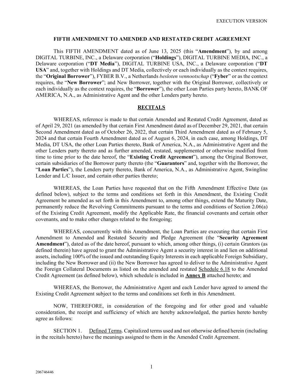EXECUTION VERSION 1 206746446 FIFTH AMENDMENT TO AMENDED AND RESTATED CREDIT AGREEMENT This FIFTH AMENDMENT dated as of June 13, 2025 (this “Amendment”), by and among DIGITAL TURBINE, INC., a Delaware corporation (“Holdings”), DIGITAL TURBINE MEDIA, INC., a Delaware corporation (“DT Media”), DIGITAL TURBINE USA, INC., a Delaware corporation (“DT USA” and, together with Holdings and DT Media, collectively or each individually as the context requires, the “Original Borrower”), FYBER B.V., a Netherlands besloten vennootschap (“Fyber” or as the context requires, the “New Borrower”; and New Borrower, together with the Original Borrower, collectively or each individually as the context requires, the “Borrower”), the other Loan Parties party hereto, BANK OF AMERICA, N.A., as Administrative Agent and the other Lenders party hereto. RECITALS WHEREAS, reference is made to that certain Amended and Restated Credit Agreement, dated as of April 29, 2021 (as amended by that certain First Amendment dated as of December 29, 2021, that certain Second Amendment dated as of October 26, 2022, that certain Third Amendment dated as of February 5, 2024 and that certain Fourth Amendment dated as of August 6, 2024, in each case, among Holdings, DT Media, DT USA, the other Loan Parties thereto, Bank of America, N.A., as Administrative Agent and the other Lenders party thereto and as further amended, restated, supplemented or otherwise modified from time to time prior to the date hereof, the “Existing Credit Agreement”), among the Original Borrower, certain subsidiaries of the Borrower party thereto (the “Guarantors” and, together with the Borrower, the “Loan Parties”), the Lenders party thereto, Bank of America, N.A., as Administrative Agent, Swingline Lender and L/C Issuer, and certain other parties thereto; WHEREAS, the Loan Parties have requested that on the Fifth Amendment Effective Date (as defined below), subject to the terms and conditions set forth in this Amendment, the Existing Credit Agreement be amended as set forth in this Amendment to, among other things, extend the Maturity Date, permanently reduce the Revolving Commitments pursuant to the terms and conditions of Section 2.06(a) of the Existing Credit Agreement, modify the Applicable Rate, the financial covenants and certain other covenants, and to make other changes related to the foregoing; WHEREAS, concurrently with this Amendment, the Loan Parties are executing that certain First Amendment to Amended and Restated Security and Pledge Agreement (the “Security Agreement Amendment”), dated as of the date hereof, pursuant to which, among other things, (i) certain Grantors (as defined therein) have agreed to grant the Administrative Agent a security interest in and lien on additional assets, including 100% of the issued and outstanding Equity Interests in each applicable Foreign Subsidiary, including the New Borrower and (ii) the New Borrower has agreed to deliver to the Administrative Agent the Foreign Collateral Documents as listed on the amended and restated Schedule 6.18 to the Amended Credit Agreement (as defined below), which schedule is included in Annex B attached hereto; and WHEREAS, the Borrower, the Administrative Agent and each Lender have agreed to amend the Existing Credit Agreement subject to the terms and conditions set forth in this Amendment. NOW, THEREFORE, in consideration of the foregoing and for other good and valuable consideration, the receipt and sufficiency of which are hereby acknowledged, the parties hereto hereby agree as follows: SECTION 1. Defined Terms. Capitalized terms used and not otherwise defined herein (including in the recitals hereto) have the meanings assigned to them in the Amended Credit Agreement.