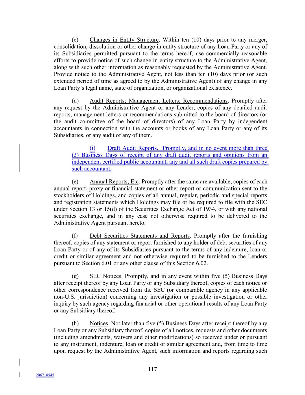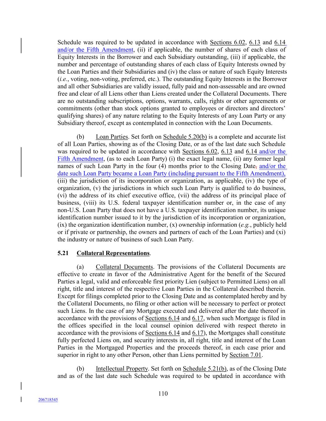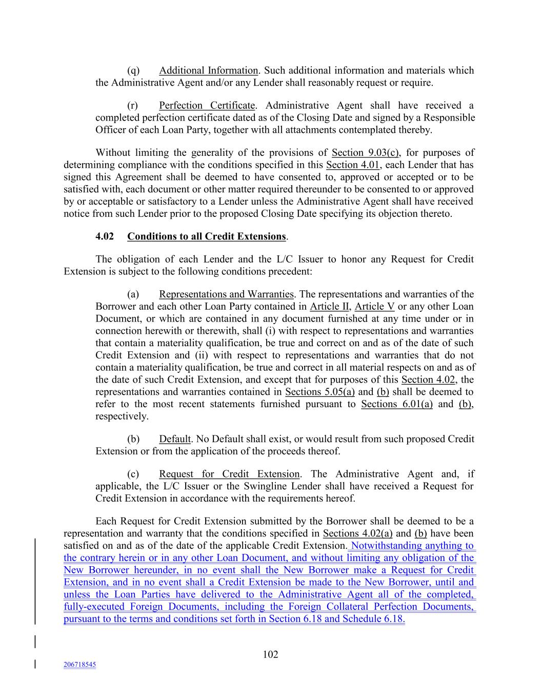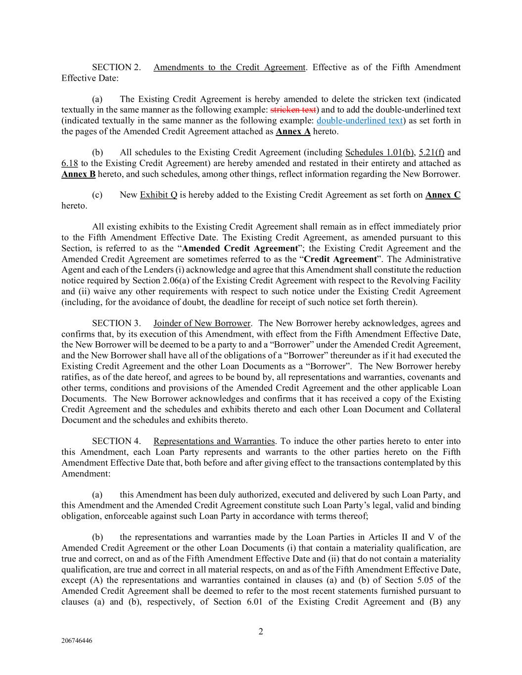2 206746446 SECTION 2. Amendments to the Credit Agreement. Effective as of the Fifth Amendment Effective Date: (a) The Existing Credit Agreement is hereby amended to delete the stricken text (indicated textually in the same manner as the following example: stricken text) and to add the double-underlined text (indicated textually in the same manner as the following example: double-underlined text) as set forth in the pages of the Amended Credit Agreement attached as Annex A hereto. (b) All schedules to the Existing Credit Agreement (including Schedules 1.01(b), 5.21(f) and 6.18 to the Existing Credit Agreement) are hereby amended and restated in their entirety and attached as Annex B hereto, and such schedules, among other things, reflect information regarding the New Borrower. (c) New Exhibit Q is hereby added to the Existing Credit Agreement as set forth on Annex C hereto. All existing exhibits to the Existing Credit Agreement shall remain as in effect immediately prior to the Fifth Amendment Effective Date. The Existing Credit Agreement, as amended pursuant to this Section, is referred to as the “Amended Credit Agreement”; the Existing Credit Agreement and the Amended Credit Agreement are sometimes referred to as the “Credit Agreement”. The Administrative Agent and each of the Lenders (i) acknowledge and agree that this Amendment shall constitute the reduction notice required by Section 2.06(a) of the Existing Credit Agreement with respect to the Revolving Facility and (ii) waive any other requirements with respect to such notice under the Existing Credit Agreement (including, for the avoidance of doubt, the deadline for receipt of such notice set forth therein). SECTION 3. Joinder of New Borrower. The New Borrower hereby acknowledges, agrees and confirms that, by its execution of this Amendment, with effect from the Fifth Amendment Effective Date, the New Borrower will be deemed to be a party to and a “Borrower” under the Amended Credit Agreement, and the New Borrower shall have all of the obligations of a “Borrower” thereunder as if it had executed the Existing Credit Agreement and the other Loan Documents as a “Borrower”. The New Borrower hereby ratifies, as of the date hereof, and agrees to be bound by, all representations and warranties, covenants and other terms, conditions and provisions of the Amended Credit Agreement and the other applicable Loan Documents. The New Borrower acknowledges and confirms that it has received a copy of the Existing Credit Agreement and the schedules and exhibits thereto and each other Loan Document and Collateral Document and the schedules and exhibits thereto. SECTION 4. Representations and Warranties. To induce the other parties hereto to enter into this Amendment, each Loan Party represents and warrants to the other parties hereto on the Fifth Amendment Effective Date that, both before and after giving effect to the transactions contemplated by this Amendment: (a) this Amendment has been duly authorized, executed and delivered by such Loan Party, and this Amendment and the Amended Credit Agreement constitute such Loan Party’s legal, valid and binding obligation, enforceable against such Loan Party in accordance with terms thereof; (b) the representations and warranties made by the Loan Parties in Articles II and V of the Amended Credit Agreement or the other Loan Documents (i) that contain a materiality qualification, are true and correct, on and as of the Fifth Amendment Effective Date and (ii) that do not contain a materiality qualification, are true and correct in all material respects, on and as of the Fifth Amendment Effective Date, except (A) the representations and warranties contained in clauses (a) and (b) of Section 5.05 of the Amended Credit Agreement shall be deemed to refer to the most recent statements furnished pursuant to clauses (a) and (b), respectively, of Section 6.01 of the Existing Credit Agreement and (B) any