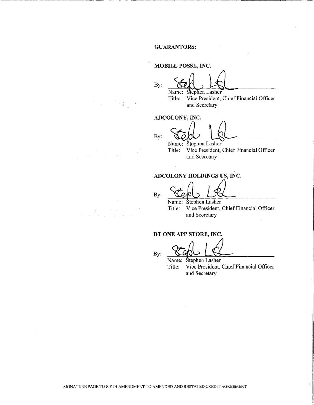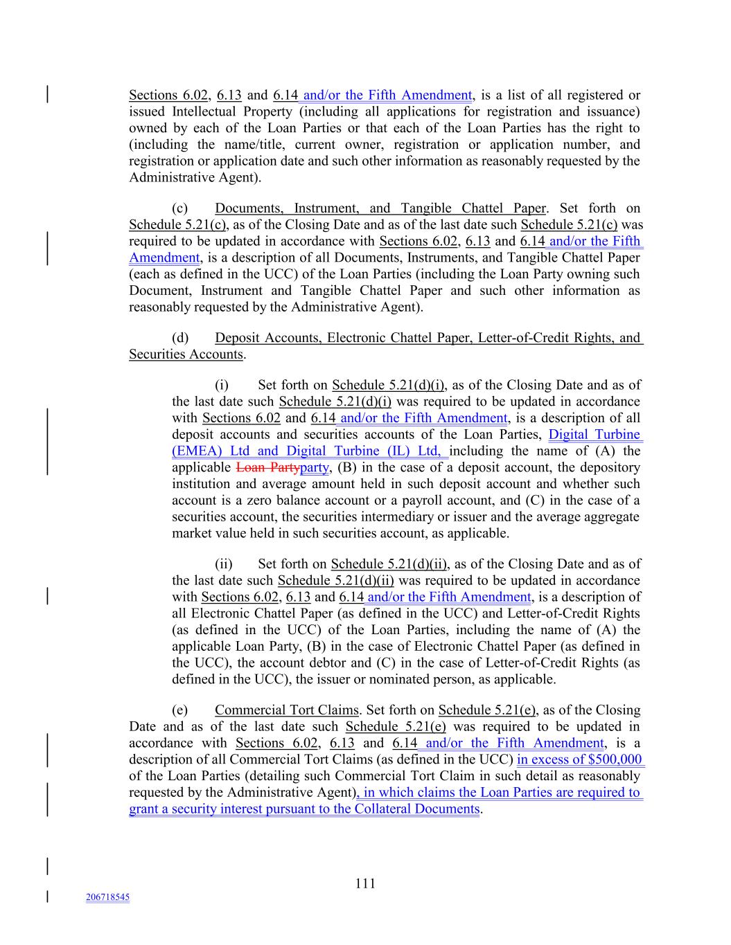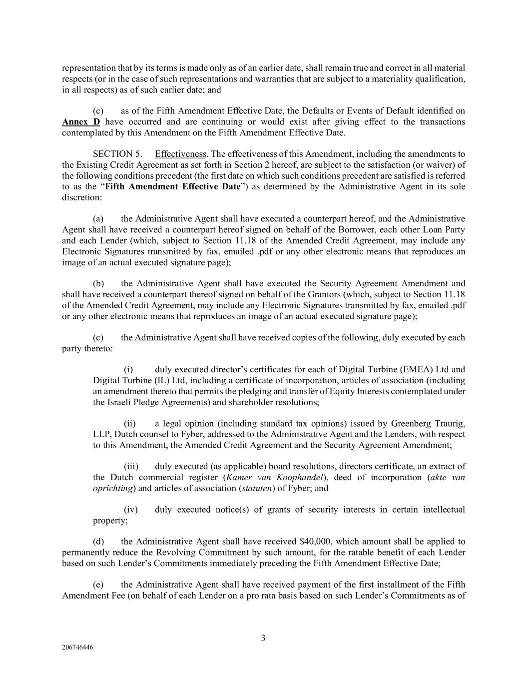 3 206746446 representation that by its terms is made only as of an earlier date, shall remain true and correct in all material respects (or in the case of such representations and warranties that are subject to a materiality qualification, in all respects) as of such earlier date; and (c) as of the Fifth Amendment Effective Date, the Defaults or Events of Default identified on Annex D have occurred and are continuing or would exist after giving effect to the transactions contemplated by this Amendment on the Fifth Amendment Effective Date. SECTION 5. Effectiveness. The effectiveness of this Amendment, including the amendments to the Existing Credit Agreement as set forth in Section 2 hereof, are subject to the satisfaction (or waiver) of the following conditions precedent (the first date on which such conditions precedent are satisfied is referred to as the “Fifth Amendment Effective Date”) as determined by the Administrative Agent in its sole discretion: (a) the Administrative Agent shall have executed a counterpart hereof, and the Administrative Agent shall have received a counterpart hereof signed on behalf of the Borrower, each other Loan Party and each Lender (which, subject to Section 11.18 of the Amended Credit Agreement, may include any Electronic Signatures transmitted by fax, emailed .pdf or any other electronic means that reproduces an image of an actual executed signature page); (b) the Administrative Agent shall have executed the Security Agreement Amendment and shall have received a counterpart thereof signed on behalf of the Grantors (which, subject to Section 11.18 of the Amended Credit Agreement, may include any Electronic Signatures transmitted by fax, emailed .pdf or any other electronic means that reproduces an image of an actual executed signature page); (c) the Administrative Agent shall have received copies of the following, duly executed by each party thereto: (i) duly executed director’s certificates for each of Digital Turbine (EMEA) Ltd and Digital Turbine (IL) Ltd, including a certificate of incorporation, articles of association (including an amendment thereto that permits the pledging and transfer of Equity Interests contemplated under the Israeli Pledge Agreements) and shareholder resolutions; (ii) a legal opinion (including standard tax opinions) issued by Greenberg Traurig, LLP, Dutch counsel to Fyber, addressed to the Administrative Agent and the Lenders, with respect to this Amendment, the Amended Credit Agreement and the Security Agreement Amendment; (iii) duly executed (as applicable) board resolutions, directors certificate, an extract of the Dutch commercial register (Kamer van Koophandel), deed of incorporation (akte van oprichting) and articles of association (statuten) of Fyber; and (iv) duly executed notice(s) of grants of security interests in certain intellectual property; (d) the Administrative Agent shall have received $40,000, which amount shall be applied to permanently reduce the Revolving Commitment by such amount, for the ratable benefit of each Lender based on such Lender’s Commitments immediately preceding the Fifth Amendment Effective Date; (e) the Administrative Agent shall have received payment of the first installment of the Fifth Amendment Fee (on behalf of each Lender on a pro rata basis based on such Lender’s Commitments as of