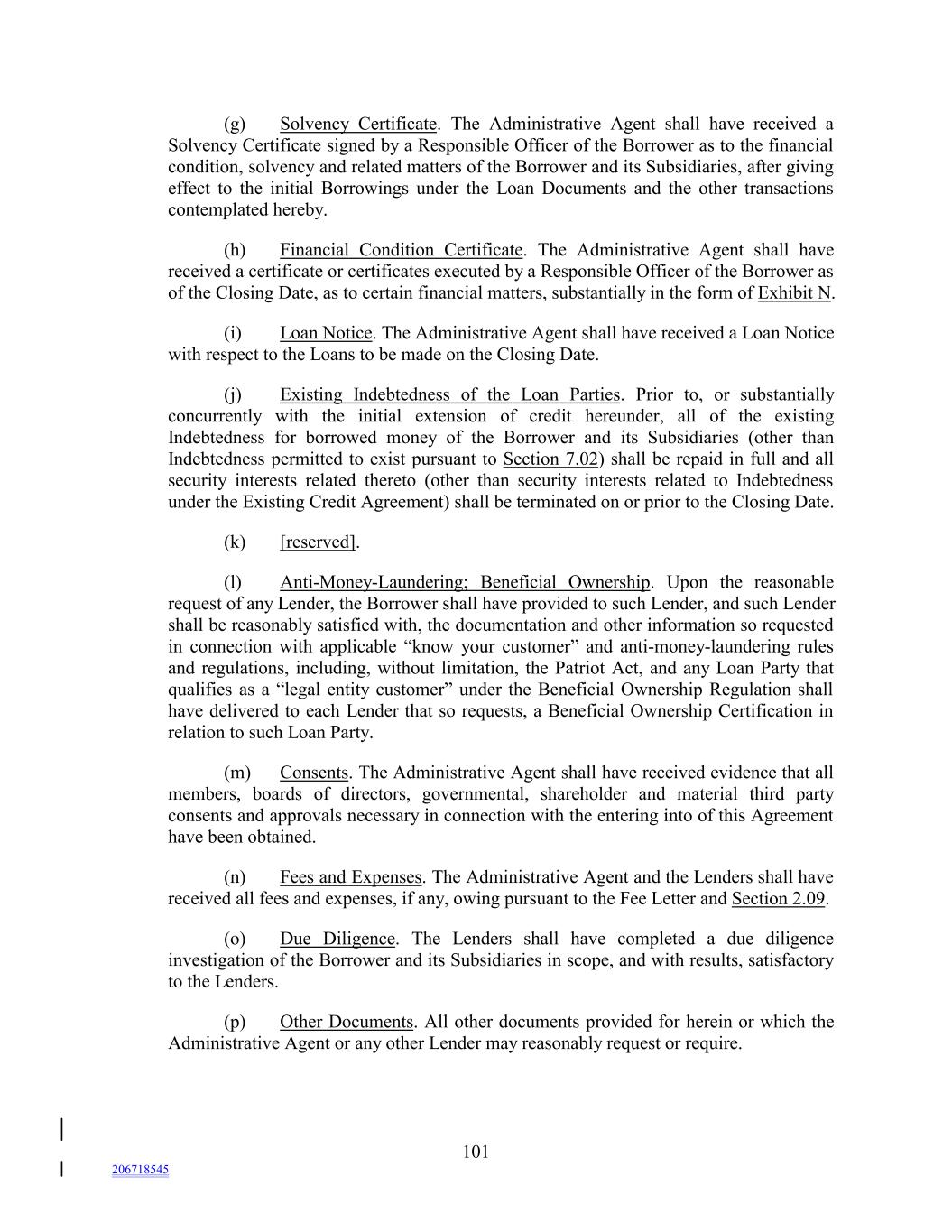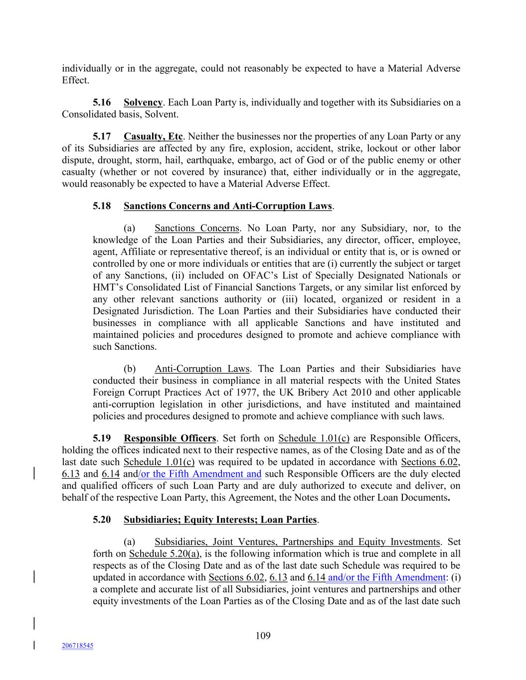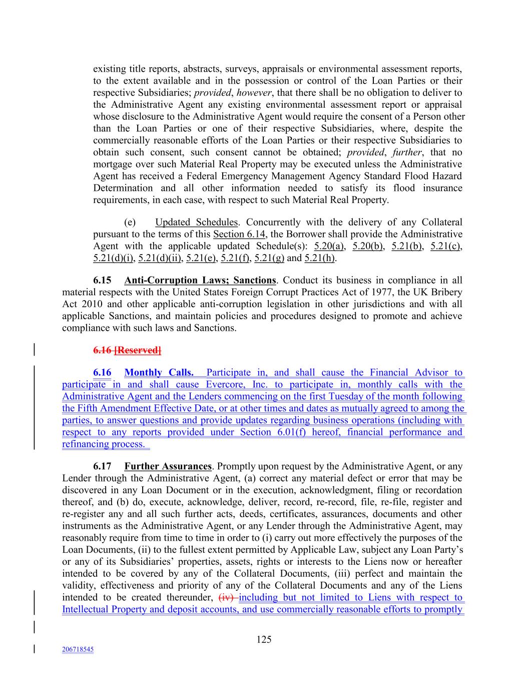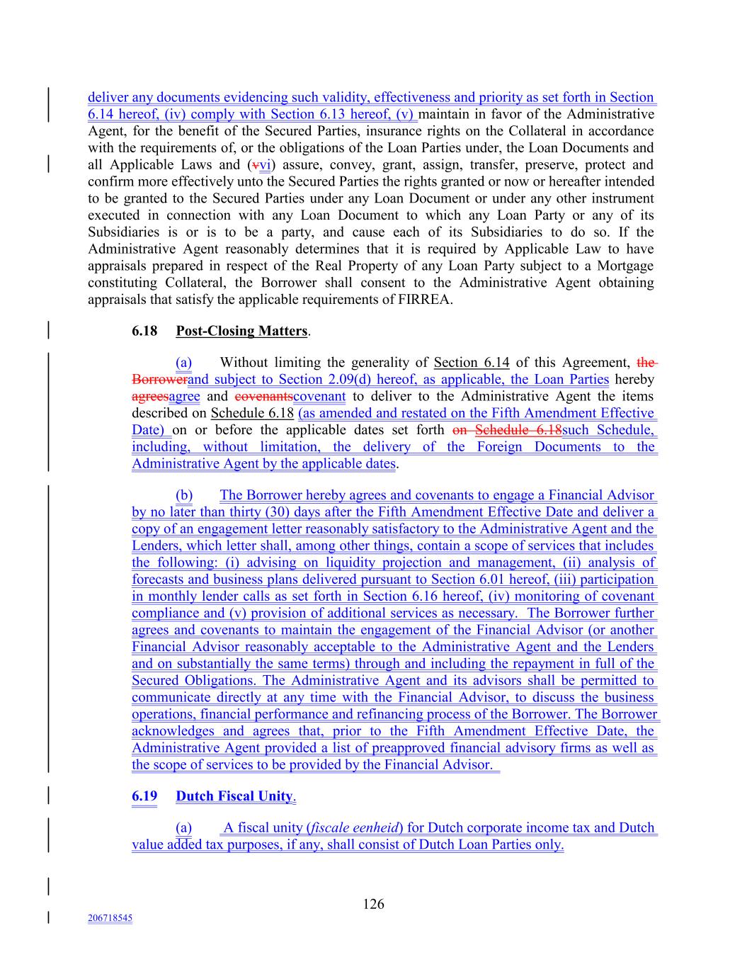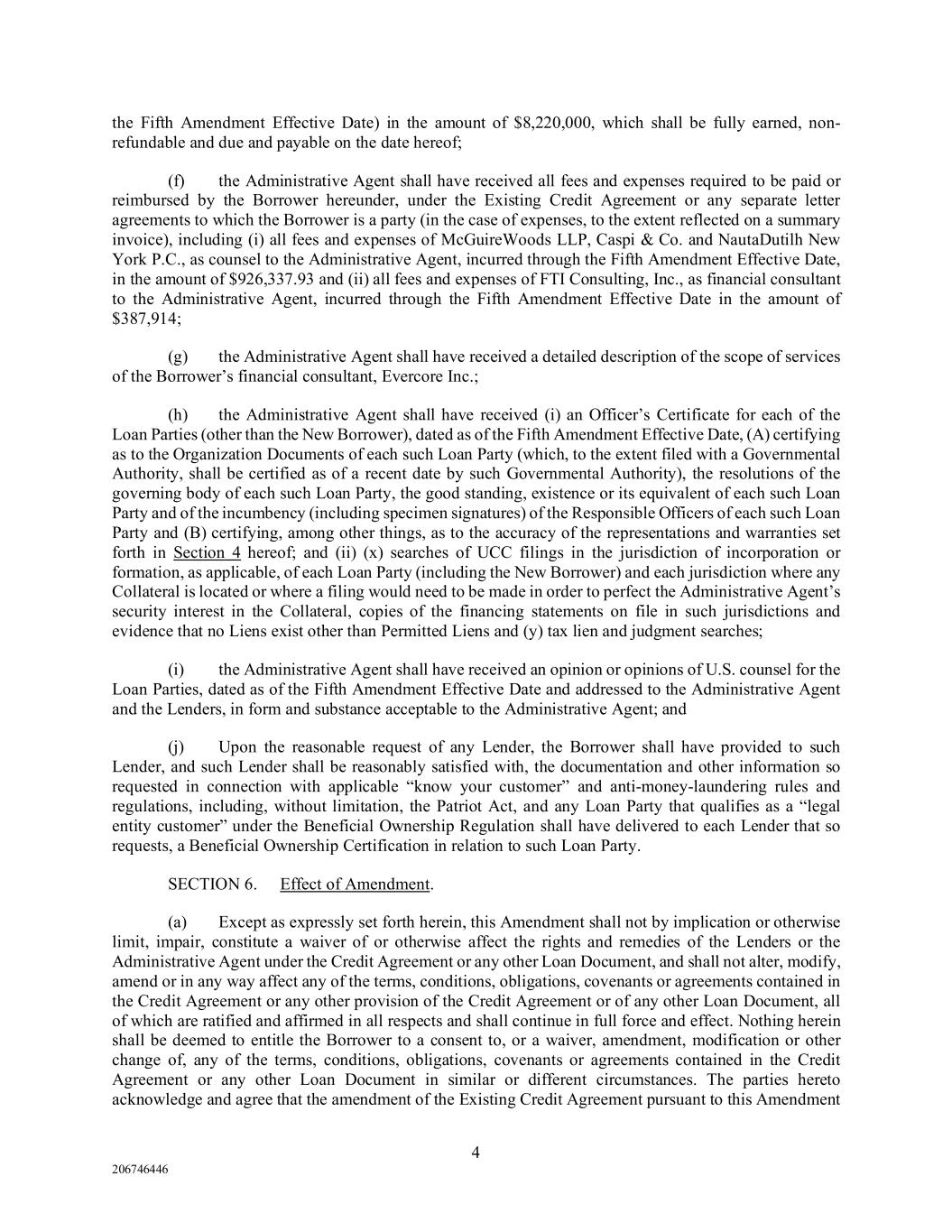 4 206746446 the Fifth Amendment Effective Date) in the amount of $8,220,000, which shall be fully earned, non- refundable and due and payable on the date hereof; (f) the Administrative Agent shall have received all fees and expenses required to be paid or reimbursed by the Borrower hereunder, under the Existing Credit Agreement or any separate letter agreements to which the Borrower is a party (in the case of expenses, to the extent reflected on a summary invoice), including (i) all fees and expenses of McGuireWoods LLP, Caspi & Co. and NautaDutilh New York P.C., as counsel to the Administrative Agent, incurred through the Fifth Amendment Effective Date, in the amount of $926,337.93 and (ii) all fees and expenses of FTI Consulting, Inc., as financial consultant to the Administrative Agent, incurred through the Fifth Amendment Effective Date in the amount of $387,914; (g) the Administrative Agent shall have received a detailed description of the scope of services of the Borrower’s financial consultant, Evercore Inc.; (h) the Administrative Agent shall have received (i) an Officer’s Certificate for each of the Loan Parties (other than the New Borrower), dated as of the Fifth Amendment Effective Date, (A) certifying as to the Organization Documents of each such Loan Party (which, to the extent filed with a Governmental Authority, shall be certified as of a recent date by such Governmental Authority), the resolutions of the governing body of each such Loan Party, the good standing, existence or its equivalent of each such Loan Party and of the incumbency (including specimen signatures) of the Responsible Officers of each such Loan Party and (B) certifying, among other things, as to the accuracy of the representations and warranties set forth in Section 4 hereof; and (ii) (x) searches of UCC filings in the jurisdiction of incorporation or formation, as applicable, of each Loan Party (including the New Borrower) and each jurisdiction where any Collateral is located or where a filing would need to be made in order to perfect the Administrative Agent’s security interest in the Collateral, copies of the financing statements on file in such jurisdictions and evidence that no Liens exist other than Permitted Liens and (y) tax lien and judgment searches; (i) the Administrative Agent shall have received an opinion or opinions of U.S. counsel for the Loan Parties, dated as of the Fifth Amendment Effective Date and addressed to the Administrative Agent and the Lenders, in form and substance acceptable to the Administrative Agent; and (j) Upon the reasonable request of any Lender, the Borrower shall have provided to such Lender, and such Lender shall be reasonably satisfied with, the documentation and other information so requested in connection with applicable “know your customer” and anti-money-laundering rules and regulations, including, without limitation, the Patriot Act, and any Loan Party that qualifies as a “legal entity customer” under the Beneficial Ownership Regulation shall have delivered to each Lender that so requests, a Beneficial Ownership Certification in relation to such Loan Party. SECTION 6. Effect of Amendment. (a) Except as expressly set forth herein, this Amendment shall not by implication or otherwise limit, impair, constitute a waiver of or otherwise affect the rights and remedies of the Lenders or the Administrative Agent under the Credit Agreement or any other Loan Document, and shall not alter, modify, amend or in any way affect any of the terms, conditions, obligations, covenants or agreements contained in the Credit Agreement or any other provision of the Credit Agreement or of any other Loan Document, all of which are ratified and affirmed in all respects and shall continue in full force and effect. Nothing herein shall be deemed to entitle the Borrower to a consent to, or a waiver, amendment, modification or other change of, any of the terms, conditions, obligations, covenants or agreements contained in the Credit Agreement or any other Loan Document in similar or different circumstances. The parties hereto acknowledge and agree that the amendment of the Existing Credit Agreement pursuant to this Amendment