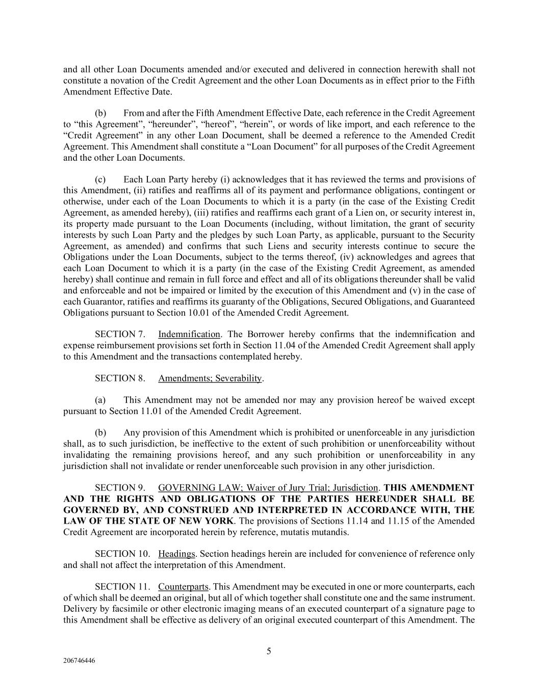 5 206746446 and all other Loan Documents amended and/or executed and delivered in connection herewith shall not constitute a novation of the Credit Agreement and the other Loan Documents as in effect prior to the Fifth Amendment Effective Date. (b) From and after the Fifth Amendment Effective Date, each reference in the Credit Agreement to “this Agreement”, “hereunder”, “hereof”, “herein”, or words of like import, and each reference to the “Credit Agreement” in any other Loan Document, shall be deemed a reference to the Amended Credit Agreement. This Amendment shall constitute a “Loan Document” for all purposes of the Credit Agreement and the other Loan Documents. (c) Each Loan Party hereby (i) acknowledges that it has reviewed the terms and provisions of this Amendment, (ii) ratifies and reaffirms all of its payment and performance obligations, contingent or otherwise, under each of the Loan Documents to which it is a party (in the case of the Existing Credit Agreement, as amended hereby), (iii) ratifies and reaffirms each grant of a Lien on, or security interest in, its property made pursuant to the Loan Documents (including, without limitation, the grant of security interests by such Loan Party and the pledges by such Loan Party, as applicable, pursuant to the Security Agreement, as amended) and confirms that such Liens and security interests continue to secure the Obligations under the Loan Documents, subject to the terms thereof, (iv) acknowledges and agrees that each Loan Document to which it is a party (in the case of the Existing Credit Agreement, as amended hereby) shall continue and remain in full force and effect and all of its obligations thereunder shall be valid and enforceable and not be impaired or limited by the execution of this Amendment and (v) in the case of each Guarantor, ratifies and reaffirms its guaranty of the Obligations, Secured Obligations, and Guaranteed Obligations pursuant to Section 10.01 of the Amended Credit Agreement. SECTION 7. Indemnification. The Borrower hereby confirms that the indemnification and expense reimbursement provisions set forth in Section 11.04 of the Amended Credit Agreement shall apply to this Amendment and the transactions contemplated hereby. SECTION 8. Amendments; Severability. (a) This Amendment may not be amended nor may any provision hereof be waived except pursuant to Section 11.01 of the Amended Credit Agreement. (b) Any provision of this Amendment which is prohibited or unenforceable in any jurisdiction shall, as to such jurisdiction, be ineffective to the extent of such prohibition or unenforceability without invalidating the remaining provisions hereof, and any such prohibition or unenforceability in any jurisdiction shall not invalidate or render unenforceable such provision in any other jurisdiction. SECTION 9. GOVERNING LAW; Waiver of Jury Trial; Jurisdiction. THIS AMENDMENT AND THE RIGHTS AND OBLIGATIONS OF THE PARTIES HEREUNDER SHALL BE GOVERNED BY, AND CONSTRUED AND INTERPRETED IN ACCORDANCE WITH, THE LAW OF THE STATE OF NEW YORK. The provisions of Sections 11.14 and 11.15 of the Amended Credit Agreement are incorporated herein by reference, mutatis mutandis. SECTION 10. Headings. Section headings herein are included for convenience of reference only and shall not affect the interpretation of this Amendment. SECTION 11. Counterparts. This Amendment may be executed in one or more counterparts, each of which shall be deemed an original, but all of which together shall constitute one and the same instrument. Delivery by facsimile or other electronic imaging means of an executed counterpart of a signature page to this Amendment shall be effective as delivery of an original executed counterpart of this Amendment. The