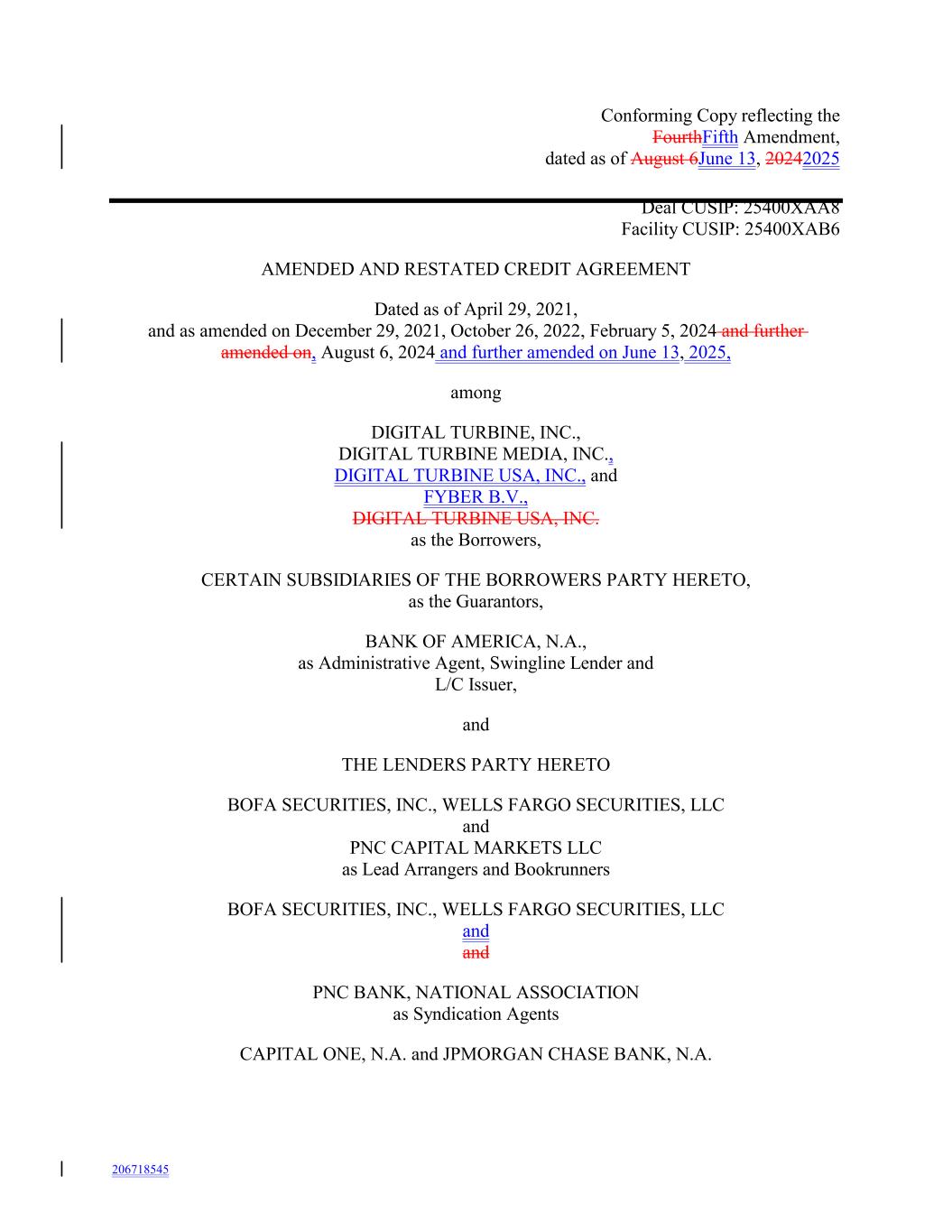 Conforming Copy reflecting the FourthFifth Amendment, dated as of August 6June 13, 20242025 Deal CUSIP: 25400XAA8 Facility CUSIP: 25400XAB6 AMENDED AND RESTATED CREDIT AGREEMENT Dated as of April 29, 2021, and as amended on December 29, 2021, October 26, 2022, February 5, 2024 and further amended on, August 6, 2024 and further amended on June 13, 2025, among DIGITAL TURBINE, INC., DIGITAL TURBINE MEDIA, INC., DIGITAL TURBINE USA, INC., and FYBER B.V., DIGITAL TURBINE USA, INC. as the Borrowers, CERTAIN SUBSIDIARIES OF THE BORROWERS PARTY HERETO, as the Guarantors, BANK OF AMERICA, N.A., as Administrative Agent, Swingline Lender and L/C Issuer, and THE LENDERS PARTY HERETO BOFA SECURITIES, INC., WELLS FARGO SECURITIES, LLC and PNC CAPITAL MARKETS LLC as Lead Arrangers and Bookrunners BOFA SECURITIES, INC., WELLS FARGO SECURITIES, LLC and and PNC BANK, NATIONAL ASSOCIATION as Syndication Agents CAPITAL ONE, N.A. and JPMORGAN CHASE BANK, N.A. 206718545