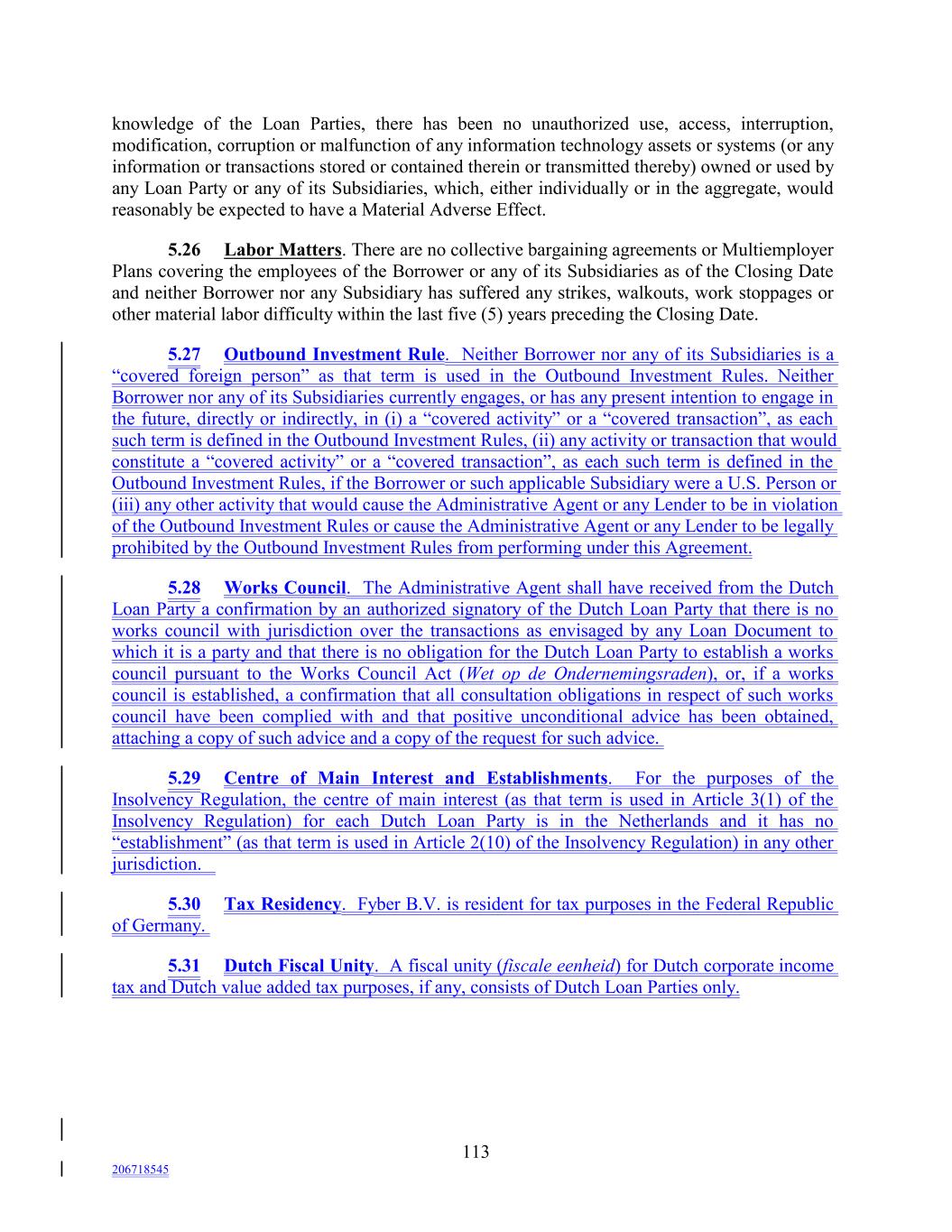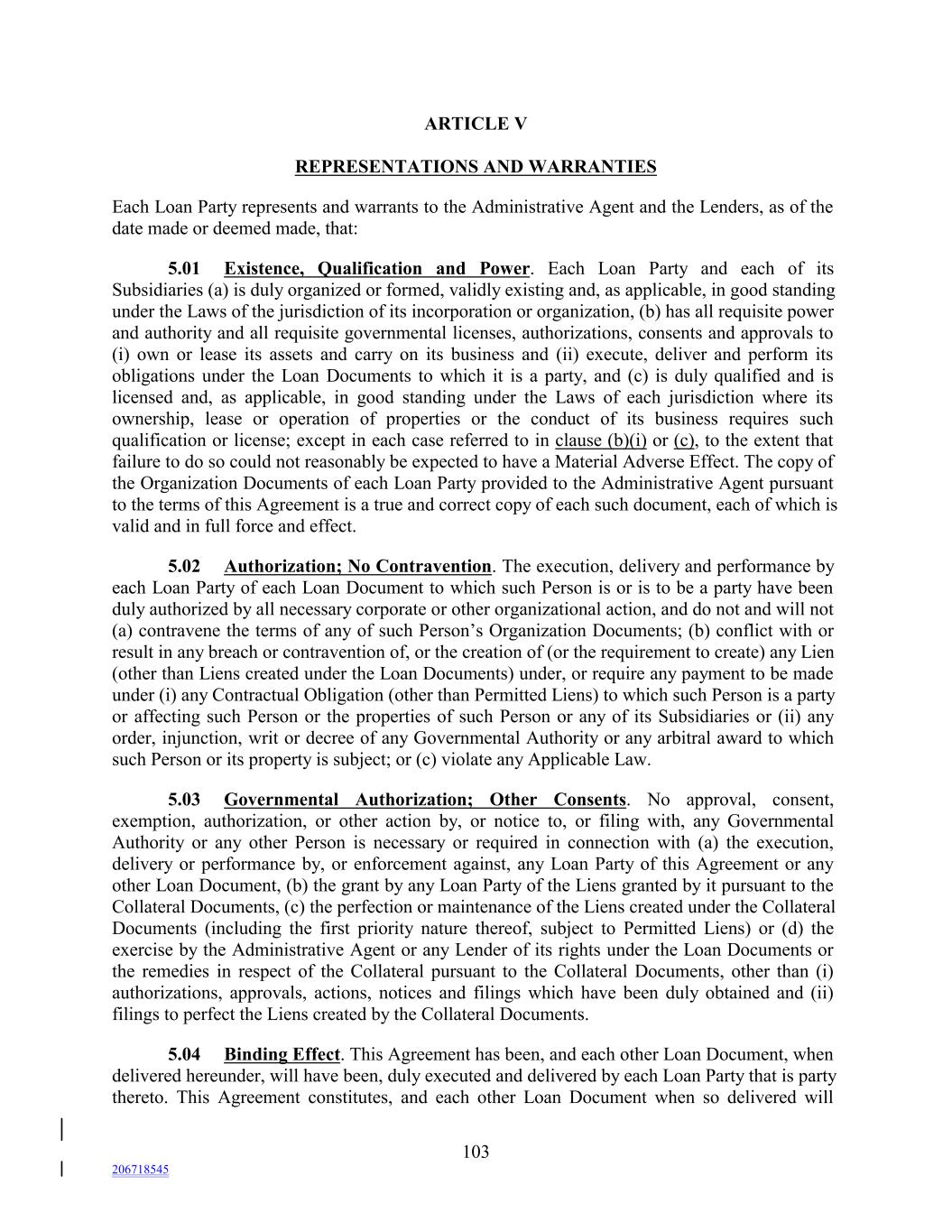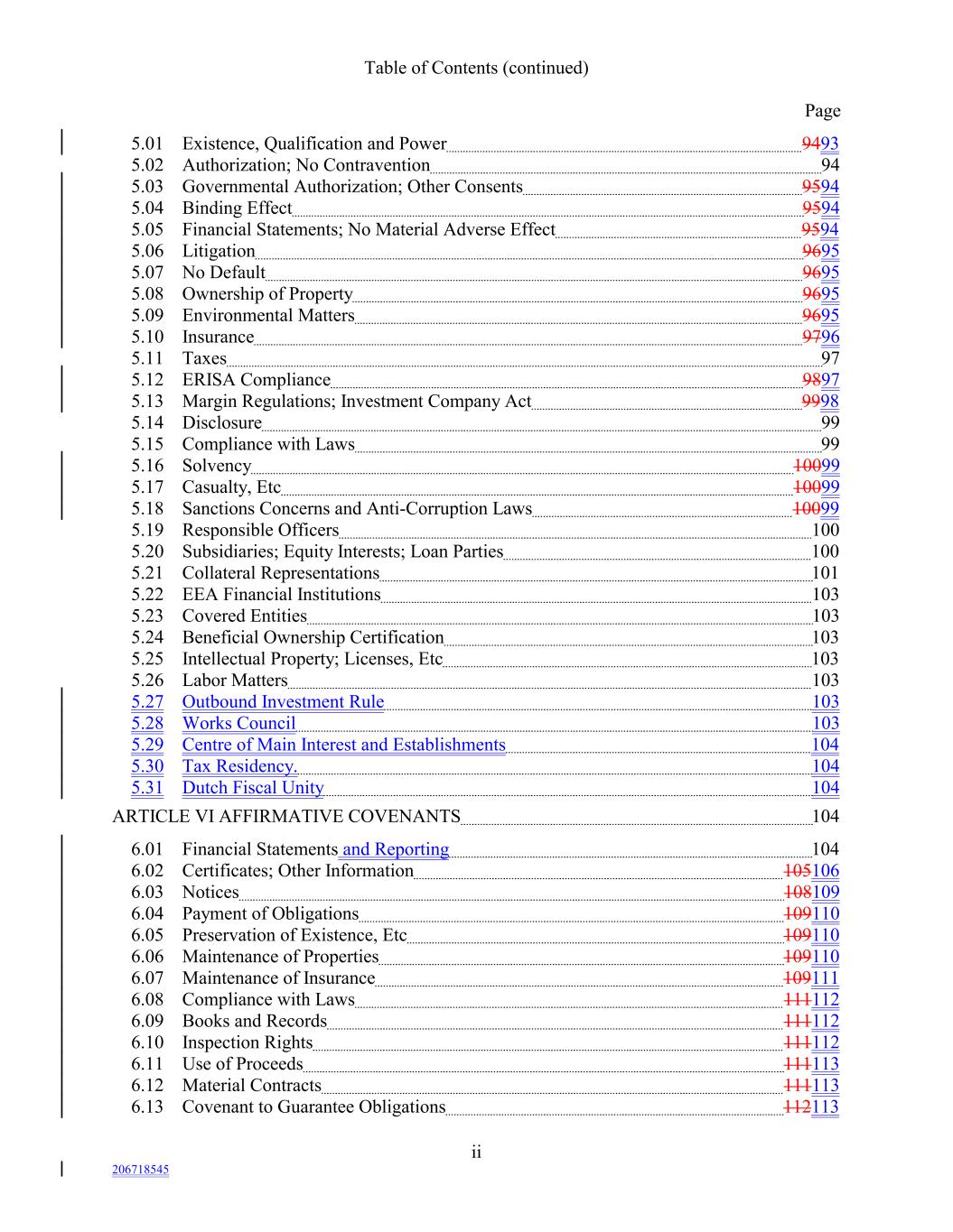 Table of Contents (continued) Page 5.01 Existence, Qualification and Power 9493 5.02 Authorization; No Contravention 94 5.03 Governmental Authorization; Other Consents 9594 5.04 Binding Effect 9594 5.05 Financial Statements; No Material Adverse Effect 9594 5.06 Litigation 9695 5.07 No Default 9695 5.08 Ownership of Property 9695 5.09 Environmental Matters 9695 5.10 Insurance 9796 5.11 Taxes 97 5.12 ERISA Compliance 9897 5.13 Margin Regulations; Investment Company Act 9998 5.14 Disclosure 99 5.15 Compliance with Laws 99 5.16 Solvency 10099 5.17 Casualty, Etc 10099 5.18 Sanctions Concerns and Anti-Corruption Laws 10099 5.19 Responsible Officers 100 5.20 Subsidiaries; Equity Interests; Loan Parties 100 5.21 Collateral Representations 101 5.22 EEA Financial Institutions 103 5.23 Covered Entities 103 5.24 Beneficial Ownership Certification 103 5.25 Intellectual Property; Licenses, Etc 103 5.26 Labor Matters 103 5.27 Outbound Investment Rule 103 5.28 Works Council 103 5.29 Centre of Main Interest and Establishments 104 5.30 Tax Residency. 104 5.31 Dutch Fiscal Unity 104 ARTICLE VI AFFIRMATIVE COVENANTS 104 6.01 Financial Statements and Reporting 104 6.02 Certificates; Other Information 105106 6.03 Notices 108109 6.04 Payment of Obligations 109110 6.05 Preservation of Existence, Etc 109110 6.06 Maintenance of Properties 109110 6.07 Maintenance of Insurance 109111 6.08 Compliance with Laws 111112 6.09 Books and Records 111112 6.10 Inspection Rights 111112 6.11 Use of Proceeds 111113 6.12 Material Contracts 111113 6.13 Covenant to Guarantee Obligations 112113 ii 206718545