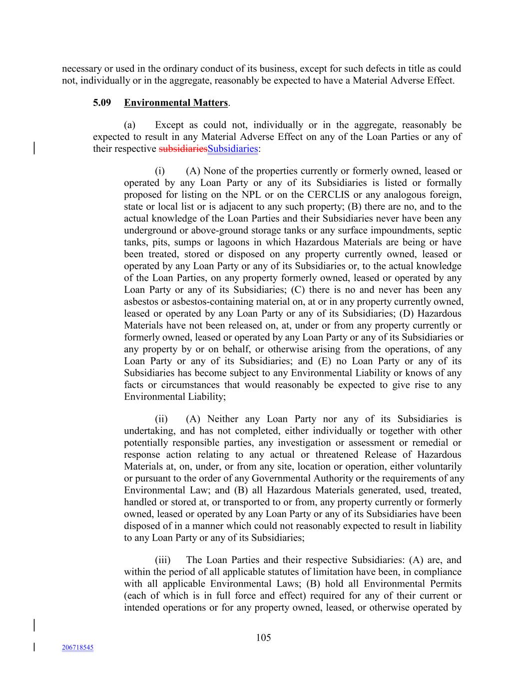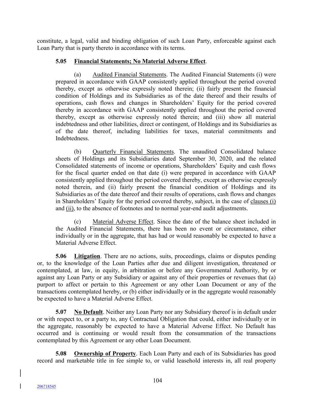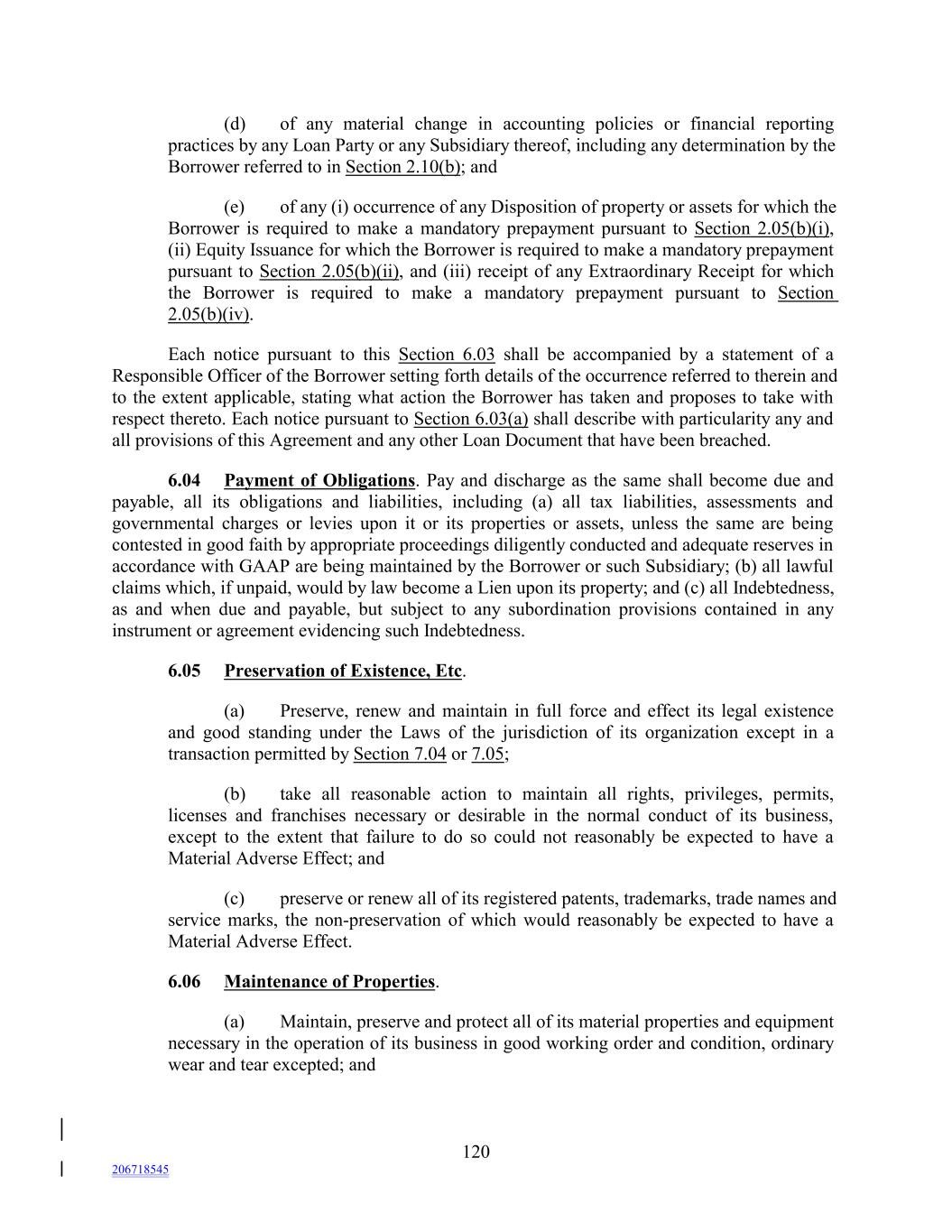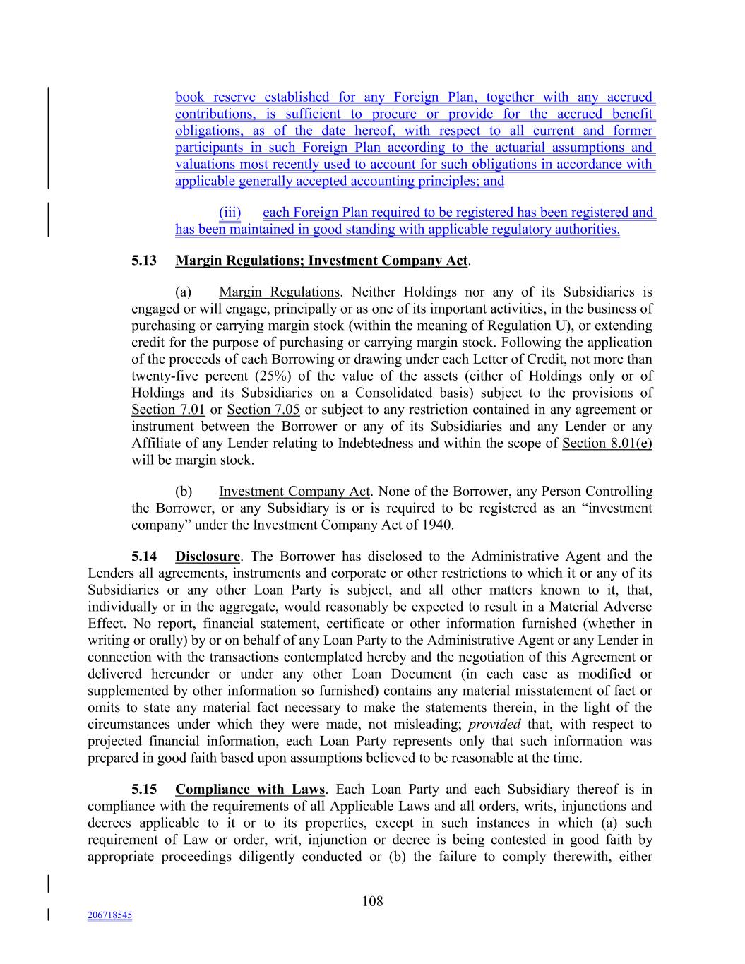Table of Contents (continued) Page 5.01 Existence, Qualification and Power 9493 5.02 Authorization; No Contravention 94 5.03 Governmental Authorization; Other Consents 9594 5.04 Binding Effect 9594 5.05 Financial Statements; No Material Adverse Effect 9594 5.06 Litigation 9695 5.07 No Default 9695 5.08 Ownership of Property 9695 5.09 Environmental Matters 9695 5.10 Insurance 9796 5.11 Taxes 97 5.12 ERISA Compliance 9897 5.13 Margin Regulations; Investment Company Act 9998 5.14 Disclosure 99 5.15 Compliance with Laws 99 5.16 Solvency 10099 5.17 Casualty, Etc 10099 5.18 Sanctions Concerns and Anti-Corruption Laws 10099 5.19 Responsible Officers 100 5.20 Subsidiaries; Equity Interests; Loan Parties 100 5.21 Collateral Representations 101 5.22 EEA Financial Institutions 103 5.23 Covered Entities 103 5.24 Beneficial Ownership Certification 103 5.25 Intellectual Property; Licenses, Etc 103 5.26 Labor Matters 103 5.27 Outbound Investment Rule 103 5.28 Works Council 103 5.29 Centre of Main Interest and Establishments 104 5.30 Tax Residency. 104 5.31 Dutch Fiscal Unity 104 ARTICLE VI AFFIRMATIVE COVENANTS 104 6.01 Financial Statements and Reporting 104 6.02 Certificates; Other Information 105106 6.03 Notices 108109 6.04 Payment of Obligations 109110 6.05 Preservation of Existence, Etc 109110 6.06 Maintenance of Properties 109110 6.07 Maintenance of Insurance 109111 6.08 Compliance with Laws 111112 6.09 Books and Records 111112 6.10 Inspection Rights 111112 6.11 Use of Proceeds 111113 6.12 Material Contracts 111113 6.13 Covenant to Guarantee Obligations 112113 ii 206718545