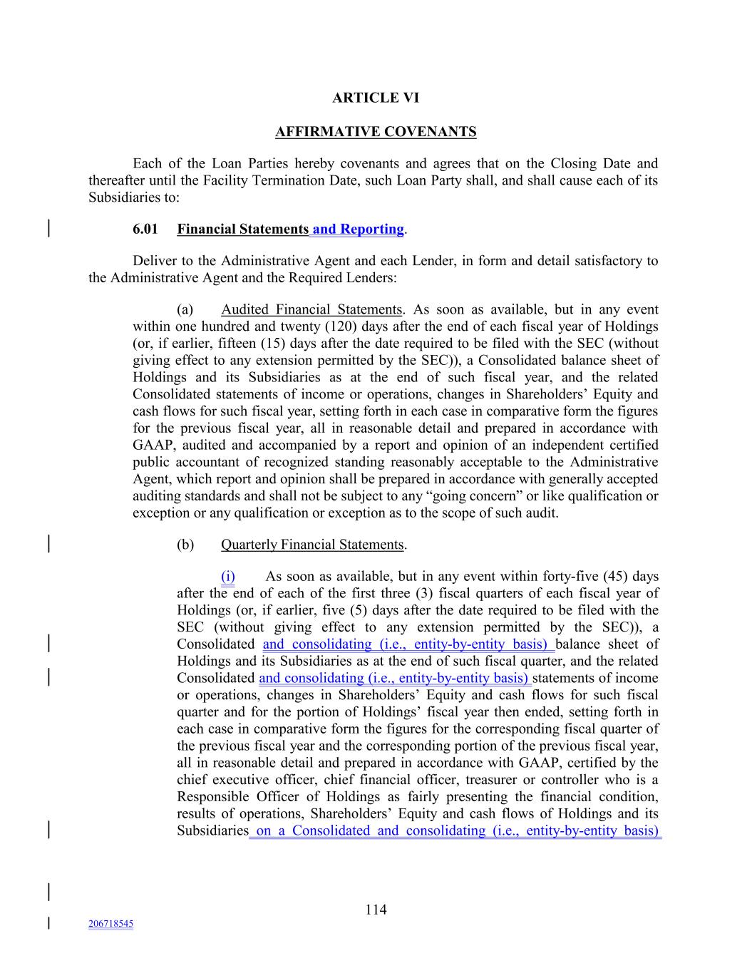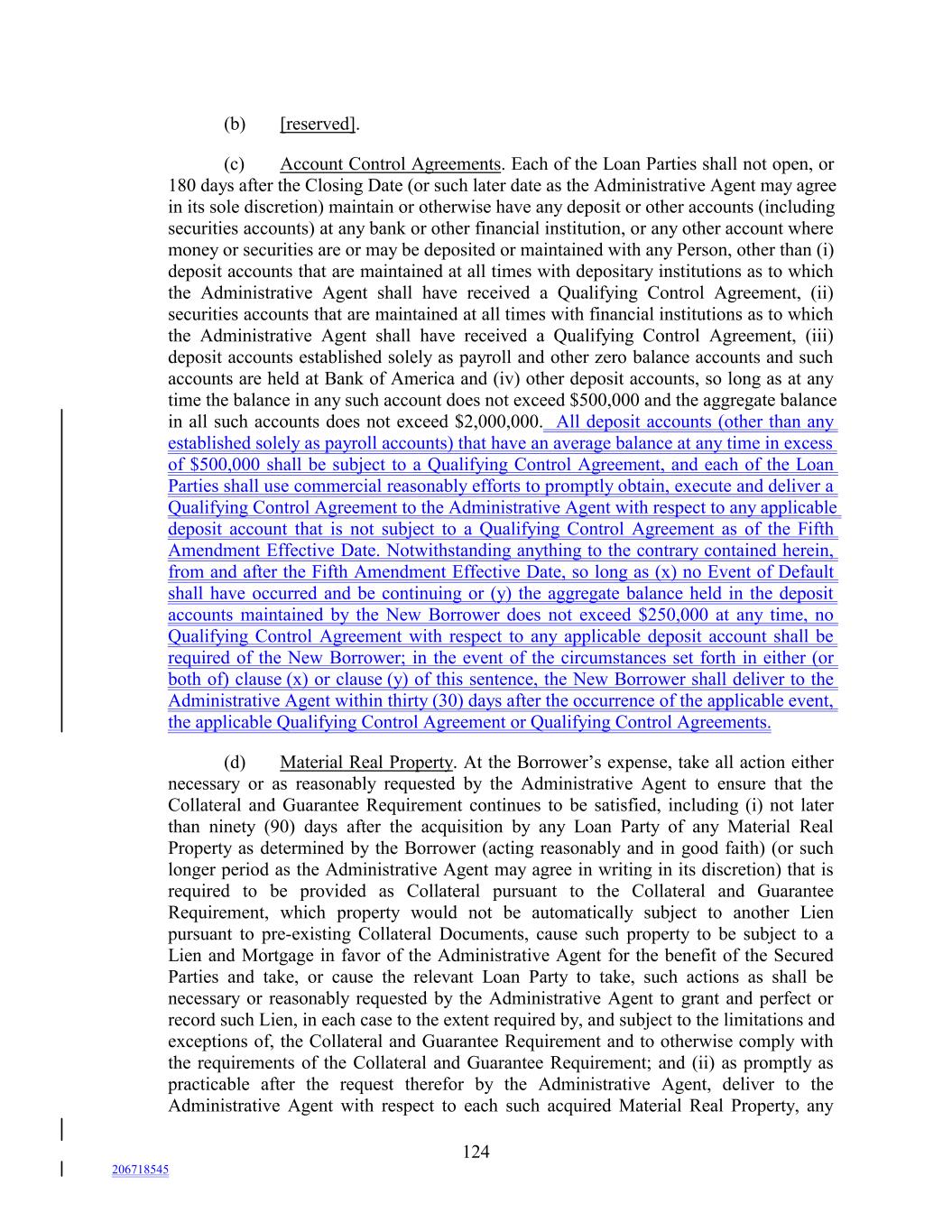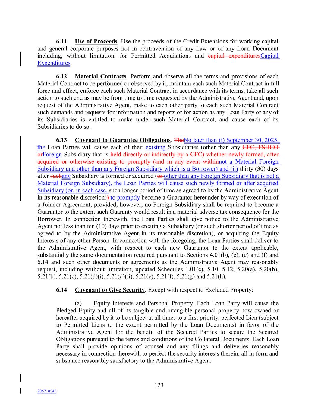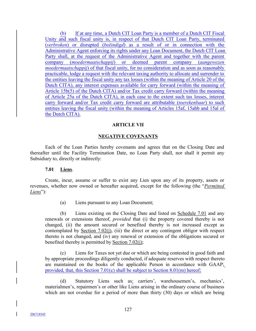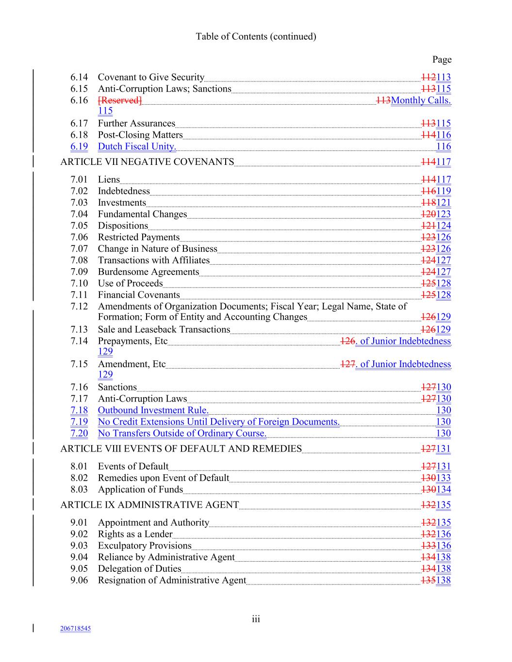 Table of Contents (continued) Page 6.14 Covenant to Give Security 112113 6.15 Anti-Corruption Laws; Sanctions 113115 6.16 [Reserved] 113Monthly Calls. 115 6.17 Further Assurances 113115 6.18 Post-Closing Matters 114116 6.19 Dutch Fiscal Unity. 116 ARTICLE VII NEGATIVE COVENANTS 114117 7.01 Liens 114117 7.02 Indebtedness 116119 7.03 Investments 118121 7.04 Fundamental Changes 120123 7.05 Dispositions 121124 7.06 Restricted Payments 123126 7.07 Change in Nature of Business 123126 7.08 Transactions with Affiliates 124127 7.09 Burdensome Agreements 124127 7.10 Use of Proceeds 125128 7.11 Financial Covenants 125128 7.12 Amendments of Organization Documents; Fiscal Year; Legal Name, State of Formation; Form of Entity and Accounting Changes 126129 7.13 Sale and Leaseback Transactions 126129 7.14 Prepayments, Etc 126. of Junior Indebtedness 129 7.15 Amendment, Etc 127. of Junior Indebtedness 129 7.16 Sanctions 127130 7.17 Anti-Corruption Laws 127130 7.18 Outbound Investment Rule. 130 7.19 No Credit Extensions Until Delivery of Foreign Documents. 130 7.20 No Transfers Outside of Ordinary Course. 130 ARTICLE VIII EVENTS OF DEFAULT AND REMEDIES 127131 8.01 Events of Default 127131 8.02 Remedies upon Event of Default 130133 8.03 Application of Funds 130134 ARTICLE IX ADMINISTRATIVE AGENT 132135 9.01 Appointment and Authority 132135 9.02 Rights as a Lender 132136 9.03 Exculpatory Provisions 133136 9.04 Reliance by Administrative Agent 134138 9.05 Delegation of Duties 134138 9.06 Resignation of Administrative Agent 135138 iii 206718545