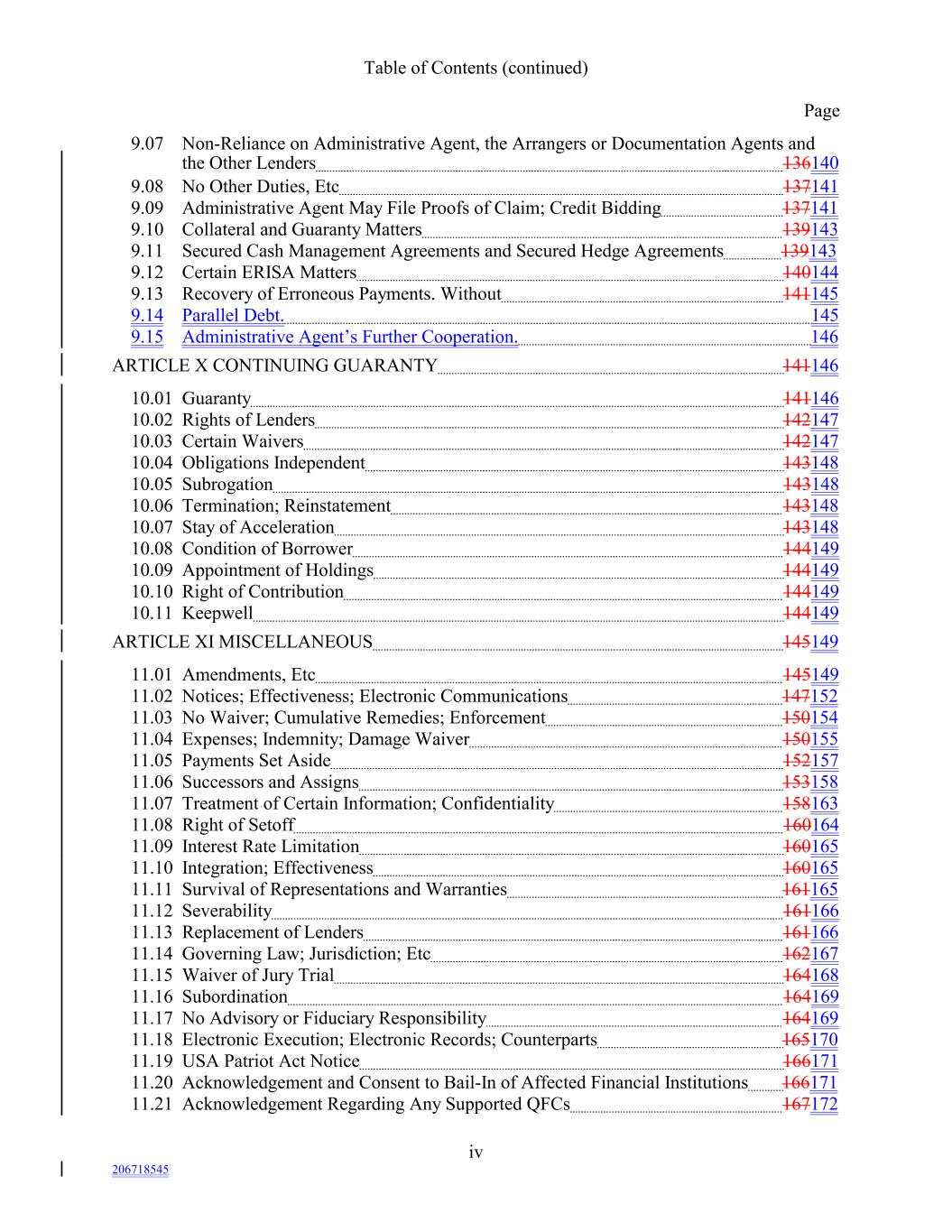 Table of Contents (continued) Page 9.07 Non-Reliance on Administrative Agent, the Arrangers or Documentation Agents and the Other Lenders 136140 9.08 No Other Duties, Etc 137141 9.09 Administrative Agent May File Proofs of Claim; Credit Bidding 137141 9.10 Collateral and Guaranty Matters 139143 9.11 Secured Cash Management Agreements and Secured Hedge Agreements 139143 9.12 Certain ERISA Matters 140144 9.13 Recovery of Erroneous Payments. Without 141145 9.14 Parallel Debt. 145 9.15 Administrative Agent’s Further Cooperation. 146 ARTICLE X CONTINUING GUARANTY 141146 10.01 Guaranty 141146 10.02 Rights of Lenders 142147 10.03 Certain Waivers 142147 10.04 Obligations Independent 143148 10.05 Subrogation 143148 10.06 Termination; Reinstatement 143148 10.07 Stay of Acceleration 143148 10.08 Condition of Borrower 144149 10.09 Appointment of Holdings 144149 10.10 Right of Contribution 144149 10.11 Keepwell 144149 ARTICLE XI MISCELLANEOUS 145149 11.01 Amendments, Etc 145149 11.02 Notices; Effectiveness; Electronic Communications 147152 11.03 No Waiver; Cumulative Remedies; Enforcement 150154 11.04 Expenses; Indemnity; Damage Waiver 150155 11.05 Payments Set Aside 152157 11.06 Successors and Assigns 153158 11.07 Treatment of Certain Information; Confidentiality 158163 11.08 Right of Setoff 160164 11.09 Interest Rate Limitation 160165 11.10 Integration; Effectiveness 160165 11.11 Survival of Representations and Warranties 161165 11.12 Severability 161166 11.13 Replacement of Lenders 161166 11.14 Governing Law; Jurisdiction; Etc 162167 11.15 Waiver of Jury Trial 164168 11.16 Subordination 164169 11.17 No Advisory or Fiduciary Responsibility 164169 11.18 Electronic Execution; Electronic Records; Counterparts 165170 11.19 USA Patriot Act Notice 166171 11.20 Acknowledgement and Consent to Bail-In of Affected Financial Institutions 166171 11.21 Acknowledgement Regarding Any Supported QFCs 167172 iv 206718545