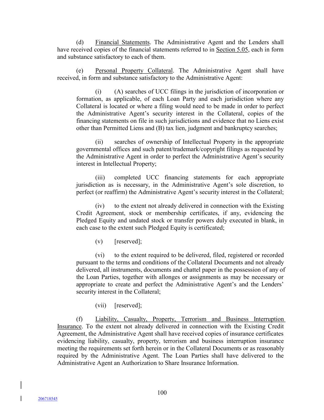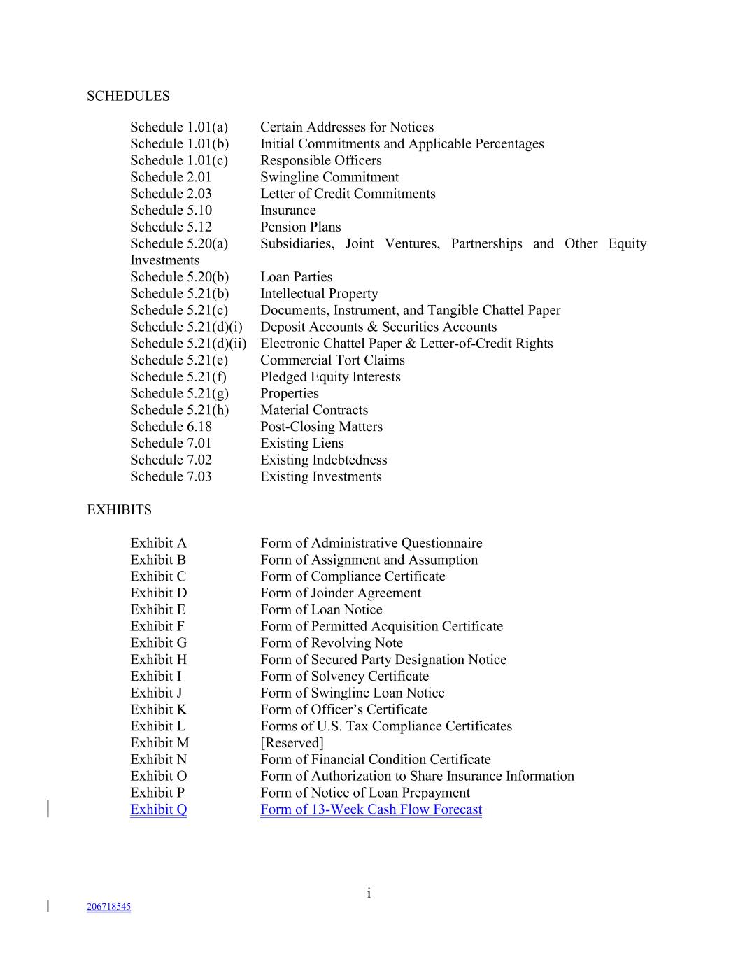 SCHEDULES Schedule 1.01(a) Certain Addresses for Notices Schedule 1.01(b) Initial Commitments and Applicable Percentages Schedule 1.01(c) Responsible Officers Schedule 2.01 Swingline Commitment Schedule 2.03 Letter of Credit Commitments Schedule 5.10 Insurance Schedule 5.12 Pension Plans Schedule 5.20(a) Subsidiaries, Joint Ventures, Partnerships and Other Equity Investments Schedule 5.20(b) Loan Parties Schedule 5.21(b) Intellectual Property Schedule 5.21(c) Documents, Instrument, and Tangible Chattel Paper Schedule 5.21(d)(i) Deposit Accounts & Securities Accounts Schedule 5.21(d)(ii) Electronic Chattel Paper & Letter-of-Credit Rights Schedule 5.21(e) Commercial Tort Claims Schedule 5.21(f) Pledged Equity Interests Schedule 5.21(g) Properties Schedule 5.21(h) Material Contracts Schedule 6.18 Post-Closing Matters Schedule 7.01 Existing Liens Schedule 7.02 Existing Indebtedness Schedule 7.03 Existing Investments EXHIBITS Exhibit A Form of Administrative Questionnaire Exhibit B Form of Assignment and Assumption Exhibit C Form of Compliance Certificate Exhibit D Form of Joinder Agreement Exhibit E Form of Loan Notice Exhibit F Form of Permitted Acquisition Certificate Exhibit G Form of Revolving Note Exhibit H Form of Secured Party Designation Notice Exhibit I Form of Solvency Certificate Exhibit J Form of Swingline Loan Notice Exhibit K Form of Officer’s Certificate Exhibit L Forms of U.S. Tax Compliance Certificates Exhibit M [Reserved] Exhibit N Form of Financial Condition Certificate Exhibit O Form of Authorization to Share Insurance Information Exhibit P Form of Notice of Loan Prepayment Exhibit Q Form of 13-Week Cash Flow Forecast i 206718545