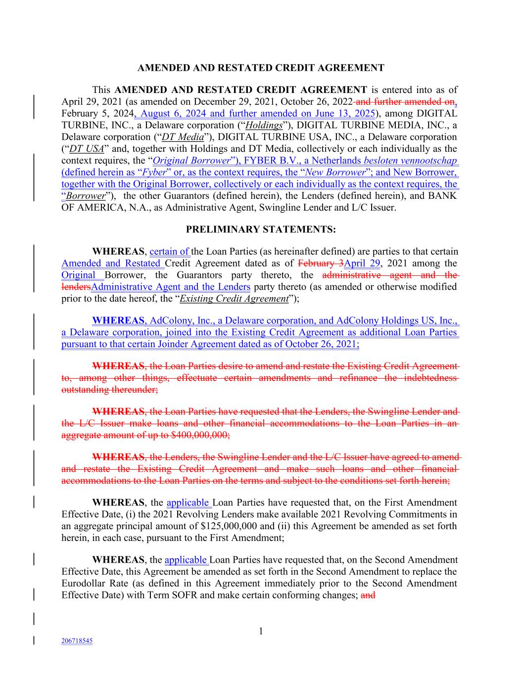 AMENDED AND RESTATED CREDIT AGREEMENT This AMENDED AND RESTATED CREDIT AGREEMENT is entered into as of April 29, 2021 (as amended on December 29, 2021, October 26, 2022 and further amended on, February 5, 2024, August 6, 2024 and further amended on June 13, 2025), among DIGITAL TURBINE, INC., a Delaware corporation (“Holdings”), DIGITAL TURBINE MEDIA, INC., a Delaware corporation (“DT Media”), DIGITAL TURBINE USA, INC., a Delaware corporation (“DT USA” and, together with Holdings and DT Media, collectively or each individually as the context requires, the “Original Borrower”), FYBER B.V., a Netherlands besloten vennootschap (defined herein as “Fyber” or, as the context requires, the “New Borrower”; and New Borrower, together with the Original Borrower, collectively or each individually as the context requires, the “Borrower”), the other Guarantors (defined herein), the Lenders (defined herein), and BANK OF AMERICA, N.A., as Administrative Agent, Swingline Lender and L/C Issuer. PRELIMINARY STATEMENTS: WHEREAS, certain of the Loan Parties (as hereinafter defined) are parties to that certain Amended and Restated Credit Agreement dated as of February 3April 29, 2021 among the Original Borrower, the Guarantors party thereto, the administrative agent and the lendersAdministrative Agent and the Lenders party thereto (as amended or otherwise modified prior to the date hereof, the “Existing Credit Agreement”); WHEREAS, AdColony, Inc., a Delaware corporation, and AdColony Holdings US, Inc., a Delaware corporation, joined into the Existing Credit Agreement as additional Loan Parties pursuant to that certain Joinder Agreement dated as of October 26, 2021; WHEREAS, the Loan Parties desire to amend and restate the Existing Credit Agreement to, among other things, effectuate certain amendments and refinance the indebtedness outstanding thereunder; WHEREAS, the Loan Parties have requested that the Lenders, the Swingline Lender and the L/C Issuer make loans and other financial accommodations to the Loan Parties in an aggregate amount of up to $400,000,000; WHEREAS, the Lenders, the Swingline Lender and the L/C Issuer have agreed to amend and restate the Existing Credit Agreement and make such loans and other financial accommodations to the Loan Parties on the terms and subject to the conditions set forth herein; WHEREAS, the applicable Loan Parties have requested that, on the First Amendment Effective Date, (i) the 2021 Revolving Lenders make available 2021 Revolving Commitments in an aggregate principal amount of $125,000,000 and (ii) this Agreement be amended as set forth herein, in each case, pursuant to the First Amendment; WHEREAS, the applicable Loan Parties have requested that, on the Second Amendment Effective Date, this Agreement be amended as set forth in the Second Amendment to replace the Eurodollar Rate (as defined in this Agreement immediately prior to the Second Amendment Effective Date) with Term SOFR and make certain conforming changes; and 1 206718545