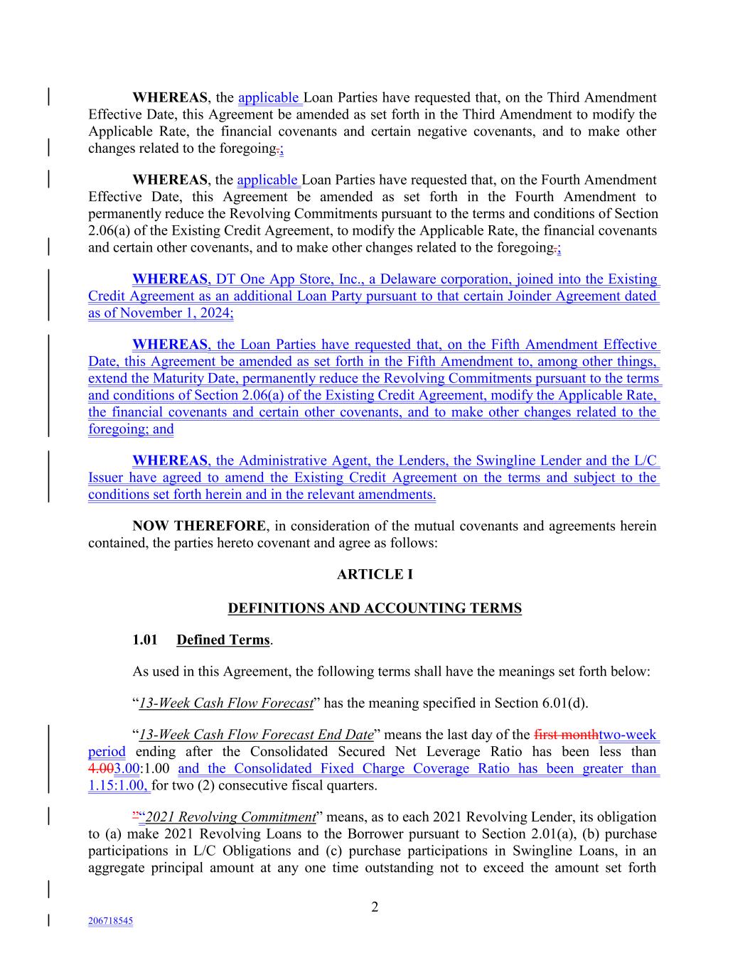 WHEREAS, the applicable Loan Parties have requested that, on the Third Amendment Effective Date, this Agreement be amended as set forth in the Third Amendment to modify the Applicable Rate, the financial covenants and certain negative covenants, and to make other changes related to the foregoing.; WHEREAS, the applicable Loan Parties have requested that, on the Fourth Amendment Effective Date, this Agreement be amended as set forth in the Fourth Amendment to permanently reduce the Revolving Commitments pursuant to the terms and conditions of Section 2.06(a) of the Existing Credit Agreement, to modify the Applicable Rate, the financial covenants and certain other covenants, and to make other changes related to the foregoing.; WHEREAS, DT One App Store, Inc., a Delaware corporation, joined into the Existing Credit Agreement as an additional Loan Party pursuant to that certain Joinder Agreement dated as of November 1, 2024; WHEREAS, the Loan Parties have requested that, on the Fifth Amendment Effective Date, this Agreement be amended as set forth in the Fifth Amendment to, among other things, extend the Maturity Date, permanently reduce the Revolving Commitments pursuant to the terms and conditions of Section 2.06(a) of the Existing Credit Agreement, modify the Applicable Rate, the financial covenants and certain other covenants, and to make other changes related to the foregoing; and WHEREAS, the Administrative Agent, the Lenders, the Swingline Lender and the L/C Issuer have agreed to amend the Existing Credit Agreement on the terms and subject to the conditions set forth herein and in the relevant amendments. NOW THEREFORE, in consideration of the mutual covenants and agreements herein contained, the parties hereto covenant and agree as follows: ARTICLE I DEFINITIONS AND ACCOUNTING TERMS 1.01 Defined Terms. As used in this Agreement, the following terms shall have the meanings set forth below: “13-Week Cash Flow Forecast” has the meaning specified in Section 6.01(d). “13-Week Cash Flow Forecast End Date” means the last day of the first monthtwo-week period ending after the Consolidated Secured Net Leverage Ratio has been less than 4.003.00:1.00 and the Consolidated Fixed Charge Coverage Ratio has been greater than 1.15:1.00, for two (2) consecutive fiscal quarters. ”“2021 Revolving Commitment” means, as to each 2021 Revolving Lender, its obligation to (a) make 2021 Revolving Loans to the Borrower pursuant to Section 2.01(a), (b) purchase participations in L/C Obligations and (c) purchase participations in Swingline Loans, in an aggregate principal amount at any one time outstanding not to exceed the amount set forth 2 206718545