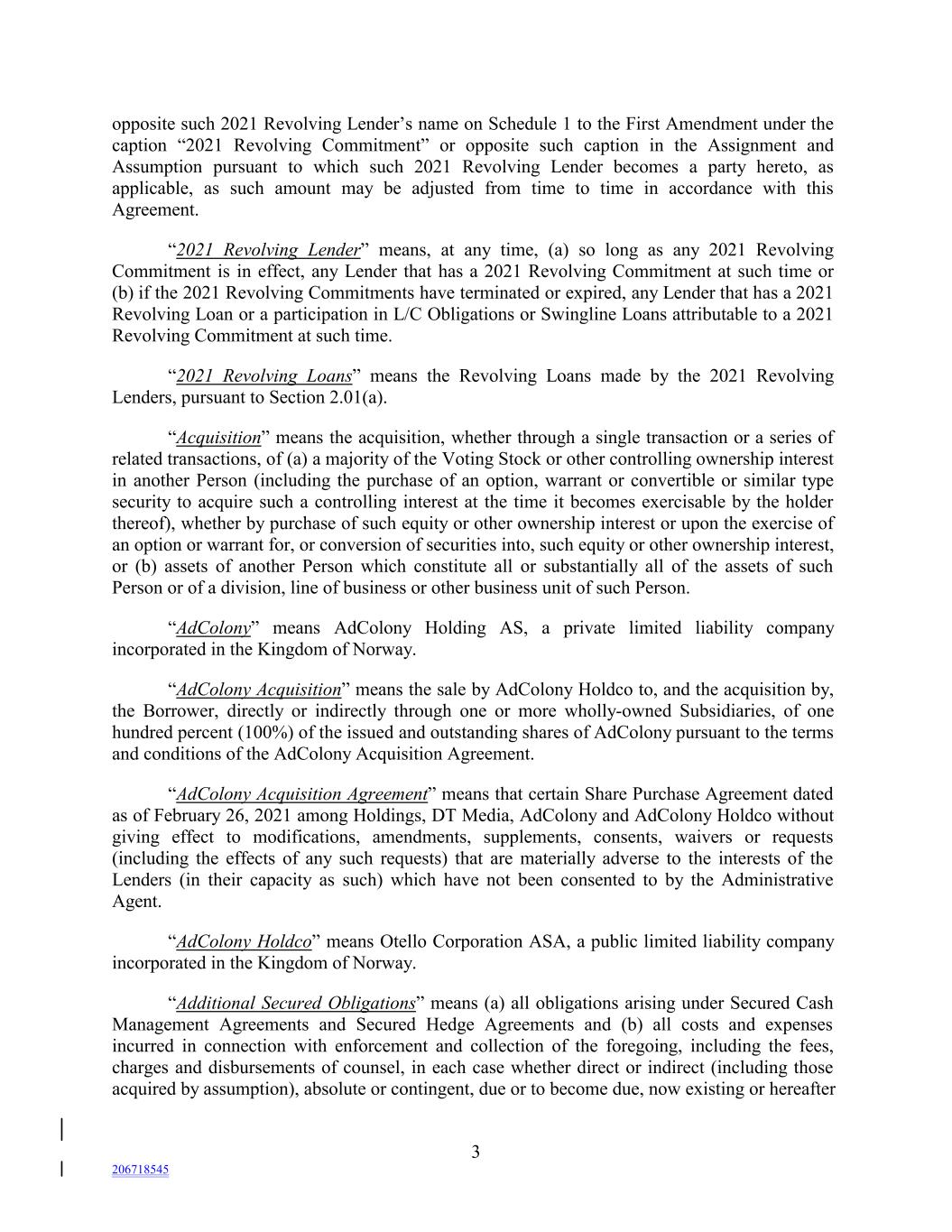 opposite such 2021 Revolving Lender’s name on Schedule 1 to the First Amendment under the caption “2021 Revolving Commitment” or opposite such caption in the Assignment and Assumption pursuant to which such 2021 Revolving Lender becomes a party hereto, as applicable, as such amount may be adjusted from time to time in accordance with this Agreement. “2021 Revolving Lender” means, at any time, (a) so long as any 2021 Revolving Commitment is in effect, any Lender that has a 2021 Revolving Commitment at such time or (b) if the 2021 Revolving Commitments have terminated or expired, any Lender that has a 2021 Revolving Loan or a participation in L/C Obligations or Swingline Loans attributable to a 2021 Revolving Commitment at such time. “2021 Revolving Loans” means the Revolving Loans made by the 2021 Revolving Lenders, pursuant to Section 2.01(a). “Acquisition” means the acquisition, whether through a single transaction or a series of related transactions, of (a) a majority of the Voting Stock or other controlling ownership interest in another Person (including the purchase of an option, warrant or convertible or similar type security to acquire such a controlling interest at the time it becomes exercisable by the holder thereof), whether by purchase of such equity or other ownership interest or upon the exercise of an option or warrant for, or conversion of securities into, such equity or other ownership interest, or (b) assets of another Person which constitute all or substantially all of the assets of such Person or of a division, line of business or other business unit of such Person. “AdColony” means AdColony Holding AS, a private limited liability company incorporated in the Kingdom of Norway. “AdColony Acquisition” means the sale by AdColony Holdco to, and the acquisition by, the Borrower, directly or indirectly through one or more wholly-owned Subsidiaries, of one hundred percent (100%) of the issued and outstanding shares of AdColony pursuant to the terms and conditions of the AdColony Acquisition Agreement. “AdColony Acquisition Agreement” means that certain Share Purchase Agreement dated as of February 26, 2021 among Holdings, DT Media, AdColony and AdColony Holdco without giving effect to modifications, amendments, supplements, consents, waivers or requests (including the effects of any such requests) that are materially adverse to the interests of the Lenders (in their capacity as such) which have not been consented to by the Administrative Agent. “AdColony Holdco” means Otello Corporation ASA, a public limited liability company incorporated in the Kingdom of Norway. “Additional Secured Obligations” means (a) all obligations arising under Secured Cash Management Agreements and Secured Hedge Agreements and (b) all costs and expenses incurred in connection with enforcement and collection of the foregoing, including the fees, charges and disbursements of counsel, in each case whether direct or indirect (including those acquired by assumption), absolute or contingent, due or to become due, now existing or hereafter 3 206718545
