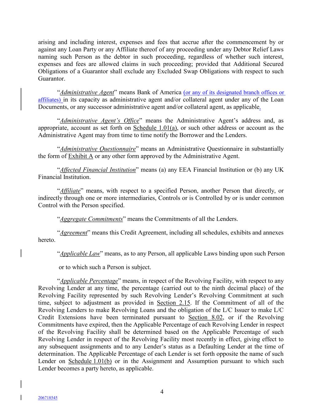 arising and including interest, expenses and fees that accrue after the commencement by or against any Loan Party or any Affiliate thereof of any proceeding under any Debtor Relief Laws naming such Person as the debtor in such proceeding, regardless of whether such interest, expenses and fees are allowed claims in such proceeding; provided that Additional Secured Obligations of a Guarantor shall exclude any Excluded Swap Obligations with respect to such Guarantor. “Administrative Agent” means Bank of America (or any of its designated branch offices or affiliates) in its capacity as administrative agent and/or collateral agent under any of the Loan Documents, or any successor administrative agent and/or collateral agent, as applicable. “Administrative Agent’s Office” means the Administrative Agent’s address and, as appropriate, account as set forth on Schedule 1.01(a), or such other address or account as the Administrative Agent may from time to time notify the Borrower and the Lenders. “Administrative Questionnaire” means an Administrative Questionnaire in substantially the form of Exhibit A or any other form approved by the Administrative Agent. “Affected Financial Institution” means (a) any EEA Financial Institution or (b) any UK Financial Institution. “Affiliate” means, with respect to a specified Person, another Person that directly, or indirectly through one or more intermediaries, Controls or is Controlled by or is under common Control with the Person specified. “Aggregate Commitments” means the Commitments of all the Lenders. “Agreement” means this Credit Agreement, including all schedules, exhibits and annexes hereto. “Applicable Law” means, as to any Person, all applicable Laws binding upon such Person or to which such a Person is subject. “Applicable Percentage” means, in respect of the Revolving Facility, with respect to any Revolving Lender at any time, the percentage (carried out to the ninth decimal place) of the Revolving Facility represented by such Revolving Lender’s Revolving Commitment at such time, subject to adjustment as provided in Section 2.15. If the Commitment of all of the Revolving Lenders to make Revolving Loans and the obligation of the L/C Issuer to make L/C Credit Extensions have been terminated pursuant to Section 8.02, or if the Revolving Commitments have expired, then the Applicable Percentage of each Revolving Lender in respect of the Revolving Facility shall be determined based on the Applicable Percentage of such Revolving Lender in respect of the Revolving Facility most recently in effect, giving effect to any subsequent assignments and to any Lender’s status as a Defaulting Lender at the time of determination. The Applicable Percentage of each Lender is set forth opposite the name of such Lender on Schedule 1.01(b) or in the Assignment and Assumption pursuant to which such Lender becomes a party hereto, as applicable. 4 206718545