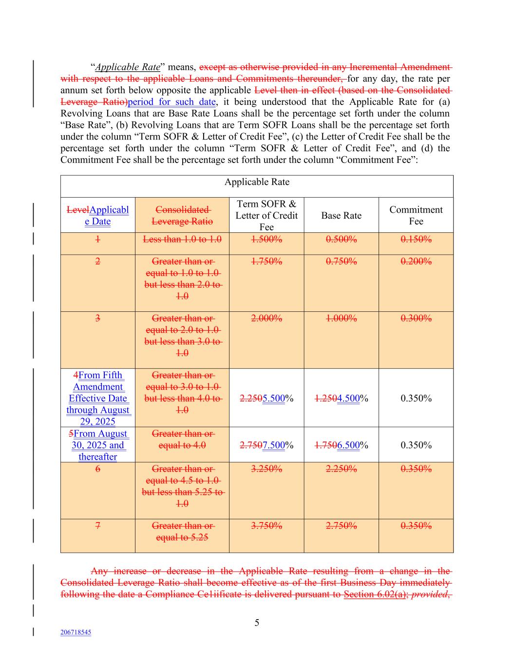 5 206718545 1.000% 0.300% 1.500% Consolidated Leverage Ratio 4From Fifth Amendment Effective Date through August 29, 2025 0.500% Greater than or equal to 3.0 to 1.0 but less than 4.0 to 1.0 2.2505.500% 0.150% 1.2504.500% Term SOFR & Letter of Credit Fee 0.350% Applicable Rate 5From August 30, 2025 and thereafter 2 Greater than or equal to 4.0 Base Rate 2.7507.500% Greater than or equal to 1.0 to 1.0 but less than 2.0 to 1.0 1.7506.500% 0.350% 1.750% Commitment Fee 6 0.750% Greater than or equal to 4.5 to 1.0 but less than 5.25 to 1.0 3.250% 0.200% 2.250% 0.350% “Applicable Rate” means, except as otherwise provided in any Incremental Amendment with respect to the applicable Loans and Commitments thereunder, for any day, the rate per annum set forth below opposite the applicable Level then in effect (based on the Consolidated Leverage Ratio)period for such date, it being understood that the Applicable Rate for (a) Revolving Loans that are Base Rate Loans shall be the percentage set forth under the column “Base Rate”, (b) Revolving Loans that are Term SOFR Loans shall be the percentage set forth under the column “Term SOFR & Letter of Credit Fee”, (c) the Letter of Credit Fee shall be the percentage set forth under the column “Term SOFR & Letter of Credit Fee”, and (d) the Commitment Fee shall be the percentage set forth under the column “Commitment Fee”: 7 3 Greater than or equal to 5.25 1 3.750% Greater than or equal to 2.0 to 1.0 but less than 3.0 to 1.0 2.750% LevelApplicabl e Date 0.350% 2.000% Any increase or decrease in the Applicable Rate resulting from a change in the Consolidated Leverage Ratio shall become effective as of the first Business Day immediately following the date a Compliance Ce1iificate is delivered pursuant to Section 6.02(a); provided, Less than 1.0 to 1.0